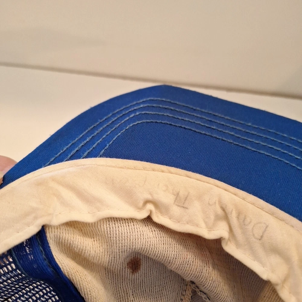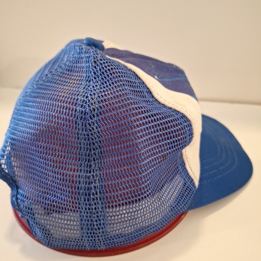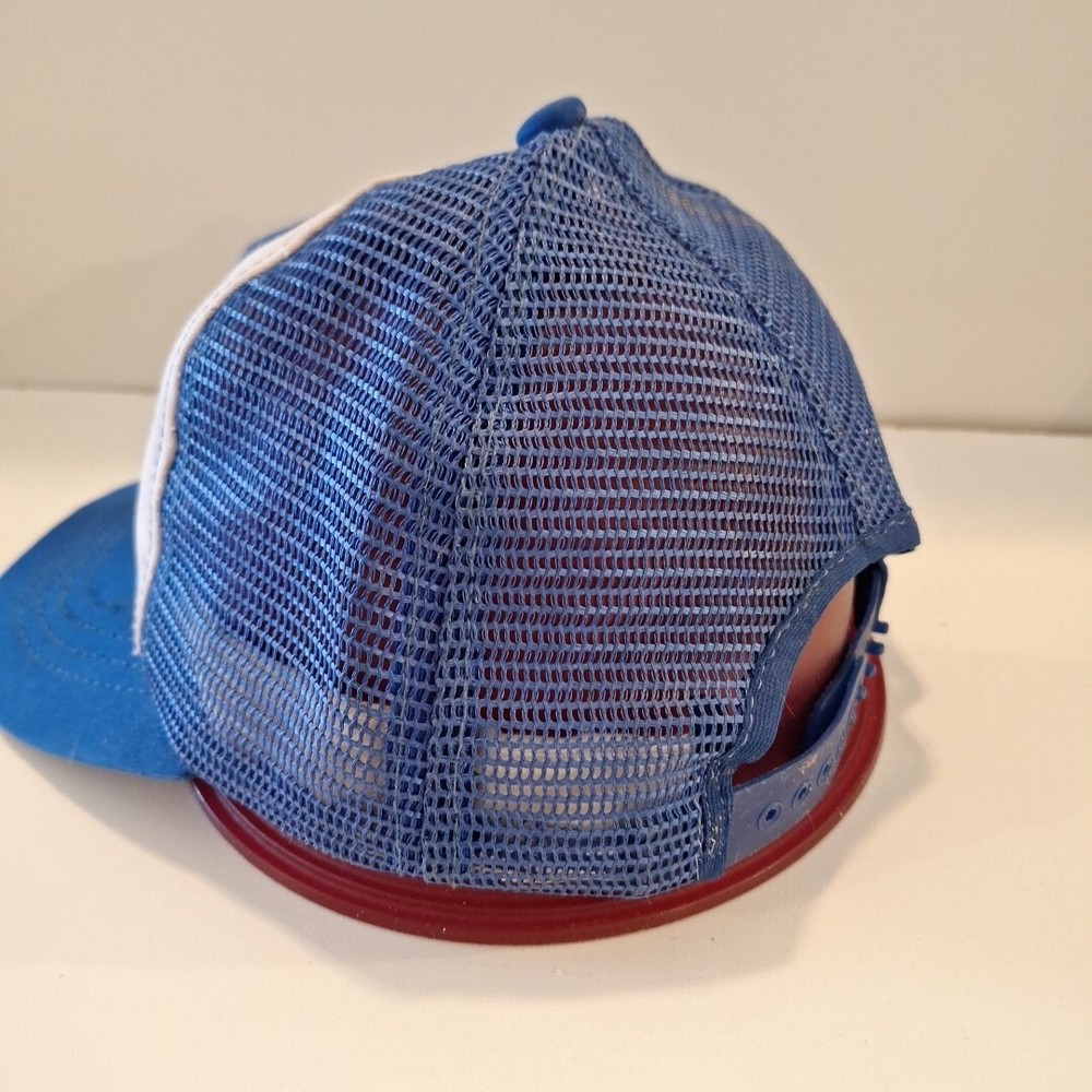 This youth hat was made in the US and is a vintage 80's hat. This has been worn and has some inside stains/yellowing which I did not attemp to clean because I'm not sure the best way to do. It will not with stand the washing machine, it would be a hand wash for sure. The coloring is bright. This hat has sat in a tote for many years and is a bit misshapen which you can see in the pictures. There's a bowl under it in the first pictures. The pictures show all the flaws, including the two creases on each side of the brim. The plastic adjustable strap is in good condition with no cracks. There is a faint name on the inside. This is an As Is listing. Please email me with any questions. Thanks for looking and happy shopping!