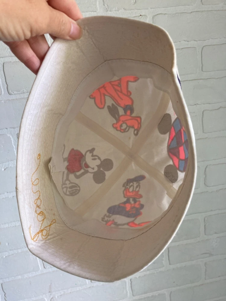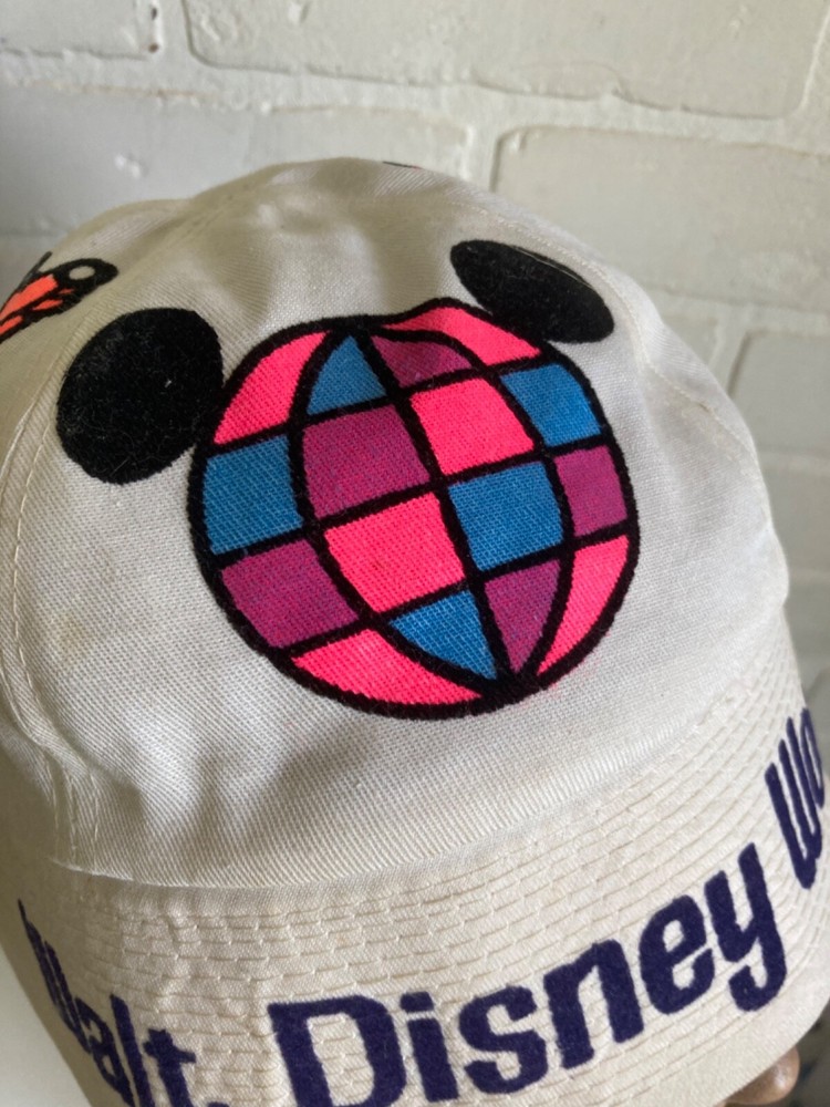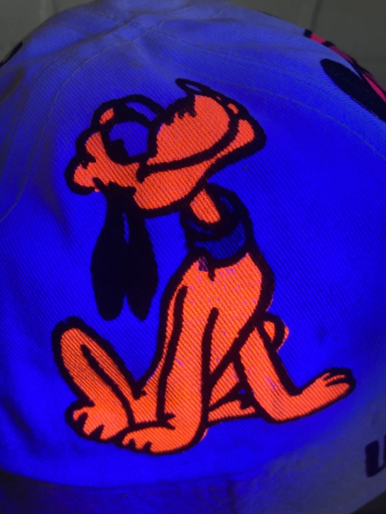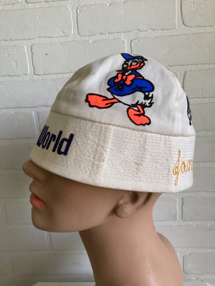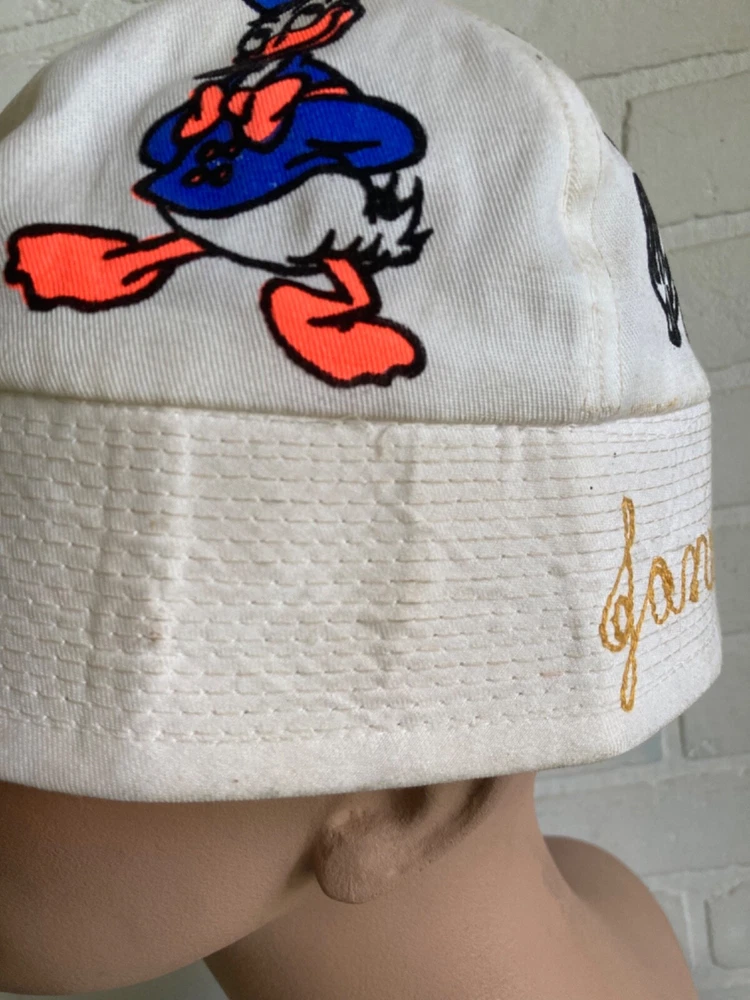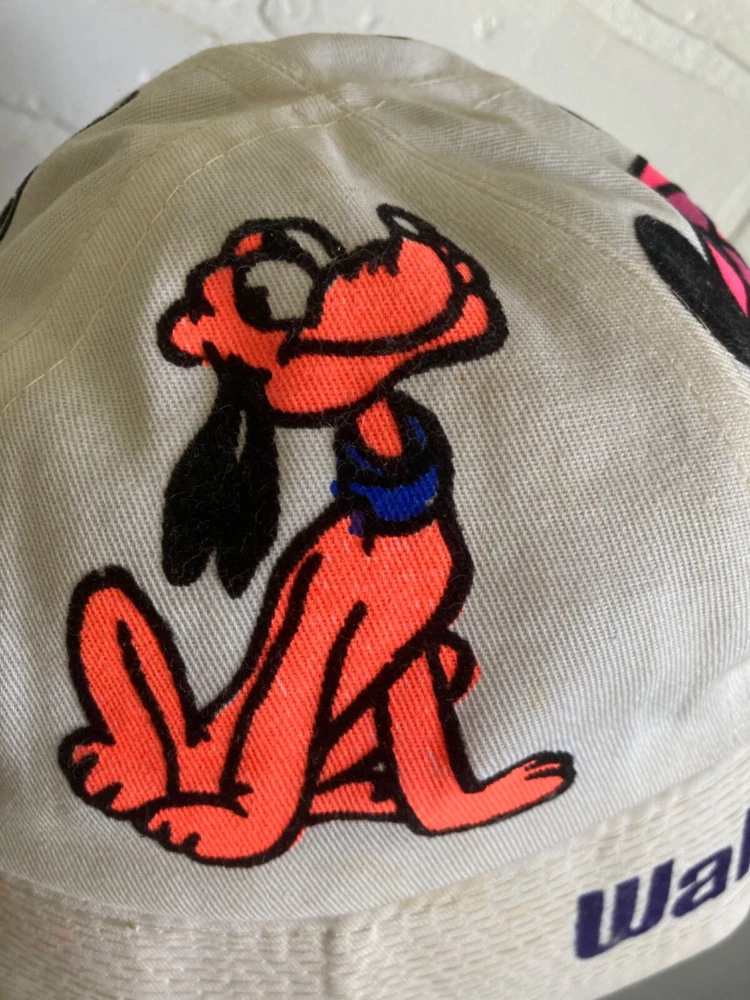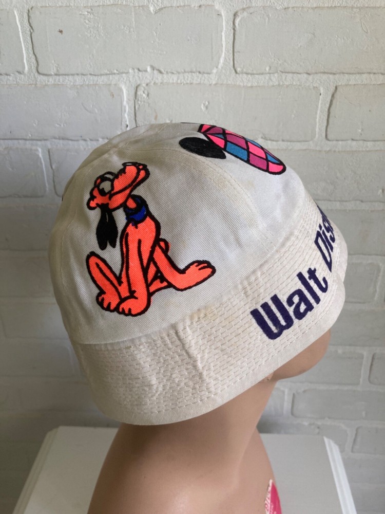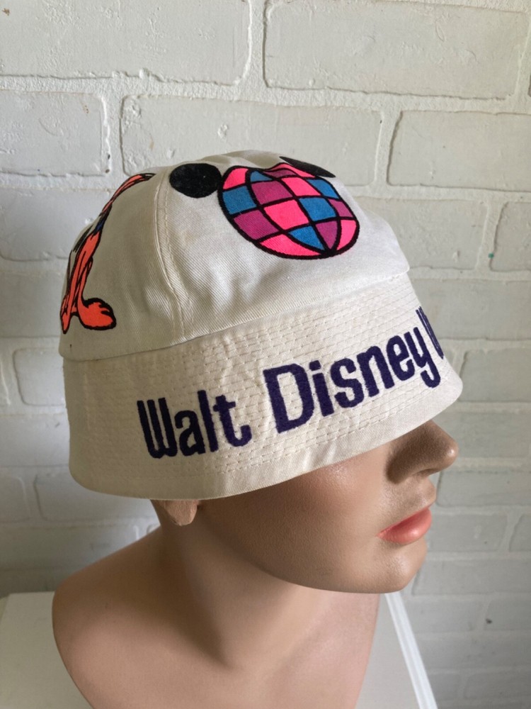 A fun vintage 70s 80s novelty hat from Walt Disney World. The colors on Pluto and Donald Duck are fluorescent and glow under a black light. This hat is 21” on inside brim. The name “Jane” is embroidered on the front. Estate find. Please email us with any questions and please check our Ebay store, Hooked-On-Vintage, for more great vintage items. We combine ship :-)