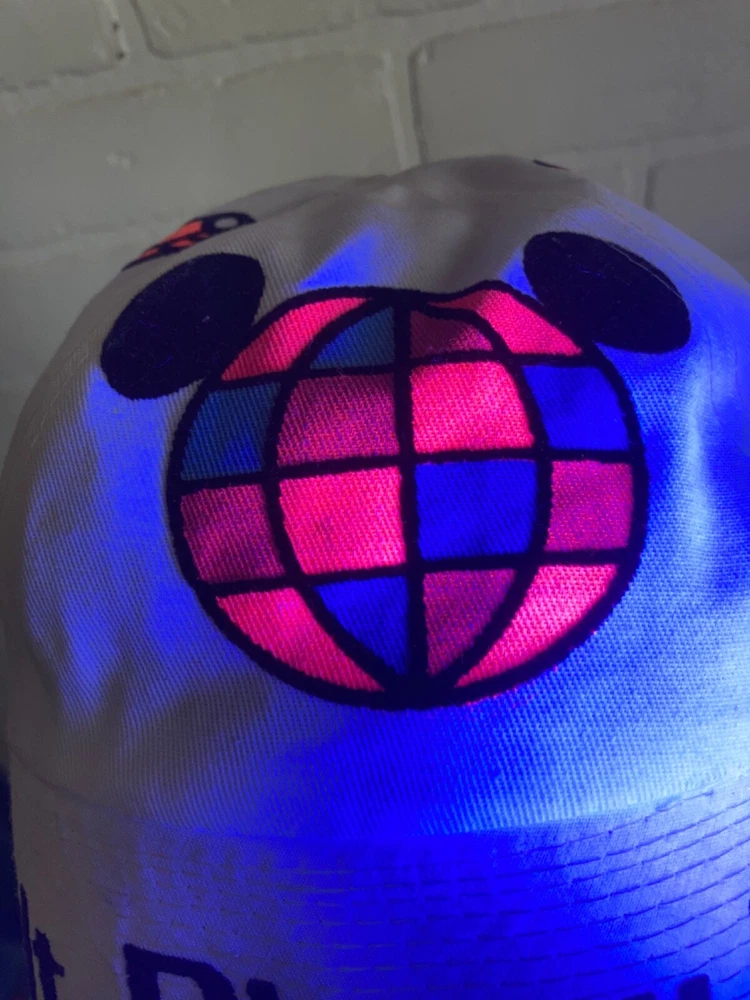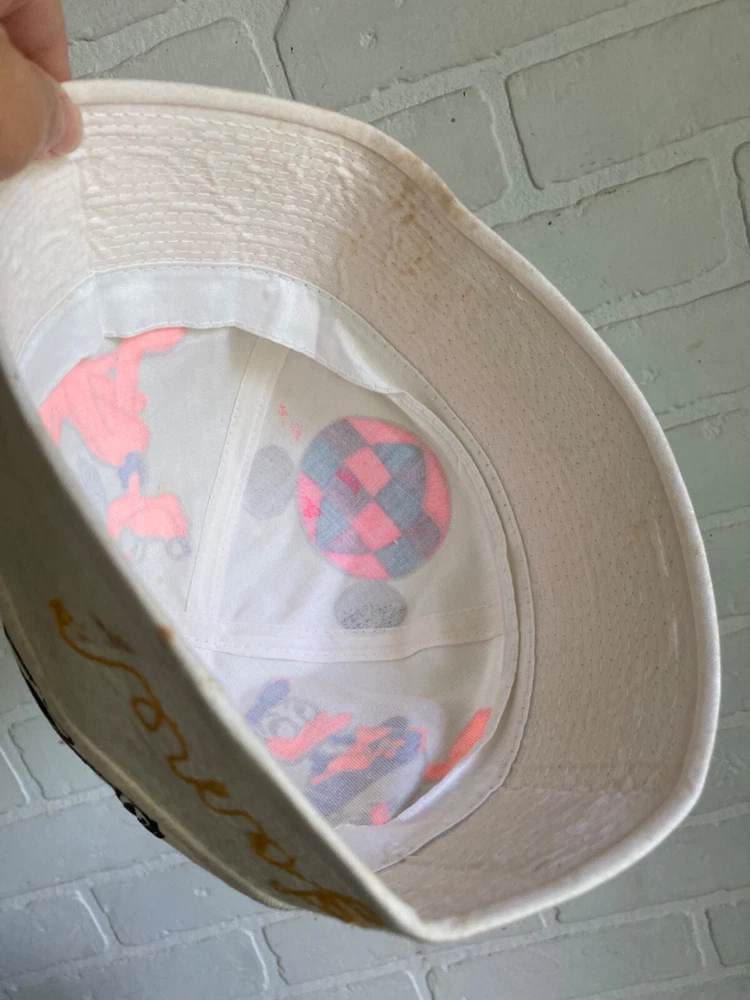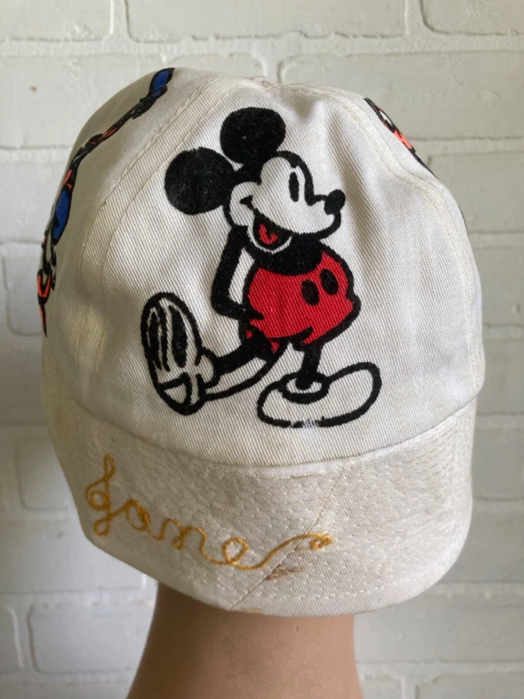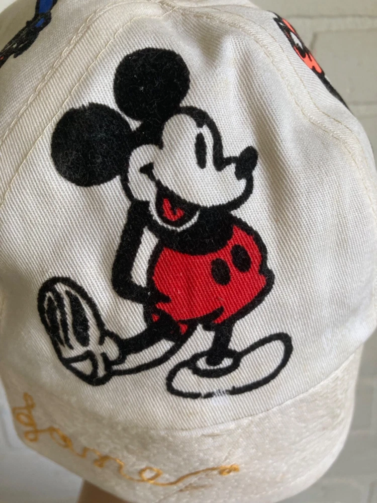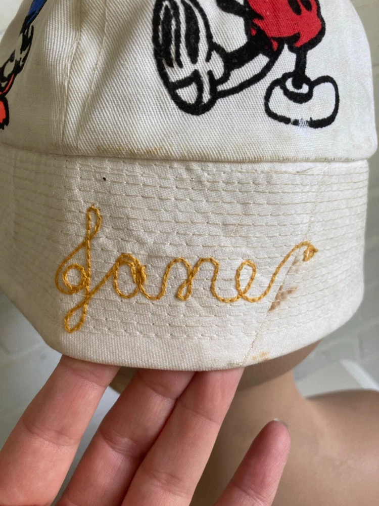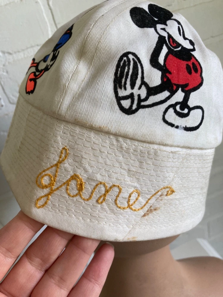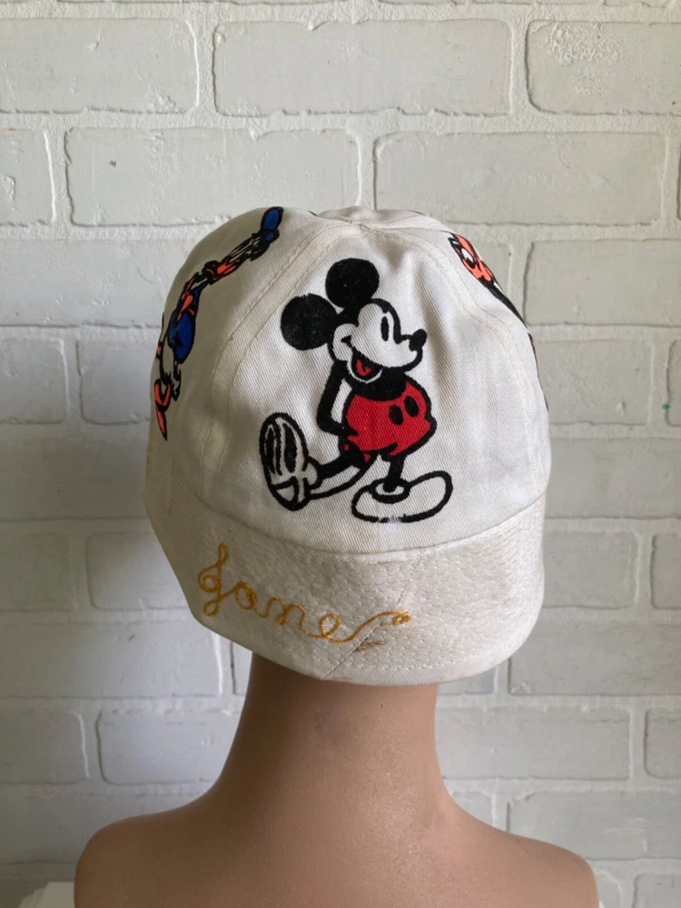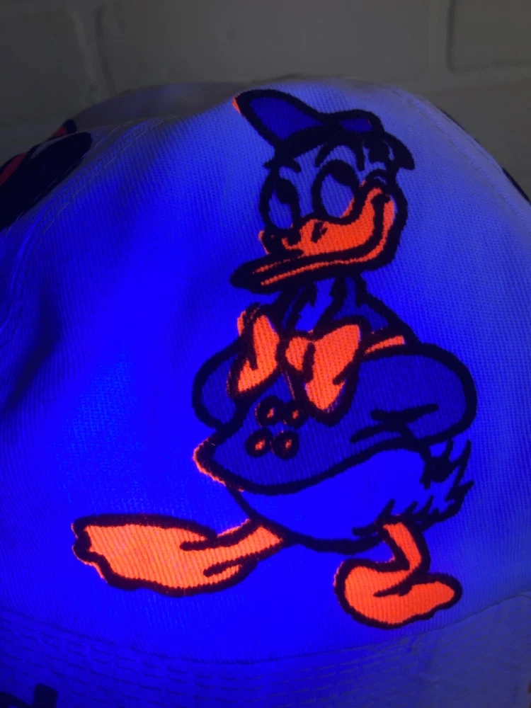 A fun vintage 70s 80s novelty hat from Walt Disney World. The colors on Pluto and Donald Duck are fluorescent and glow under a black light. This hat is 21” on inside brim. The name “Jane” is embroidered on the front. Estate find. Please email us with any questions and please check our Ebay store, Hooked-On-Vintage, for more great vintage items. We combine ship :-)