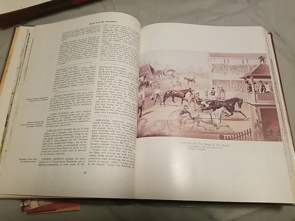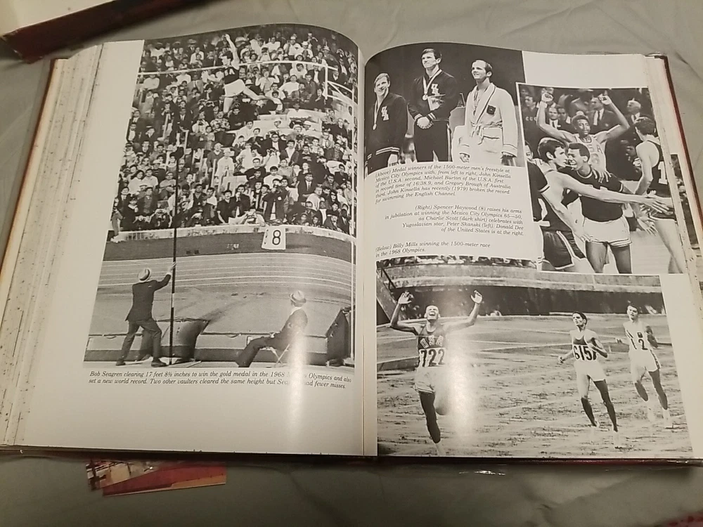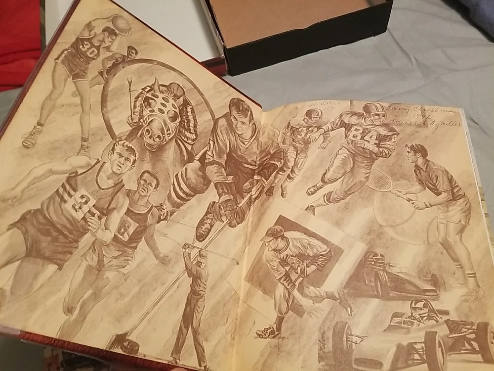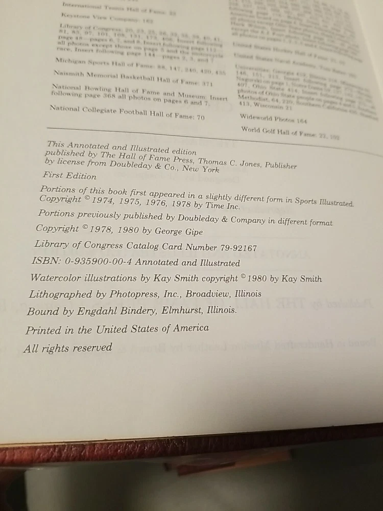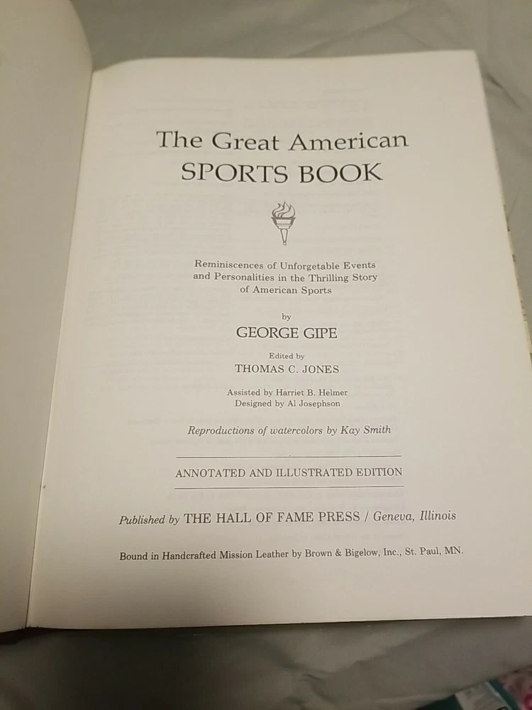 The Great American Sports Book by George Gipe Published 1980 Leather Edition- Illustrated ISBN: 0935900004 Like-new, excellent condition. Inscribed on inside cover with "To Ollie, Merry Christmas 1982, Doris + Whitey Miller" Bound in Handcrafted Mission Leather by Brown & Bigelow, Inc., St. Paul, MN Leather binding has clear plastic covering over it which was added to help protect leather (can be removed). Free shipping via USPS.
