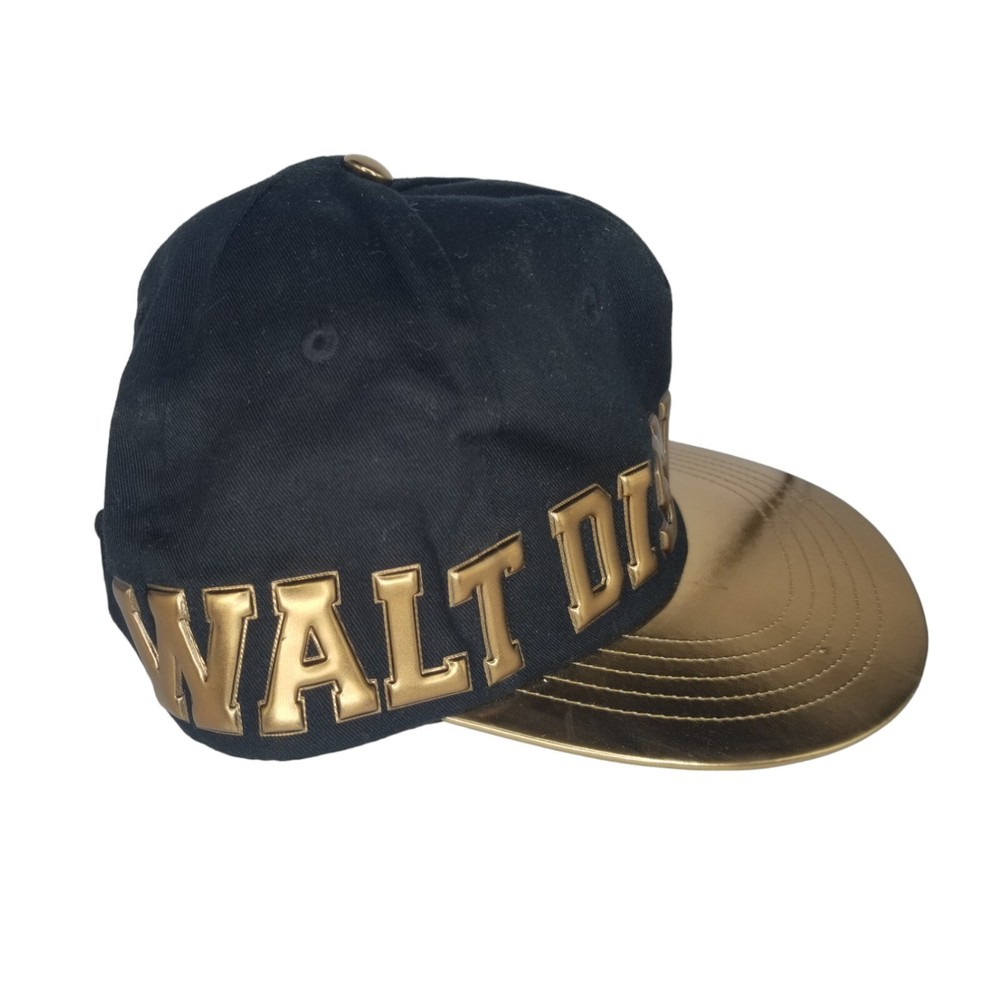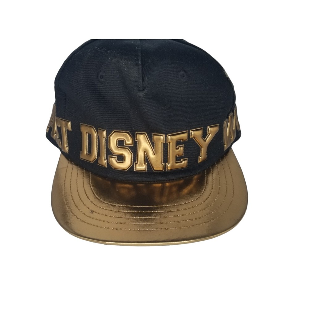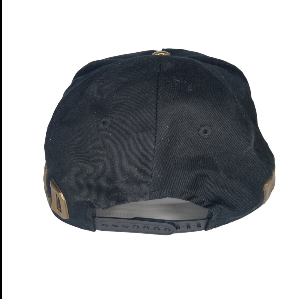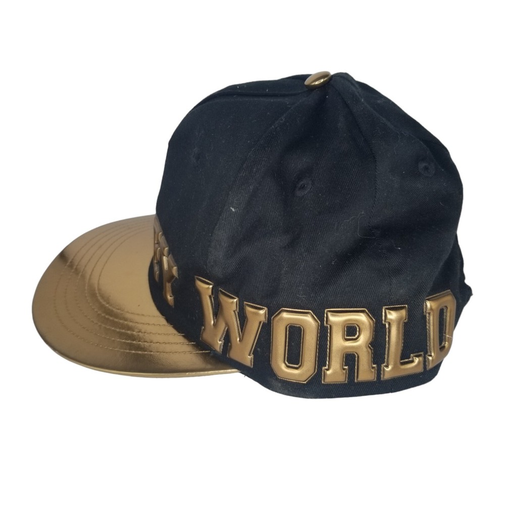 Black hat with raised gold lettering, flat bill...
