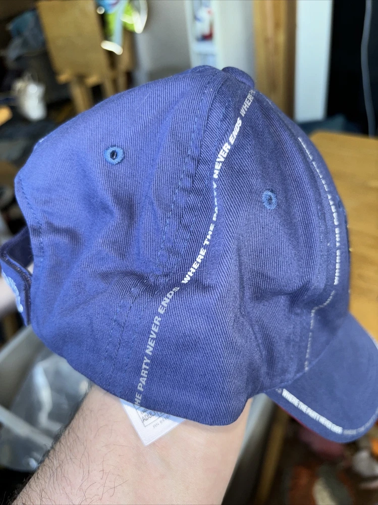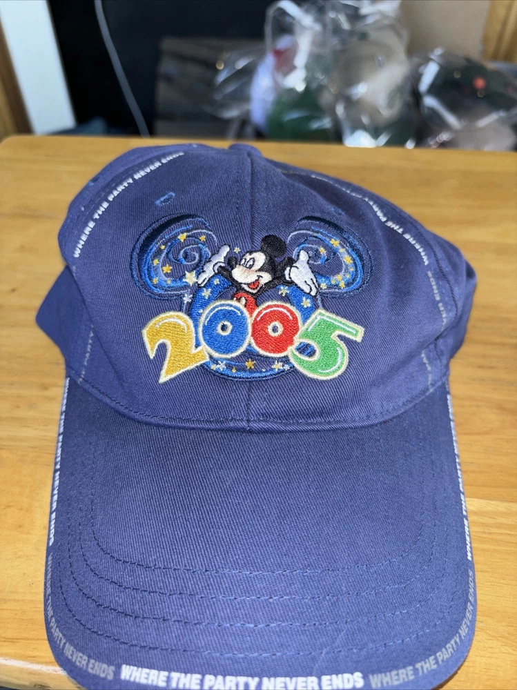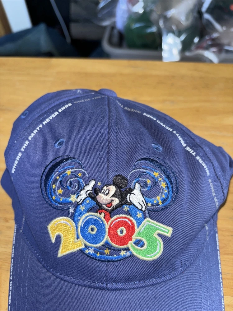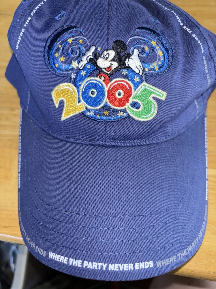 WALT DISNEY WORLD BASEBALL CAP MICKEY 2005 WHERE THE PARTY NEVER ENDS BLUE Hat. Condition is Used. Shipped with USPS Ground Advantage.