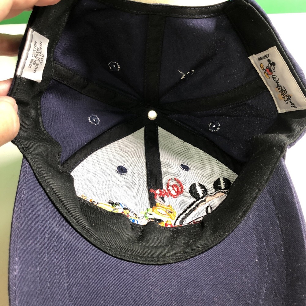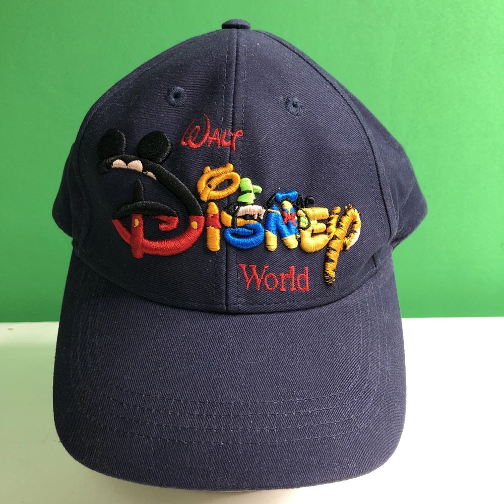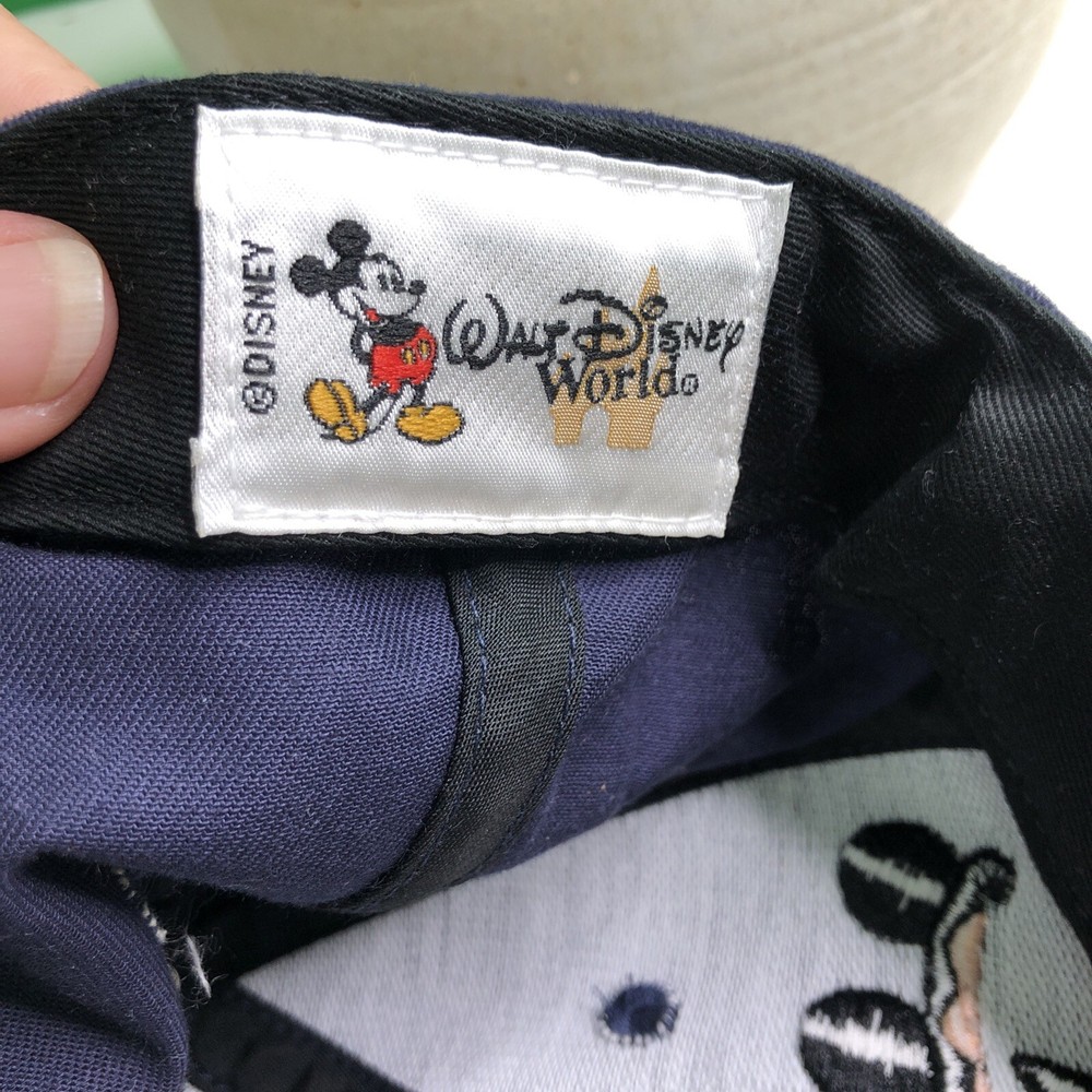 This navy blue cap features an embroidered design of characters that spell Walt DISNEY World. The cap is a snap back adjustable style, perfect for adults who want to show off their love for Disney. The brand is Disney and the cap is a great addition to any Disneyana collection. The cap is suitable for contemporary use, as it is a modern design that will never go out of style. The color navy blue is vibrant and eye-catching, making it a great accessory for any outfit.