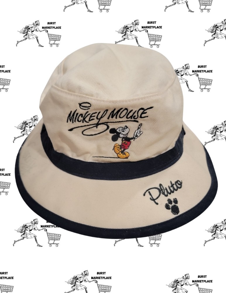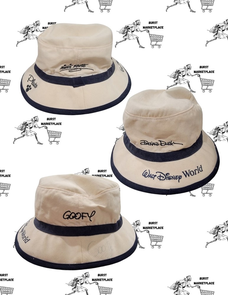 Capture the magic of Disney with this vintage Walt Disney World bucket hat, a charming addition to any Disney enthusiast's collection. Adorned with intricate embroidery featuring the beloved characters Mickey, Goofy, and Pluto, this hat is a testament to the timeless appeal of the Disney franchise. The white fabric provides a classic look that pairs well with any outfit, making it perfect for both casual wear and special occasions. Crafted in Taiwan, this hat is designed for adults and showcases the quality and attention to detail that are synonymous with the Disney brand. It's a versatile collectible that blends with both contemporary and vintage Disney memorabilia. Whether it's for personal use or as a unique gift, this embroidered bucket hat is sure to delight fans of all ages. Signed by Goofy at park