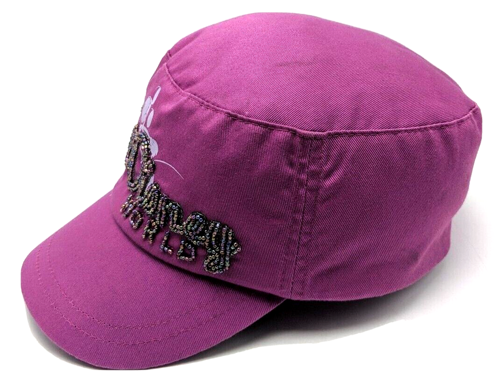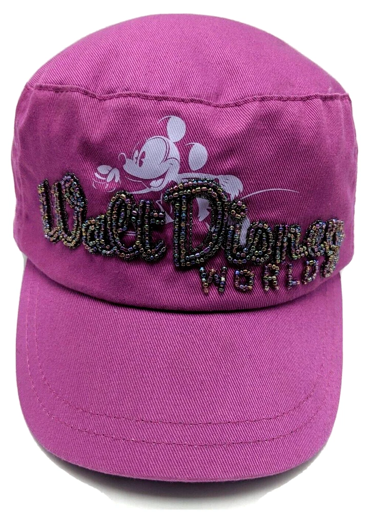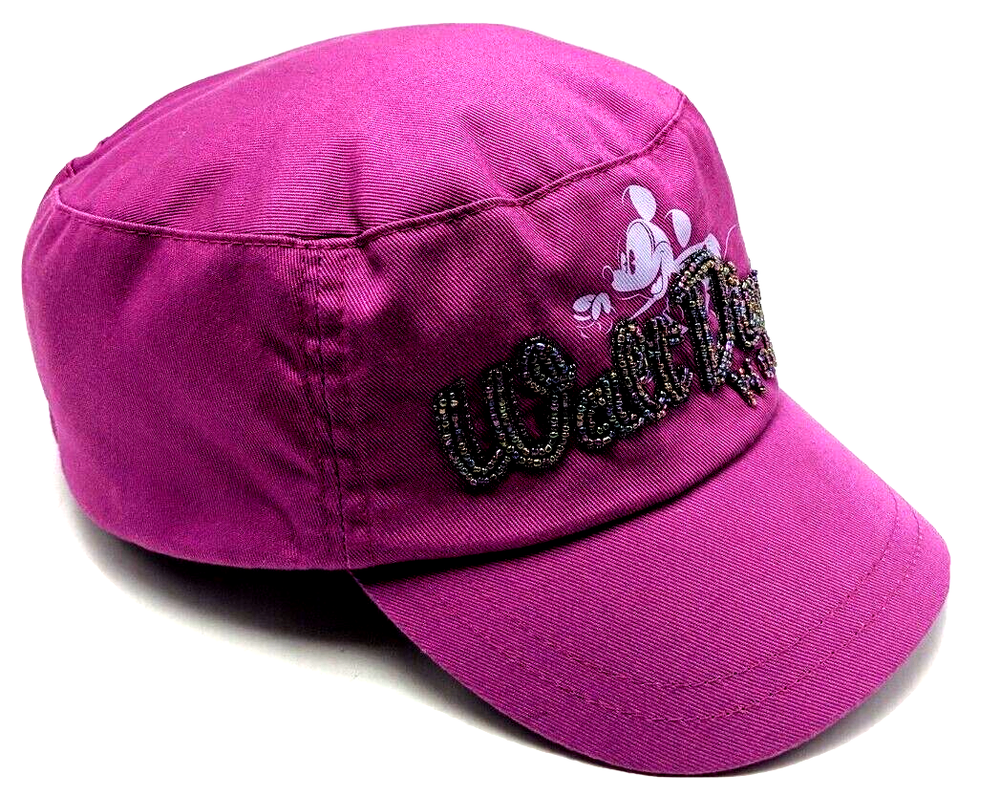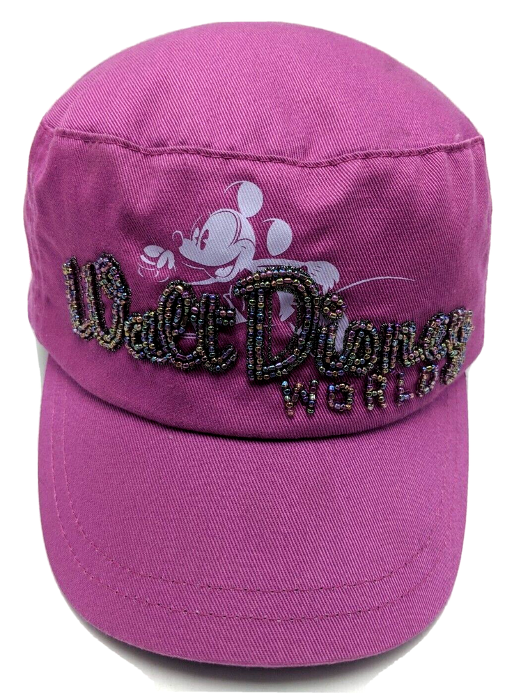 This is a WALT DISNEY WORLD 3-panel cadet army style pink adjustable hat / cap featuring Mickey Mouse Features: - "Walt Disney WORLD" in beads on front - Slightly curved brim - 100% cotton - Adjustable strap fits most heads Condition notes: Good overall condition. Clean inside and out. Washed and ready to wear. Please see the photos for more details. I pack carefully and ship quickly. Have any questions? Please ask.