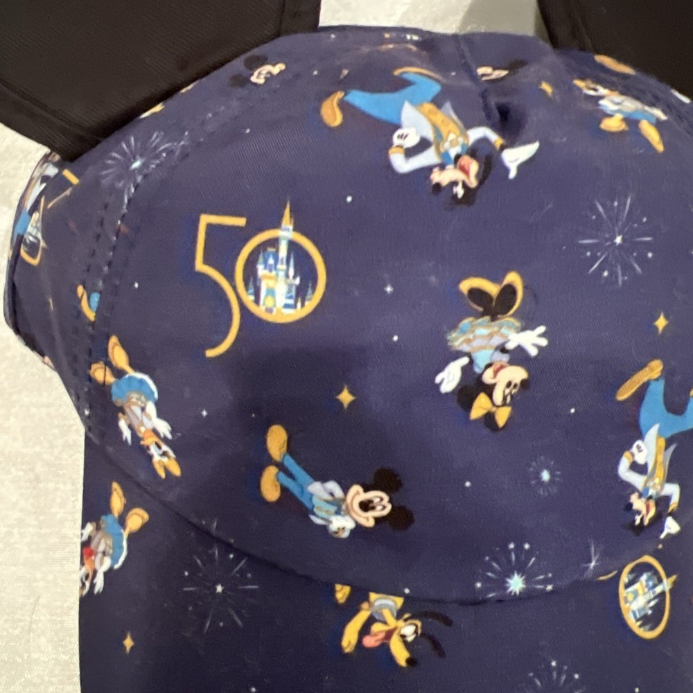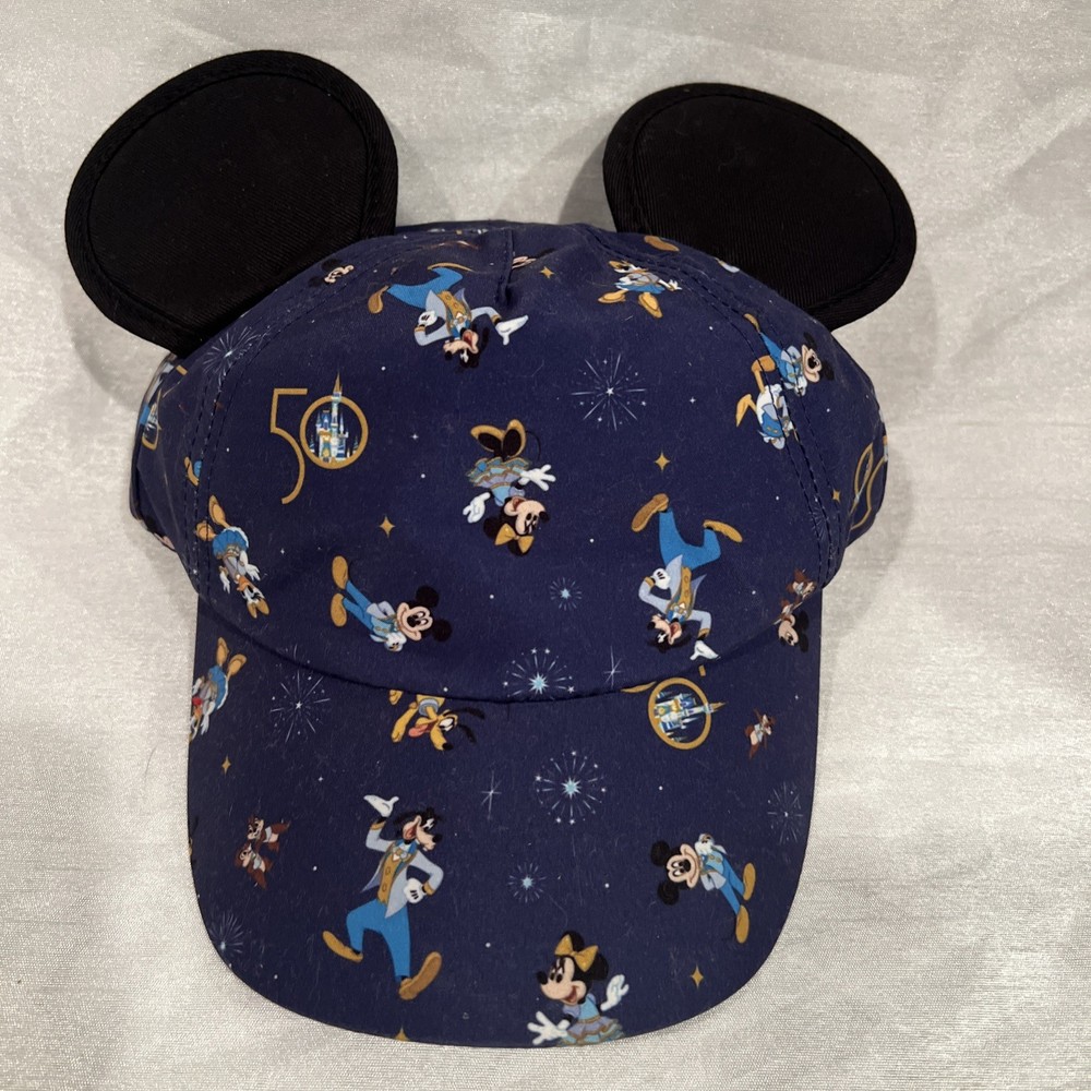 The WDW Disney Park 50th Anniversary Mickey Ears Baseball Hat Cap in toddler size is a special commemorative item celebrating the 50th anniversary of Disney World. Featuring the iconic Mickey Mouse character and the official Disney brand, this blue hat is suitable for both boys and girls. Perfect for young fans of Disney, this hat is a must-have collectible for any Disneyana enthusiast.
