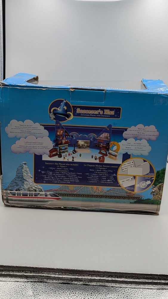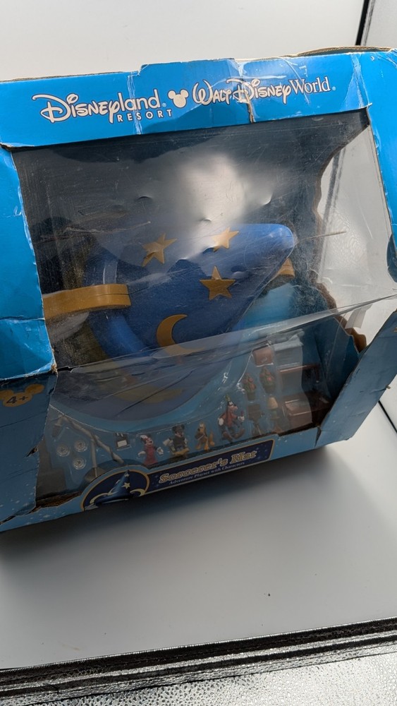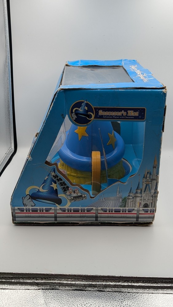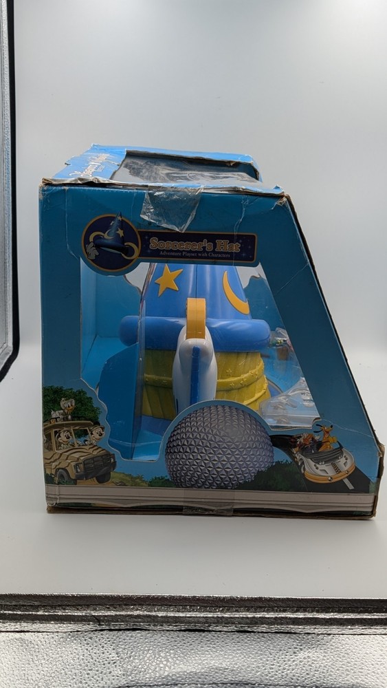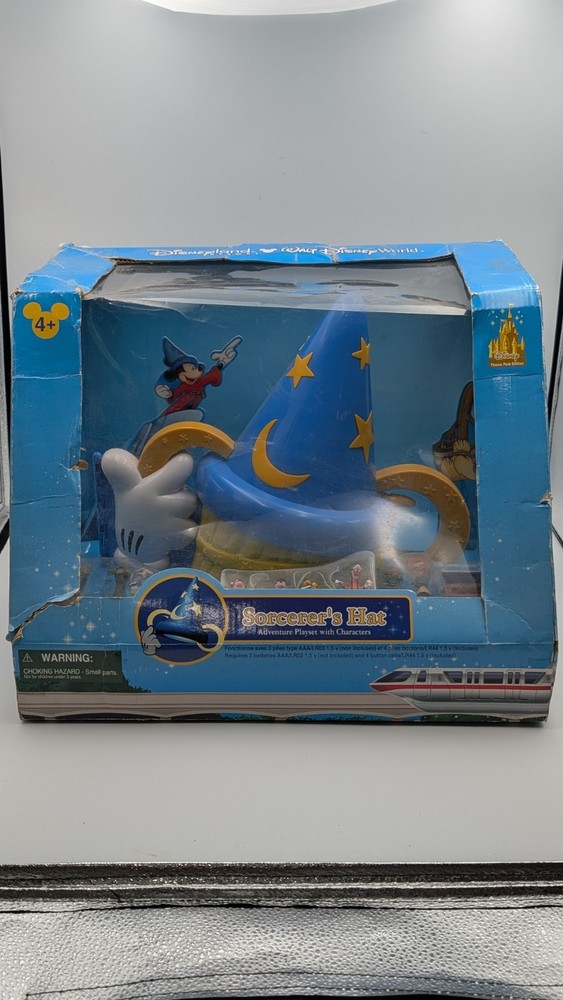 BOX IS DAMAGED. CONTENTS IN PERFECT CONDITION. The WDW Disney Sorcerer's Hat Adventure Playset is a collectible theme park souvenir inspired by the iconic Sorcerer's Hat from Walt Disney World. This officially licensed Disney product allows fans to recreate their favorite magical moments from the theme park in the comfort of their own home. With authentic sounds and a whimsical design, this playset brings the enchantment of Disney to life for collectors and fans alike. Made in China, this item is a must-have for any Disney enthusiast looking to add a touch of magic to their collection.