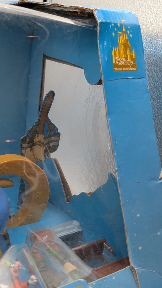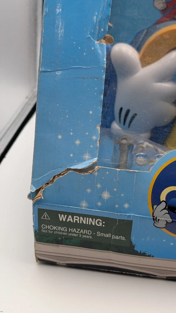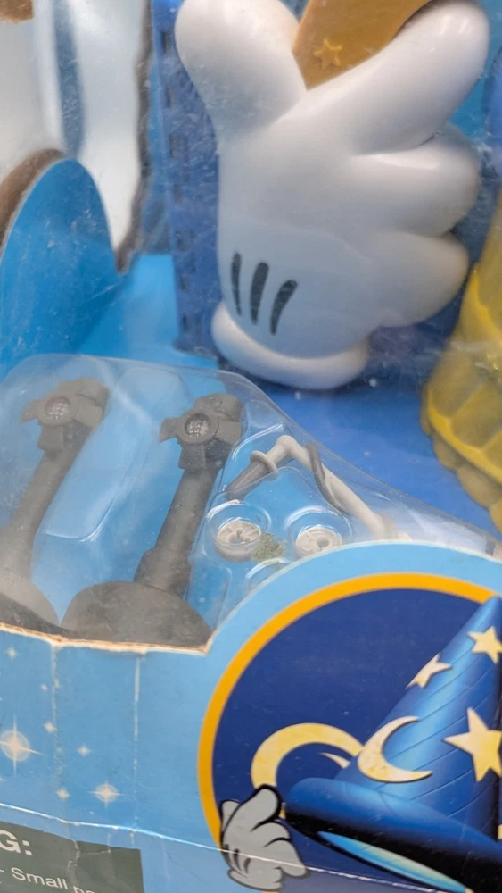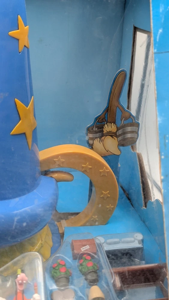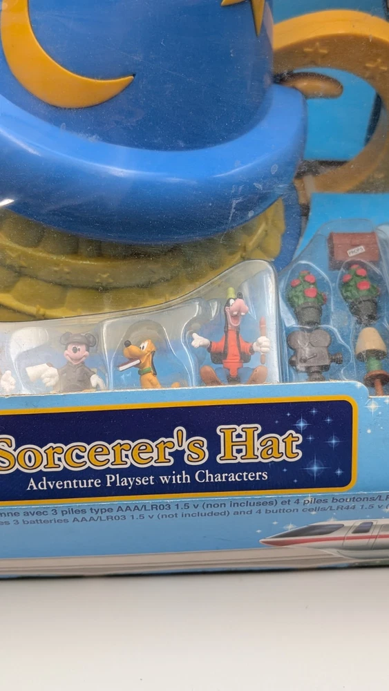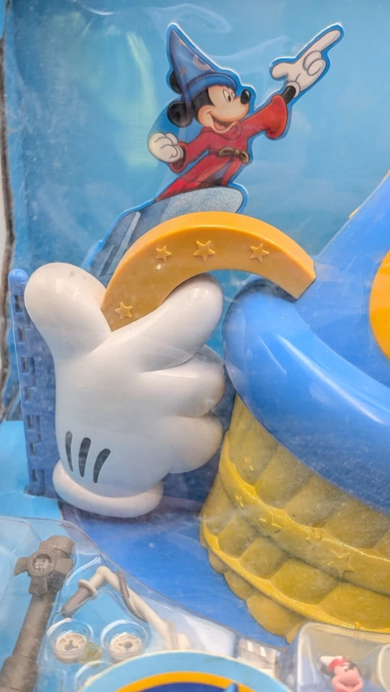 BOX IS DAMAGED. CONTENTS IN PERFECT CONDITION. The WDW Disney Sorcerer's Hat Adventure Playset is a collectible theme park souvenir inspired by the iconic Sorcerer's Hat from Walt Disney World. This officially licensed Disney product allows fans to recreate their favorite magical moments from the theme park in the comfort of their own home. With authentic sounds and a whimsical design, this playset brings the enchantment of Disney to life for collectors and fans alike. Made in China, this item is a must-have for any Disney enthusiast looking to add a touch of magic to their collection.
