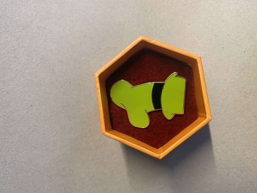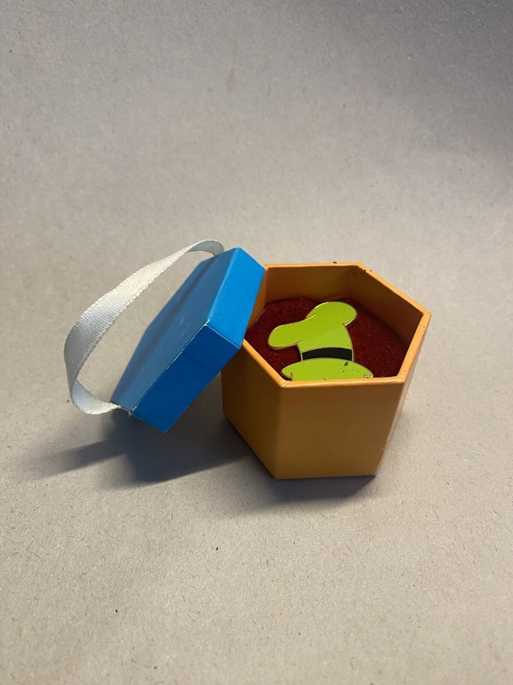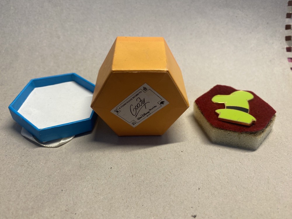 This is one of a Cast Exclusive Pins release at WDW to Cast Members. Each box has a ribbon handle and a label on the bottom of each box that reads..."If found, please return to <Name of Character>. Walt Disney World, with the Character's signature. This is Goofy's lime green w/black strap Hat. It comes in a round in an orange and blue octangle box with black foam that the hat sits on.