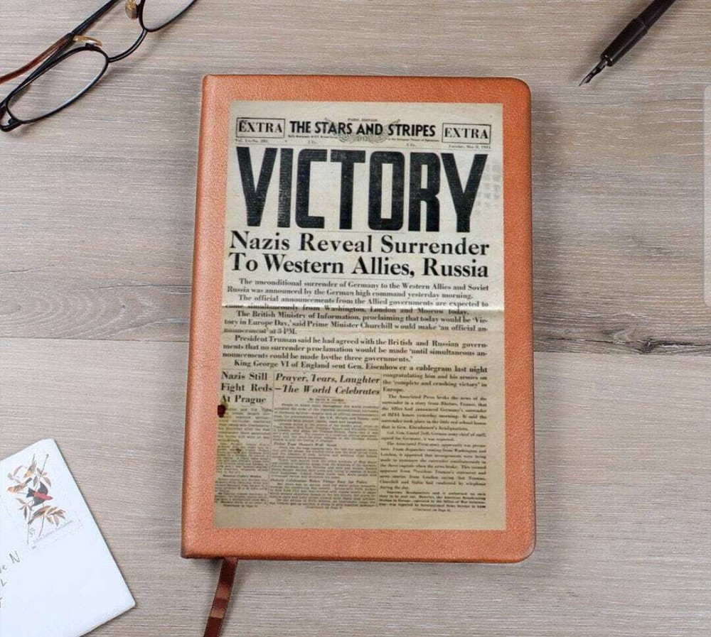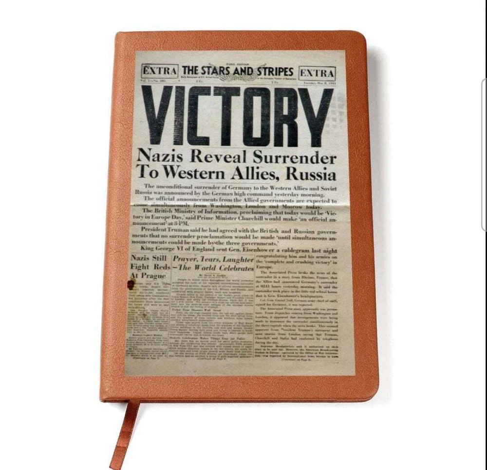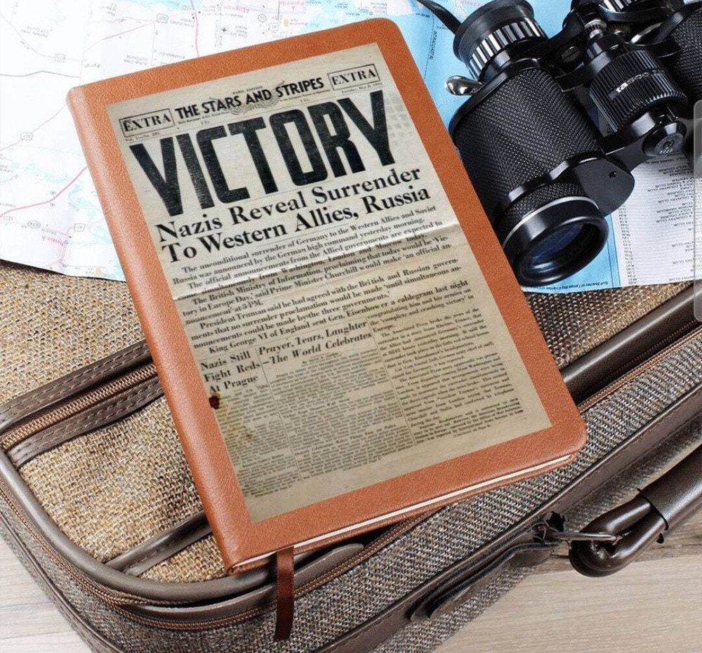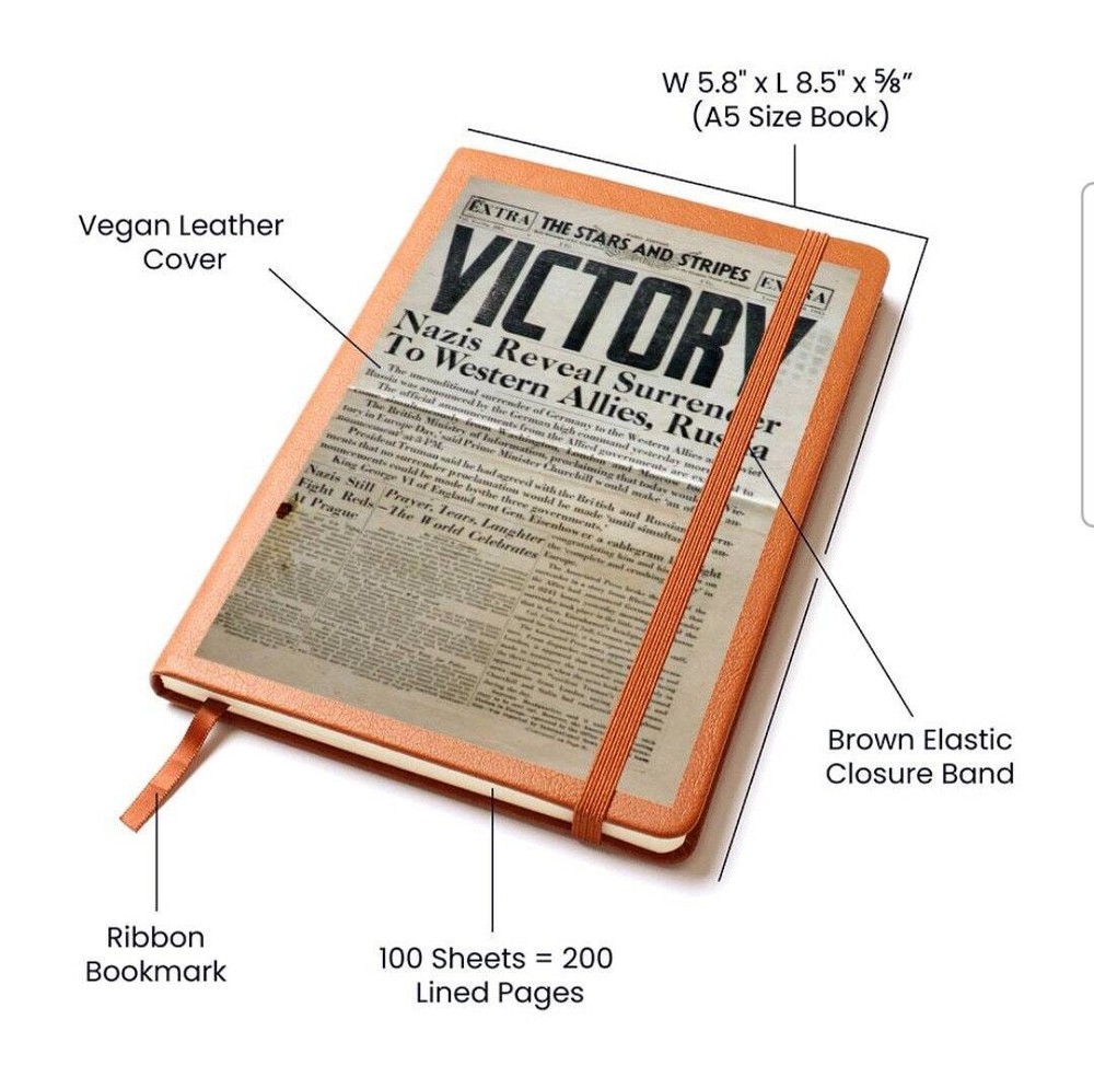 Unlock the charm of history with our exquisite Antique Leather Journal, a timeless treasure designed for the discerning writer who appreciates the fusion of history and elegance. This isn't just a journal—it's a conversation piece, a fragment of the past, and a tribute to the triumph of good over evil. 📜 **Vintage Historical Elegance** Step into the past with a cover that headlines a pivotal moment in history: the Nazi surrender to the Allies. Each glance at your journal is a reminder of the day the world heralded 'Victory' – an actual newspaper front cover from that significant day. 🔍 **Authentic Touch in Every Detail** Crafted with the highest quality leather, meant to age gracefully, our journal evokes the spirit and aesthetic of a bygone era, right down the feel of the cover that tells its own story. ✒️ **Preserve Your Thoughts with Character** Inside, find blank, cream-colored pages that invite your thoughts, dreams, and sketches. Whether you're jotting down ideas or chronicling your adventures, your words will be surrounded by the aura of history. 🌟 **A Statement of Style and History** This isn't merely a journal; it's a testament to the weight of history and the power of the written word. It makes for a thoughtful gift for history buffs, writers, and anyone who values the power of reflection. Make your mark in a piece of history with our Antique Leather Journal. Ideal for those who cherish the tactile sensation of leather and the emotional connection to history, it promises to be a journal that not only stores your entries but also inspires your creativity. You can own a piece of history through this historic reprint of a newspaper announcing the Victory in WWII! Printed on a high quality leather journal, it's perfect for any history lover or veteran! What better way to quiet your racing mind than with a clean slate? The Graphic Leather Journal is the perfect accessory for personal reminders, goal setting, or just getting organized. This vegan leather notebook allows you to write on the go thanks to its lightweight design. Plus, swapping between your important pages is easy thanks to the ribbon bookmark and elastic closure band. The unique front is professionally printed with vibrant colors - making your design last as long as your to-do list! Your journal will be custom made upon order and feature a professionally printed design. This present makes for a truly unique and sentimental gift that will be treasured! Product specifications: Vegan leather cover W 5.8" x L 8.5" x ⅝” (14.73cm x 21.59cm x 1.6cm) 100 sheets / 200 lined pages Brown elastic closure band Ribbon bookmark Weight: 11.33 ounce Each order is lovingly packaged and shipped with care Powered by ExportYourStore.com
