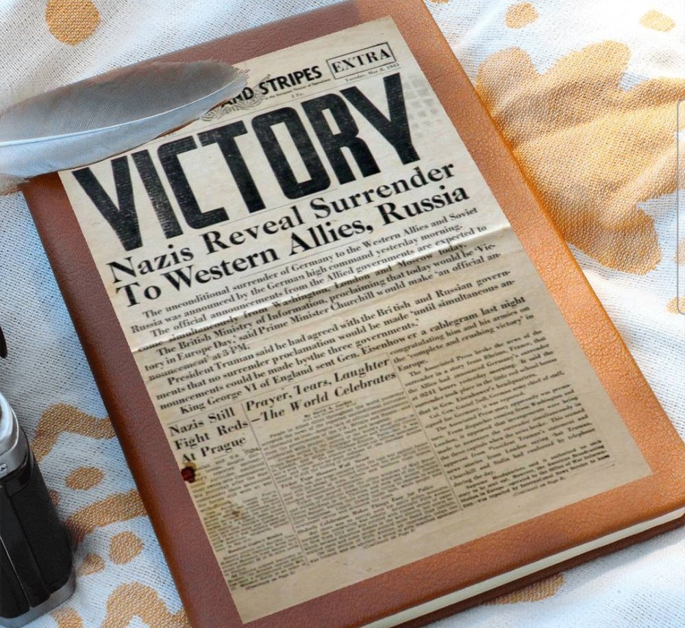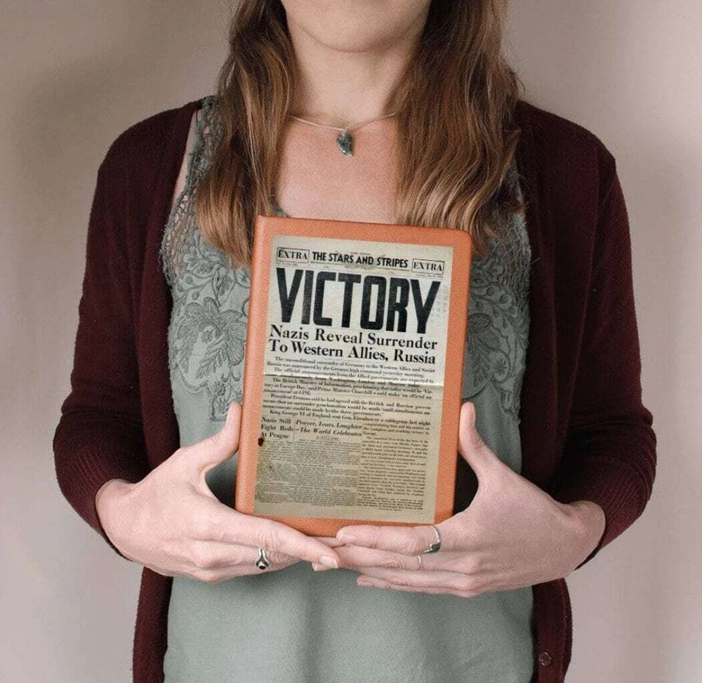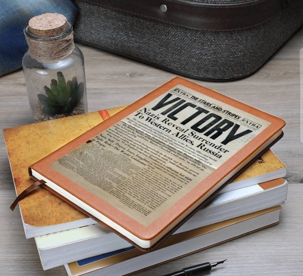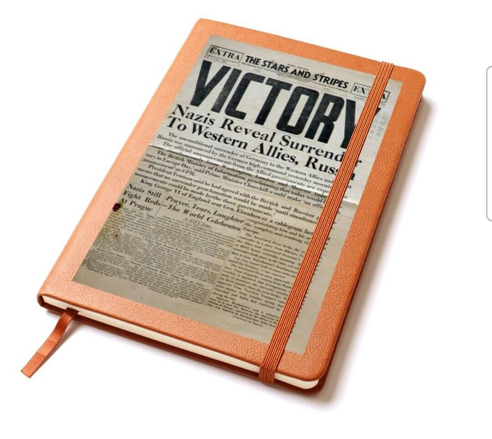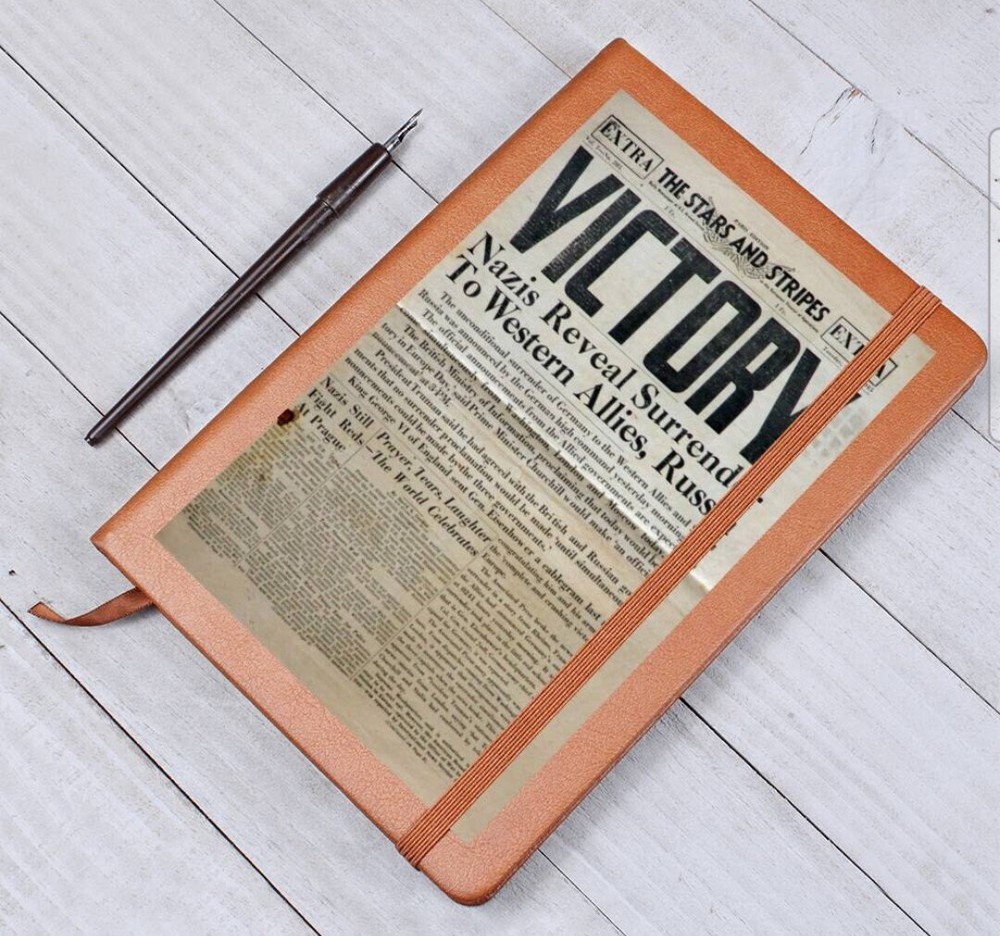 Unlock the charm of history with our exquisite Antique Leather Journal, a timeless treasure designed for the discerning writer who appreciates the fusion of history and elegance. This isn't just a journal—it's a conversation piece, a fragment of the past, and a tribute to the triumph of good over evil. 📜 **Vintage Historical Elegance** Step into the past with a cover that headlines a pivotal moment in history: the Nazi surrender to the Allies. Each glance at your journal is a reminder of the day the world heralded 'Victory' – an actual newspaper front cover from that significant day. 🔍 **Authentic Touch in Every Detail** Crafted with the highest quality leather, meant to age gracefully, our journal evokes the spirit and aesthetic of a bygone era, right down the feel of the cover that tells its own story. ✒️ **Preserve Your Thoughts with Character** Inside, find blank, cream-colored pages that invite your thoughts, dreams, and sketches. Whether you're jotting down ideas or chronicling your adventures, your words will be surrounded by the aura of history. 🌟 **A Statement of Style and History** This isn't merely a journal; it's a testament to the weight of history and the power of the written word. It makes for a thoughtful gift for history buffs, writers, and anyone who values the power of reflection. Make your mark in a piece of history with our Antique Leather Journal. Ideal for those who cherish the tactile sensation of leather and the emotional connection to history, it promises to be a journal that not only stores your entries but also inspires your creativity. You can own a piece of history through this historic reprint of a newspaper announcing the Victory in WWII! Printed on a high quality leather journal, it's perfect for any history lover or veteran! What better way to quiet your racing mind than with a clean slate? The Graphic Leather Journal is the perfect accessory for personal reminders, goal setting, or just getting organized. This vegan leather notebook allows you to write on the go thanks to its lightweight design. Plus, swapping between your important pages is easy thanks to the ribbon bookmark and elastic closure band. The unique front is professionally printed with vibrant colors - making your design last as long as your to-do list! Your journal will be custom made upon order and feature a professionally printed design. This present makes for a truly unique and sentimental gift that will be treasured! Product specifications: Vegan leather cover W 5.8" x L 8.5" x ⅝” (14.73cm x 21.59cm x 1.6cm) 100 sheets / 200 lined pages Brown elastic closure band Ribbon bookmark Weight: 11.33 ounce Each order is lovingly packaged and shipped with care Powered by ExportYourStore.com