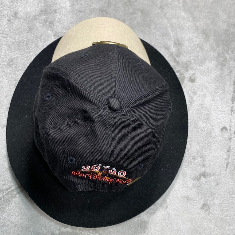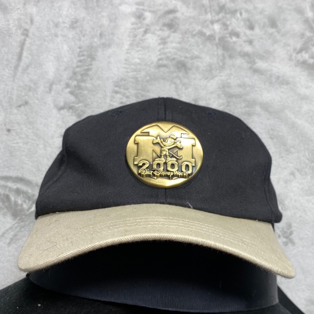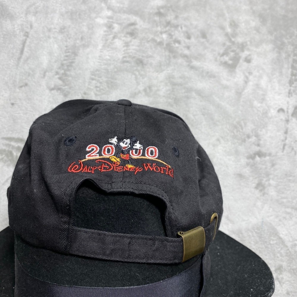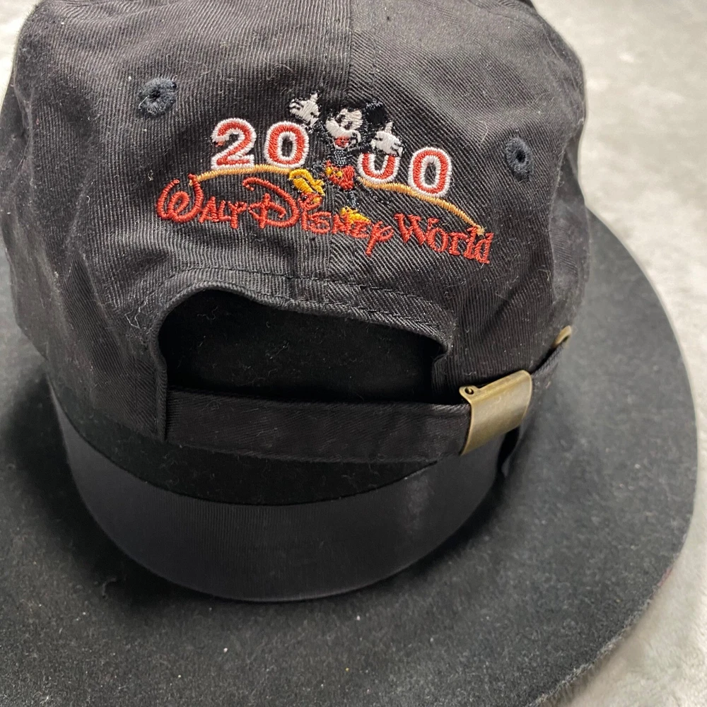 A vintage Walt Disney World baseball cap commemorating the year 2000. This black cap features a tan brim and an adjustable strap with a brass-tone buckle. The front showcases a gold-tone metal emblem with the "M" logo and "2000" inscription. The back of the cap is embroidered with "2000" and Mickey Mouse, along with "Walt Disney World" in red lettering. Keywords: Walt Disney World, Disney, Mickey Mouse, Baseball Cap, Hat, 2000, Vintage, Embroidered, Adjustable, Souvenir, Collectable, Theme Park, Disney World, Disney Hat See photos for exact condition and sizing. Shirts: Chest (pit to pit) and length Bottoms: Waist (flat) and inseam We ship most orders same or next day. Secondhand thrifted items they may have residual odors from previous storage, smoke, pets, cooking, or other environmental factors. Sensitive buyers should take this into account before purchasing. Items are sold as they are and may require laundering or airing out upon receipt. Messages may take up to 48 hours Thanks Bob