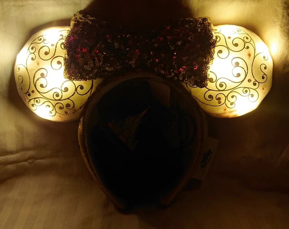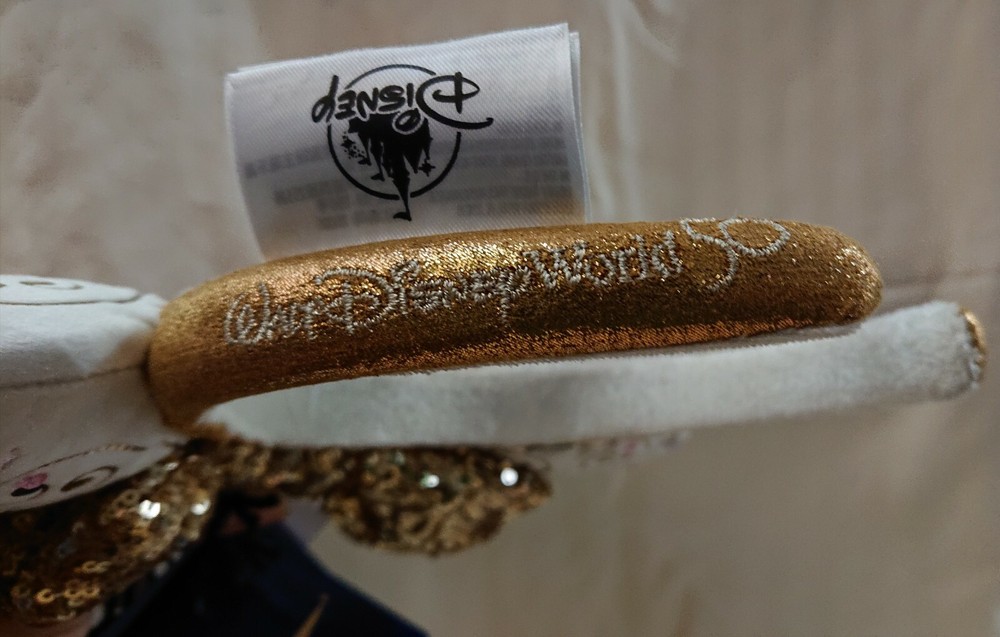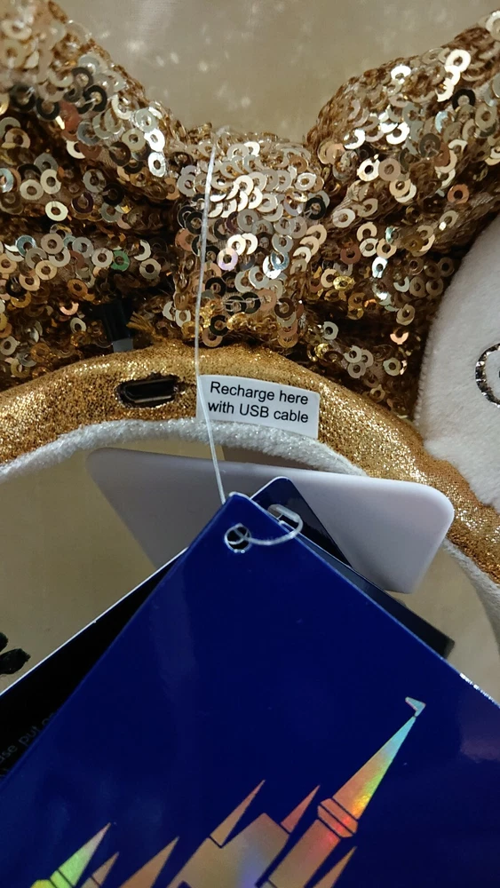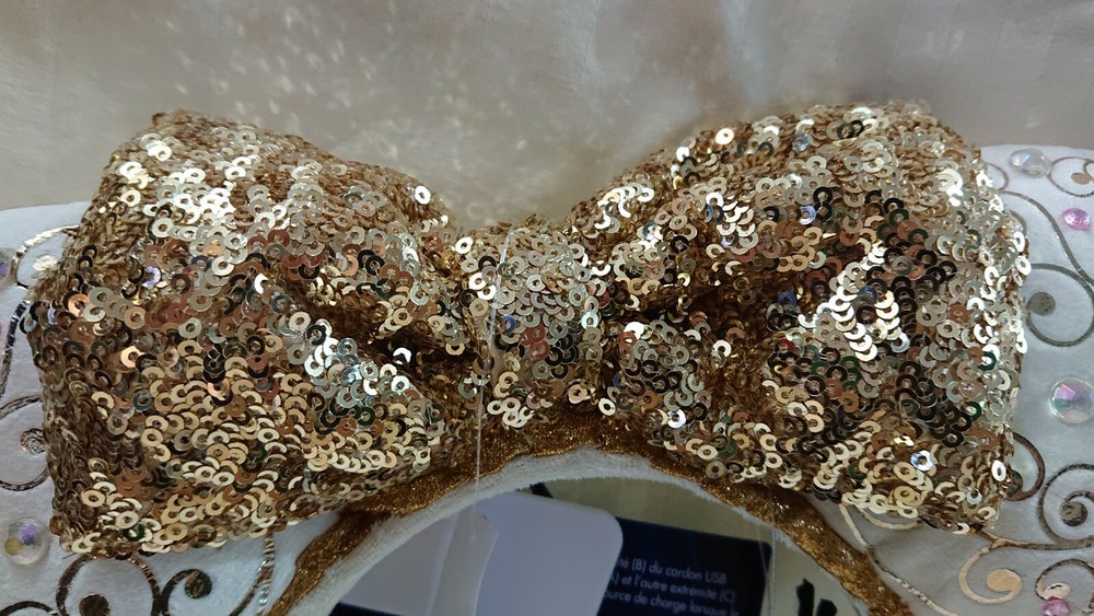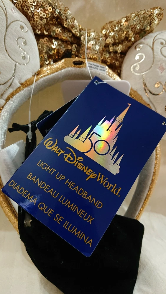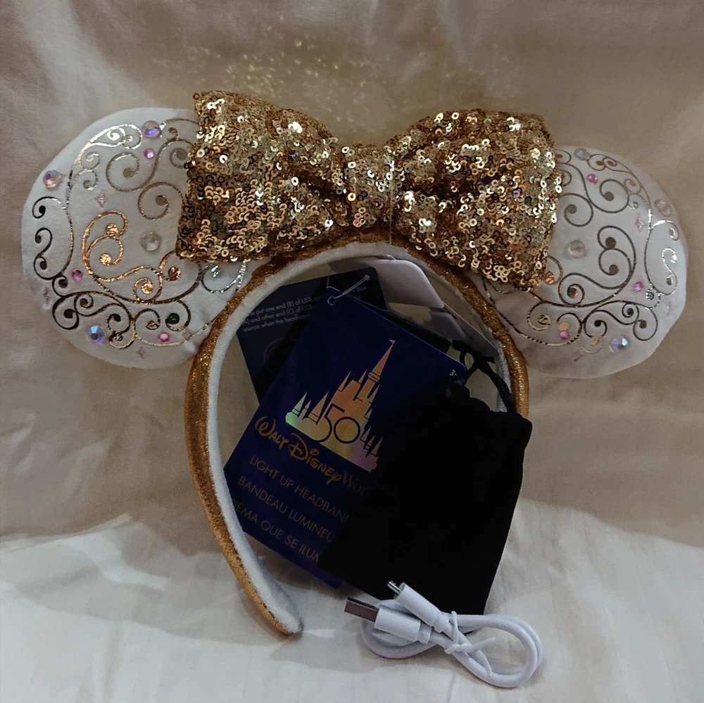 BRAND NEW!! MUST HAVE EARS!! Walt Disney World Parks 50th Anniversary Celebration Light-Up Minnie Ears Headband. Super cute white ears with gold swirl patterns, jewel accents, and a gold sequined bow in-between. Gold band with white "Walt Disney World 50" stitched along one side. Push the button behind the bow and watch them light up! They can be recharged using the included USB cord.