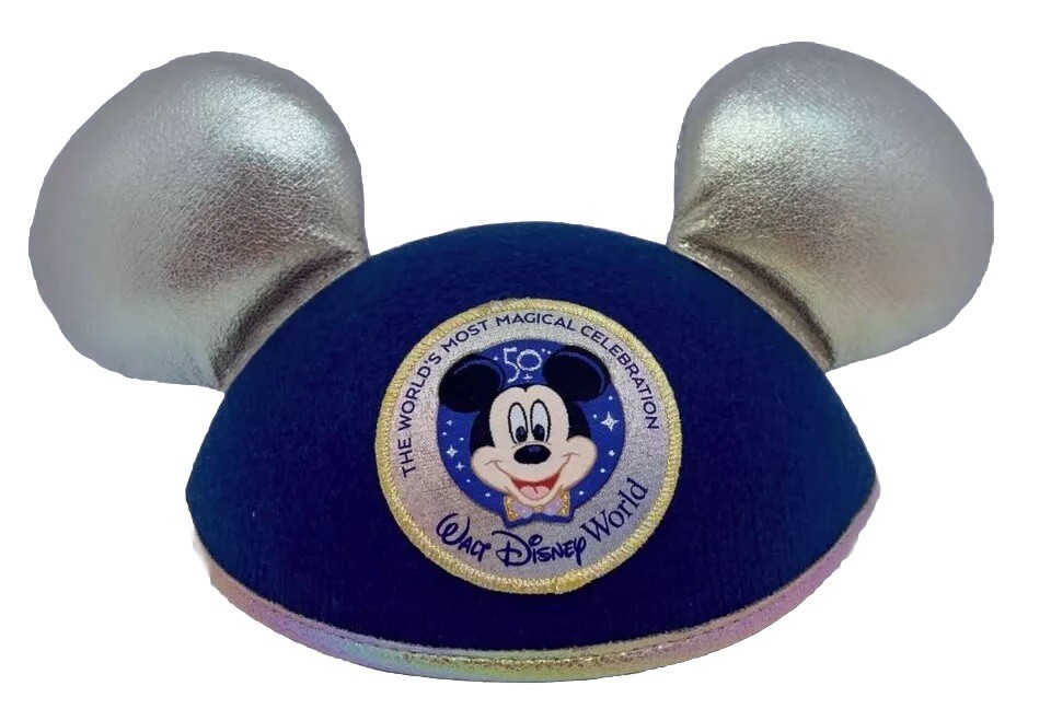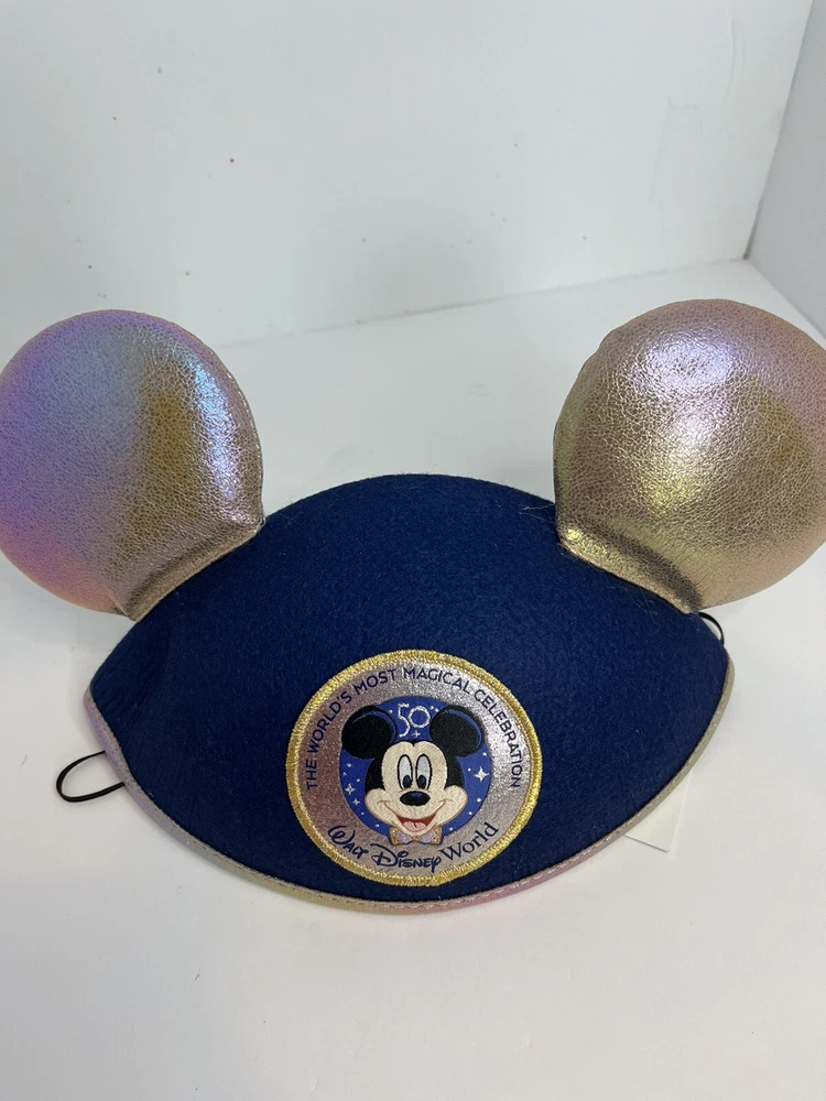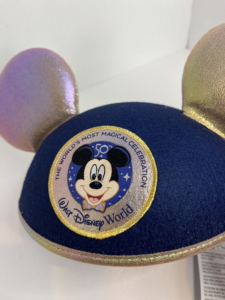 Disney Parks 50th Anniversary Celebration Blue & Gold Mickey Ear Hat New Description: Celebrate Walt Disney World's 50th Anniversary, with this Mickey Mouse Ears Hat. Features Mickey in Navy and Gold with the words "The World's Most Magical Celebration." Felt dome Embroidered Mickey Mouse appliqué on front Gold Plush ears Elastic chin strap Dome: polyester Ears: Plush Adult Imported Authentic Disney Parks Merchandise