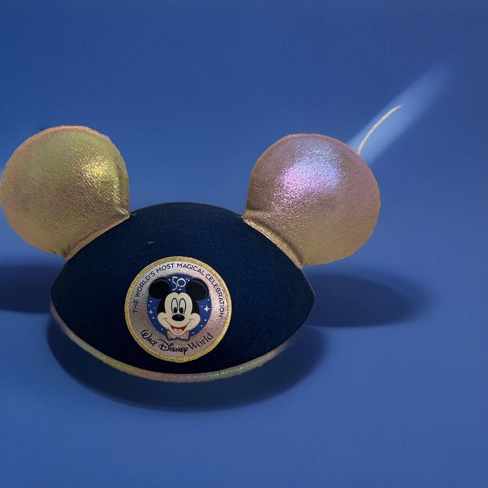 Celebrate Walt Disney World's 50th Anniversary, with this Mickey Mouse Ears Hat. Features Mickey in Navy and Gold with the words "The World's Most Magical Celebration." * Felt dome * Embroidered Mickey Mouse patch on front * Gold Plush ears * Elastic chin strap * Dome: polyester * Ears: Plush * Adult *Authentic from Disney Store