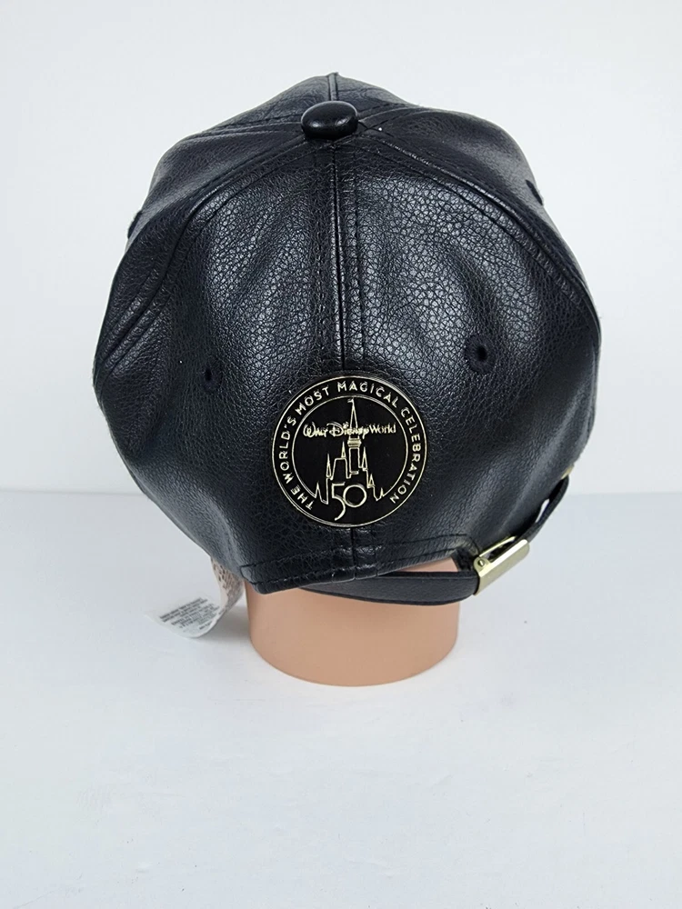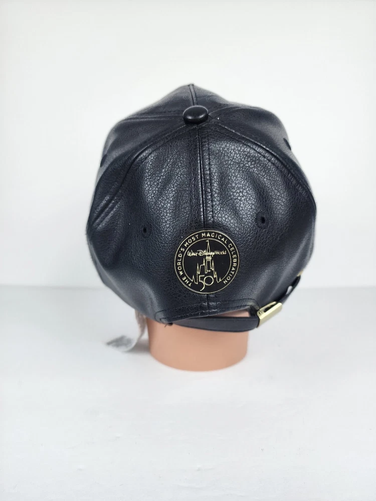 Celebrate the 50th anniversary of Walt Disney World with this black baseball cap featuring the iconic logo in faux leather. Perfect for Disney collectors and fans of all ages, this unisex hat is suitable for adults and is sure to make a statement at any Disney event or convention. The cap showcases the famous franchise and can be worn as a stylish accessory or added to your Disneyana collection. Whether you're a fan of Disney movies or simply love the world-famous theme park, this hat is a must-have for any true Disney enthusiast. Used in excellent condition.