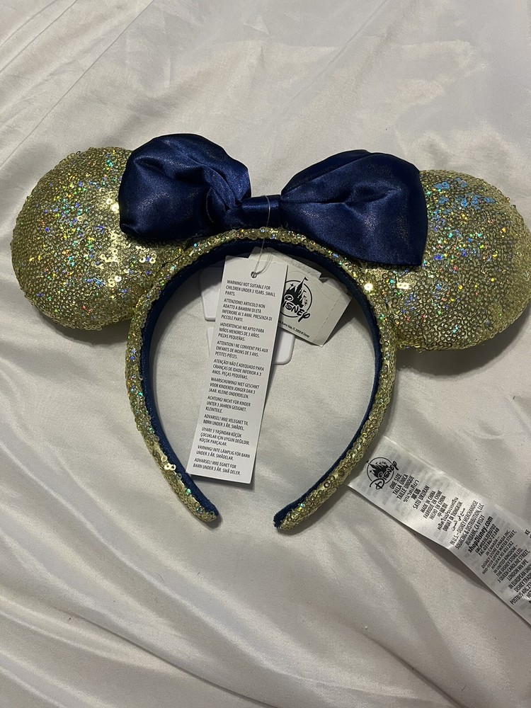 Walt Disney World 50th Anniversary Sequined Gold With Blue Bow Ears Headband NEW. Condition is New. Shipped with USPS Ground Advantage....