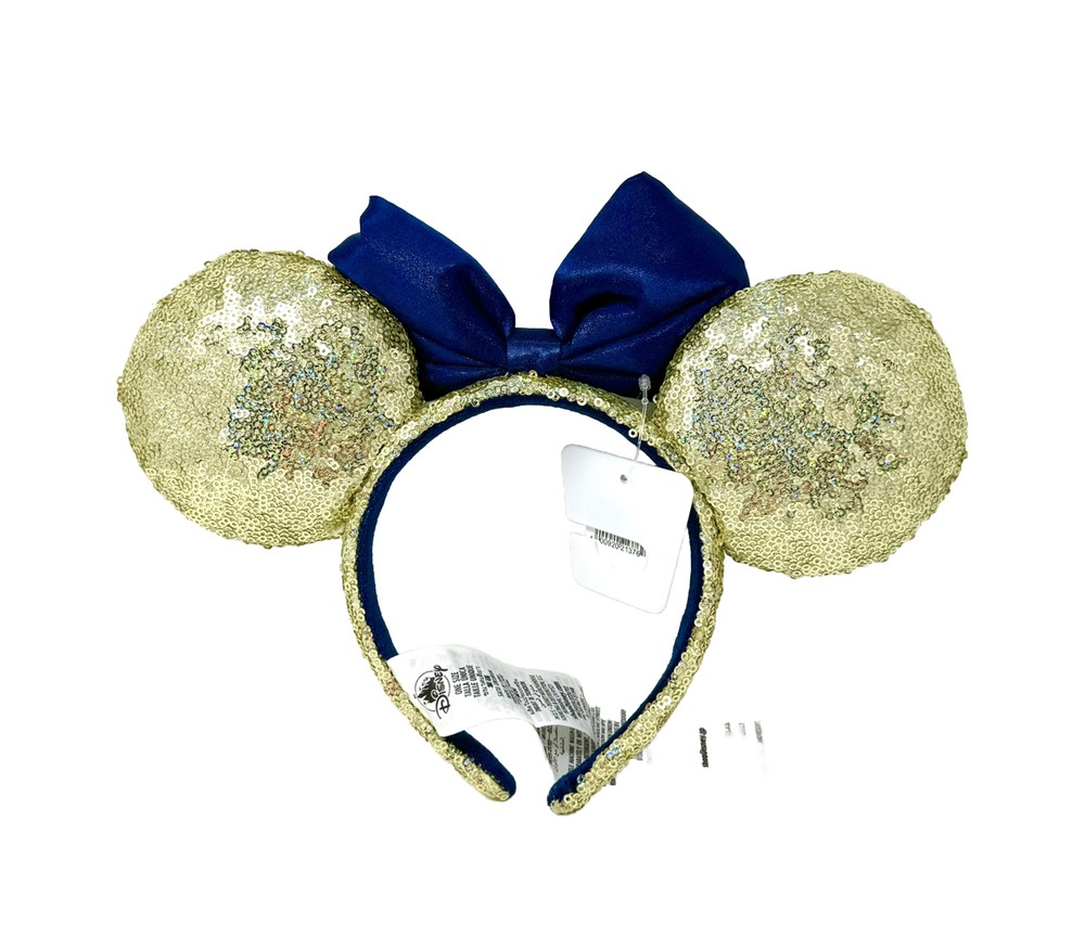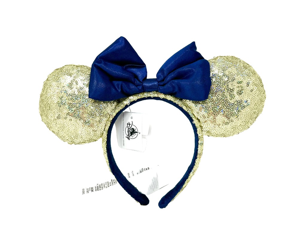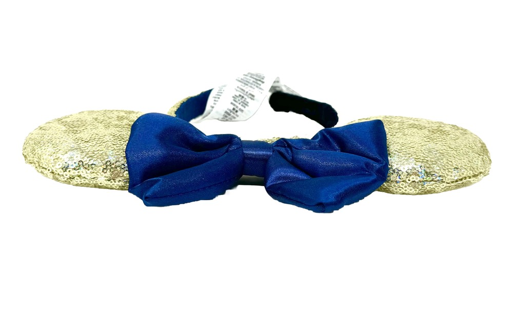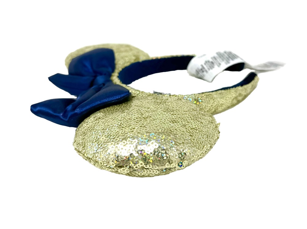 Like Minnie, you'll be a sparkling, timeless classic in this gold sequined ear headband with a pretty blue satin bow, part of The World's Most Magical Celebration. Authentic Parks Merchandise Soft padded Minnie ears Gold sequined ears and headband Navy blue satin bow One size fits most adults Polyester, exclusive of decoration Approx. 9'' H x 11'' W x 1 1/2'' D