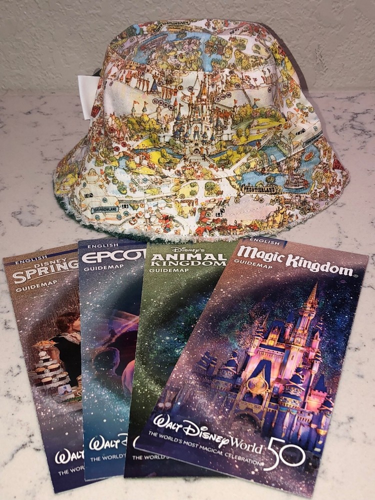 New With Tags Walt Disney World 50th Anniversary Vault Park Maps Adult Bucket Hat with FREE Park Maps! Perfect for any Disney fan. Please look at all photos as this is the EXACT bucket hat you will receive. This has frayed edges on the hat, it is the style of the hat. I am also including the free park maps that are pictured. Please e-mail me with any questions you may have. From a pet free and smoke free home. I ONLY SHIP WITHIN THE UNITED STATES! ALL SALES ARE FINAL! Shipped by USPS ground advantage. Thank you for looking and have a wonderful day!