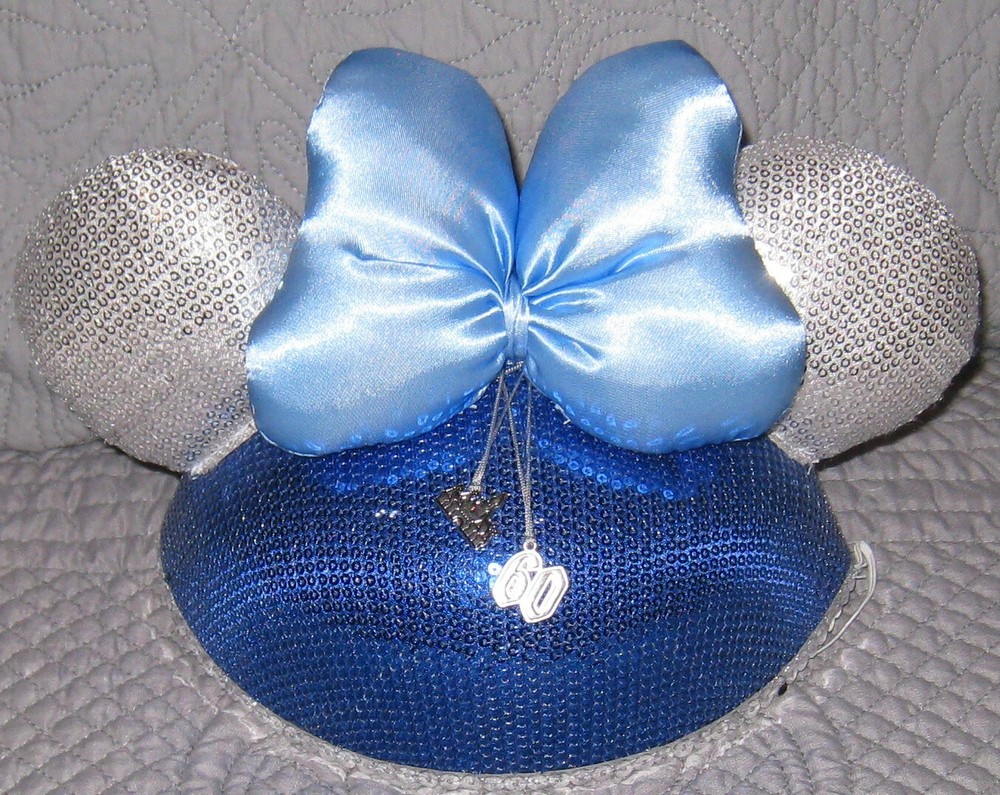 Walt Disney World 60th Anniversary Mickey Mouse Ears Hat Puffy Silver Ears and Blue Bow One Size...