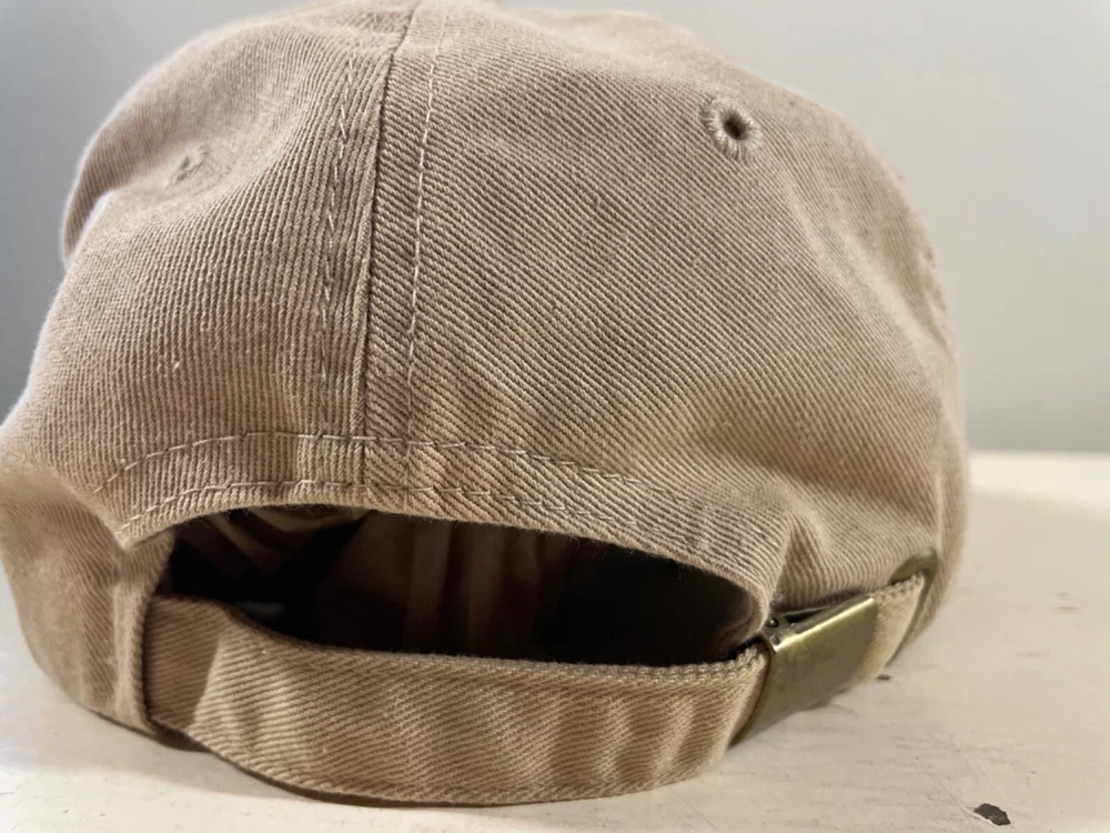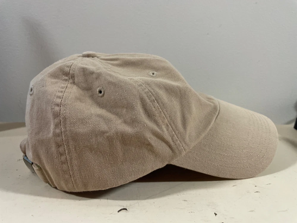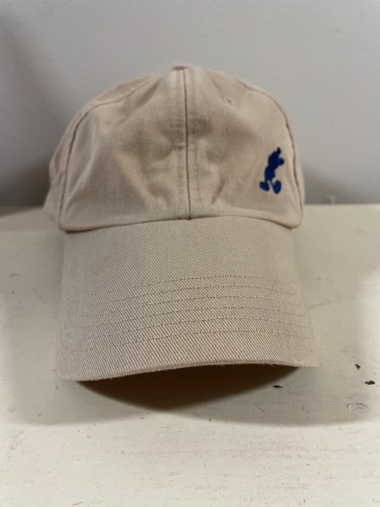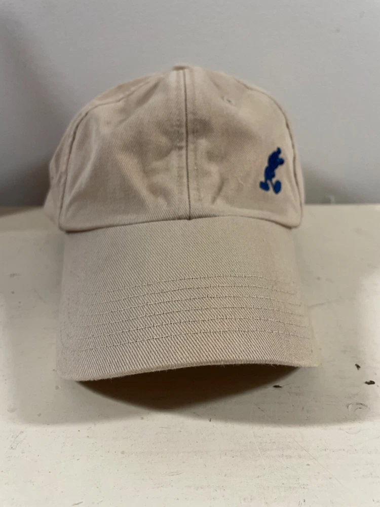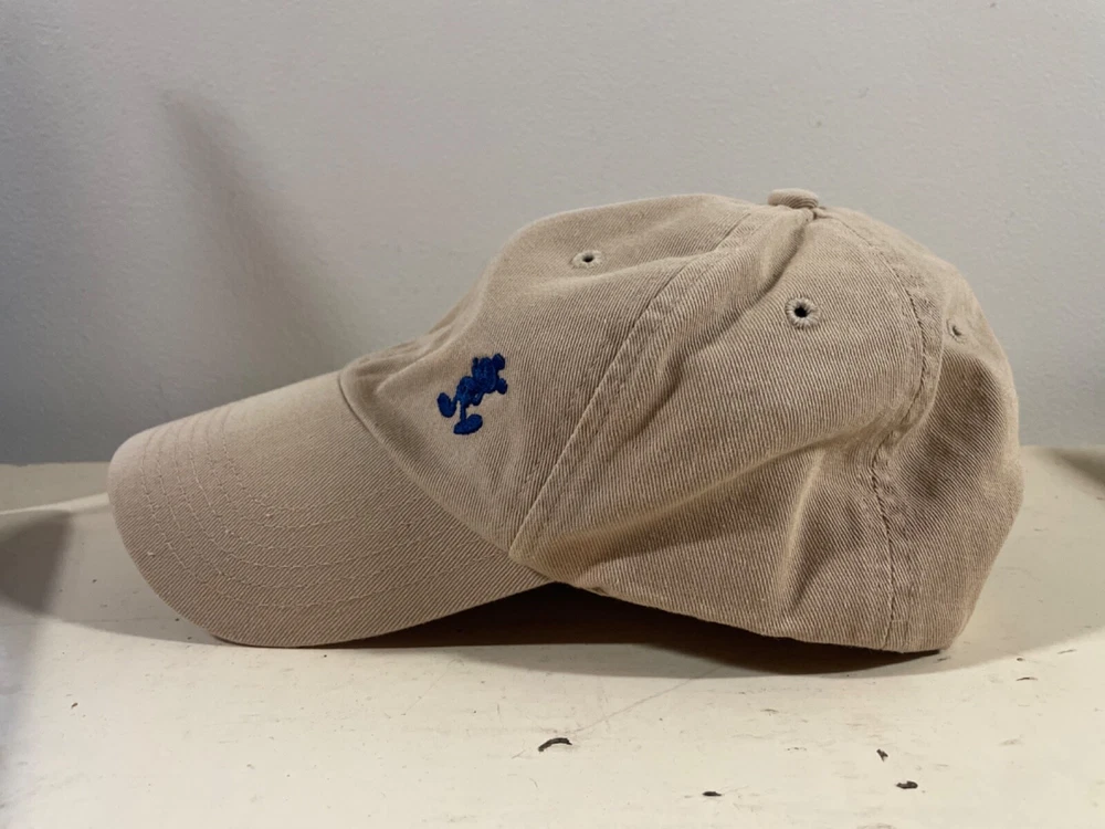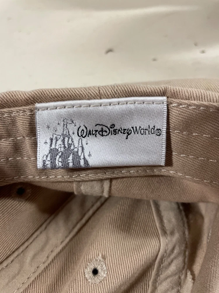 This Walt Disney World adult beige baseball cap hat features an embroidered Mickey Mouse design and adjustable strap.