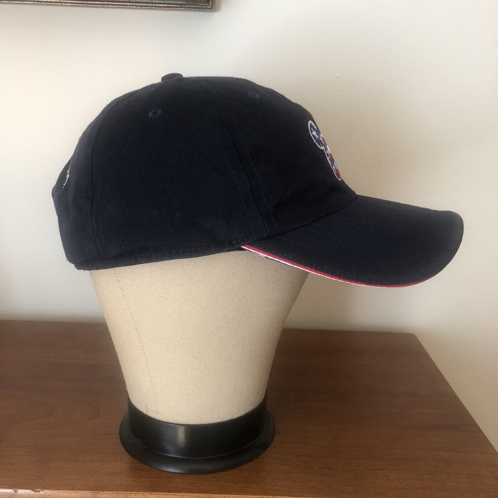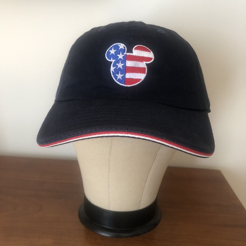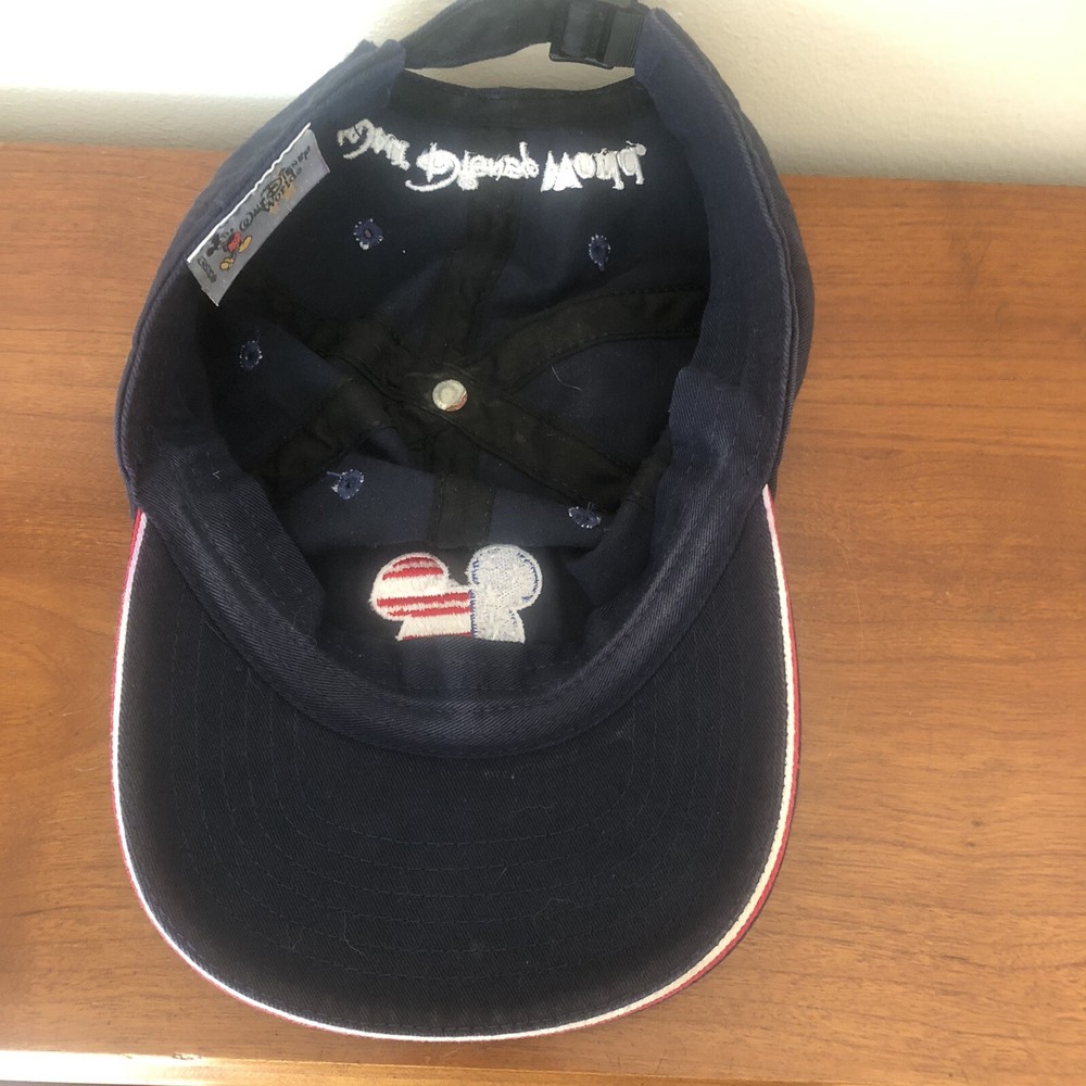 This is a Walt Disney World adult blue baseball cap with adjustable strap back and a red, white and blue patriotic flag Mickey Mouse head outline appliqued on the front. Very good condition. Fabric tag missing - appears to be cotton.