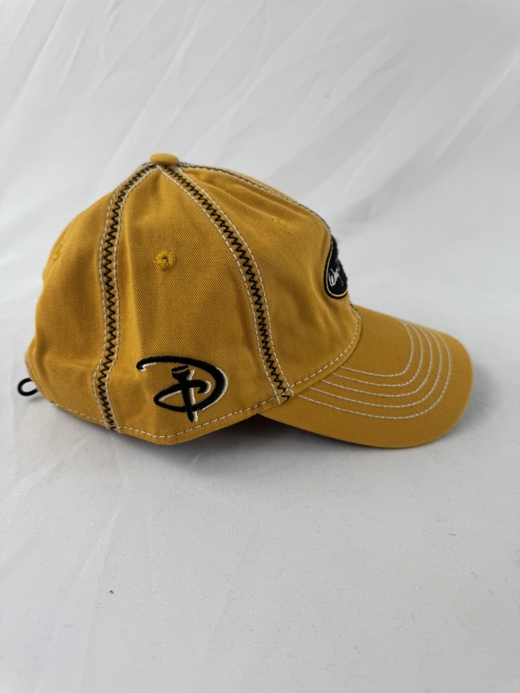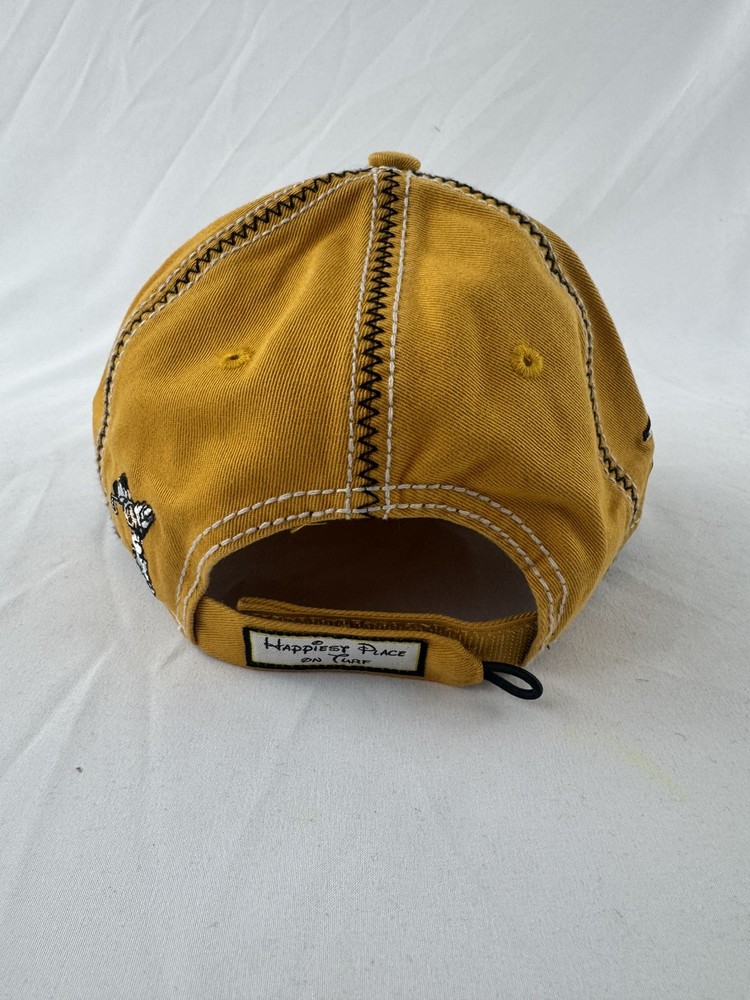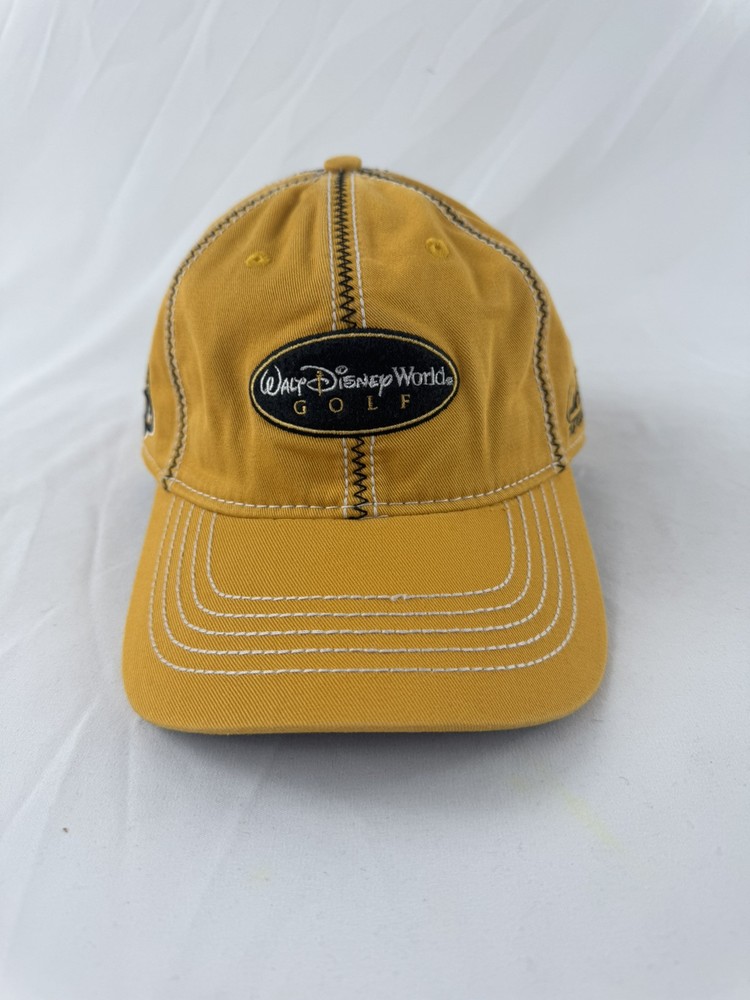 This is a special edition yellow golf hat featuring Mickey Mouse, part of the Walt Disney World collection by Arnold Palmer. The classic cut hat is one size fits most and suitable for adults. It is unisex and officially licensed by Disney, making it a collectible and contemporary piece of Disneyana apparel and accessories.