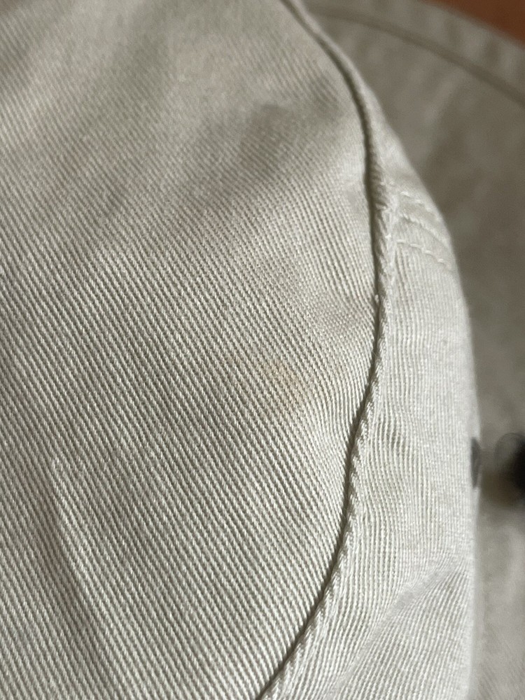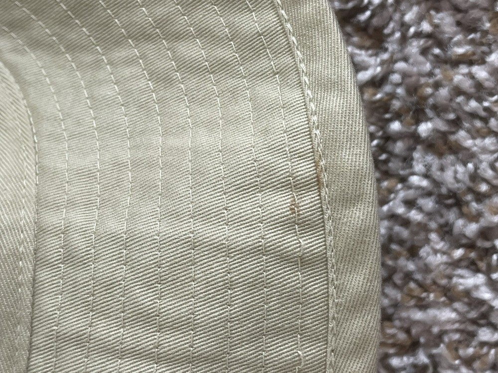 Hat could stand a good washing - has a few soil/stain spots that should come out easily. Sweatband has some minor soiling....