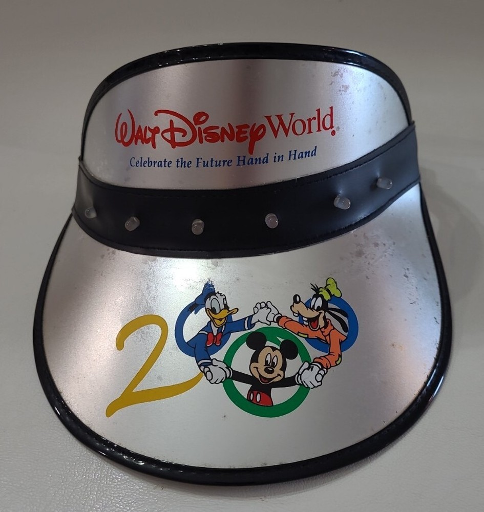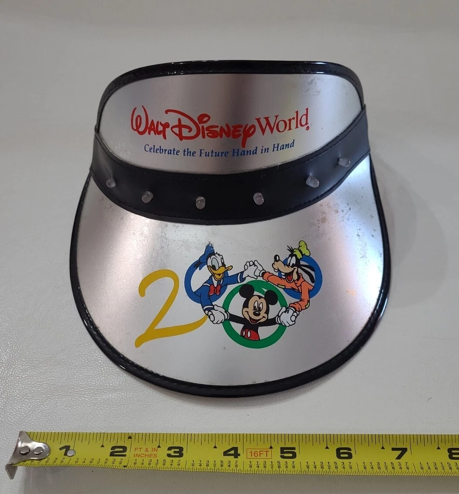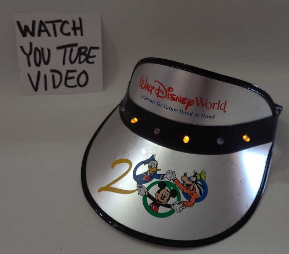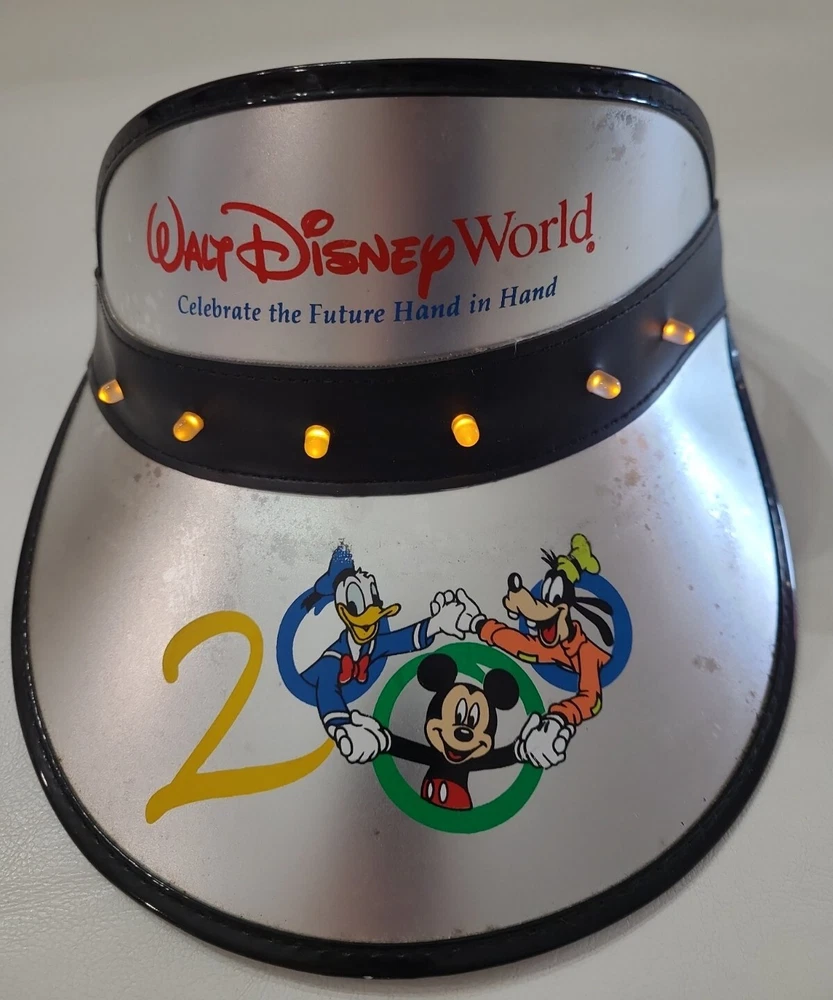 Up for sale is a Vintage Walt Disney World Celebrate The Future 2000 Adult Visor Hat!!! Item is in good Preowned Condition....has stains, paint wear, paint loss, image damage, discolored, scuff marks. Item is dirty and could use a cleaning. Watch YouTube Video to see it work: Link Below ⬇️ https://youtu.be/y_YZ-FFRtII Walt Disney World Celebrate the Future Hand in Hand Lights Up Visor/Hat Silver and black in color Says: Walt Disney World Celebrate the Future Hand in Hand 2000 Has Donald Duck, Mickey Mouse & Goofy on it Visor does have damage/ image loss The silver color on the hat has damge Measures about 4.5" tall Takes 9V battery (Not included) Please expect normal wear and tear due to being preowned and age... not 100% perfect!!!! Please look at all photos for condition of item and what you see in the photos is what you get....Happy Shopping!!! Thanks for looking 🙂