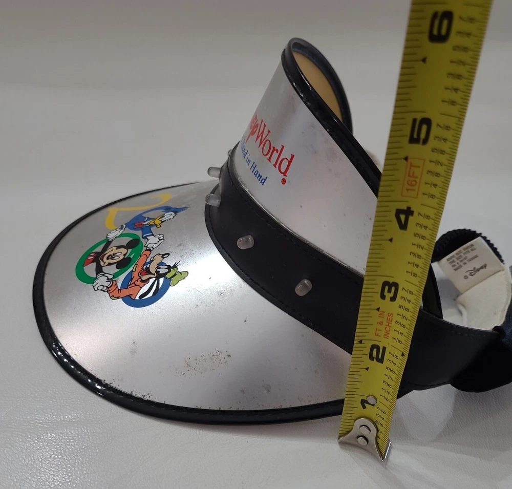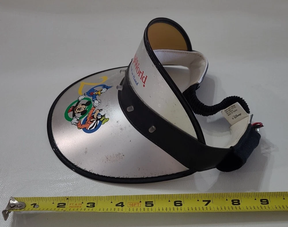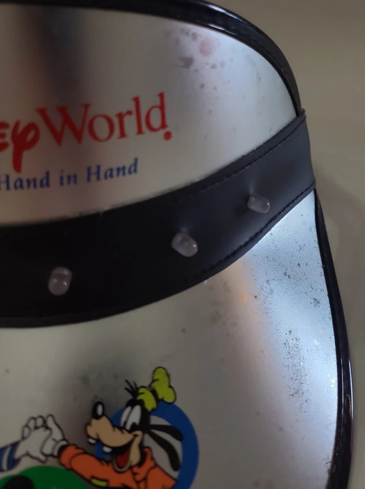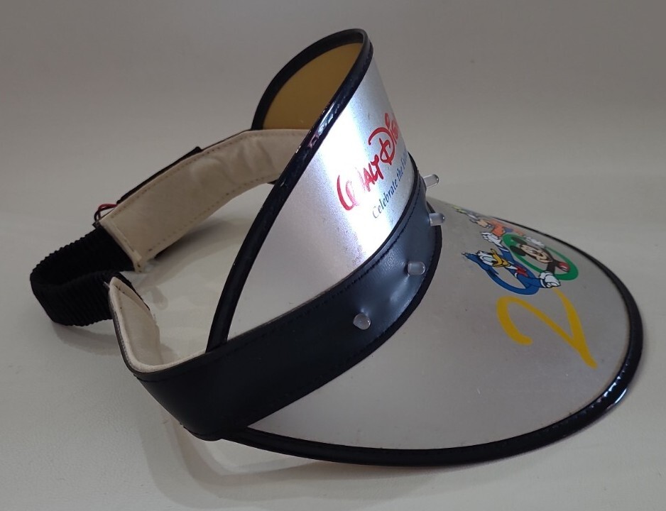 Up for sale is a Vintage Walt Disney World Celebrate The Future 2000 Adult Visor Hat!!! Item is in good Preowned Condition....has stains, paint wear, paint loss, image damage, discolored, scuff marks. Item is dirty and could use a cleaning. Watch YouTube Video to see it work: Link Below ⬇️ https://youtu.be/y_YZ-FFRtII Walt Disney World Celebrate the Future Hand in Hand Lights Up Visor/Hat Silver and black in color Says: Walt Disney World Celebrate the Future Hand in Hand 2000 Has Donald Duck, Mickey Mouse & Goofy on it Visor does have damage/ image loss The silver color on the hat has damge Measures about 4.5" tall Takes 9V battery (Not included) Please expect normal wear and tear due to being preowned and age... not 100% perfect!!!! Please look at all photos for condition of item and what you see in the photos is what you get....Happy Shopping!!! Thanks for looking 🙂