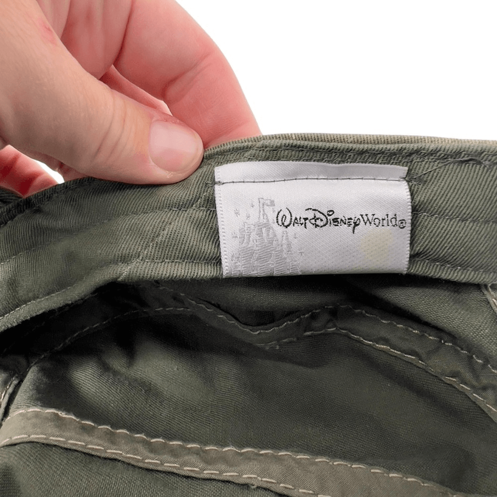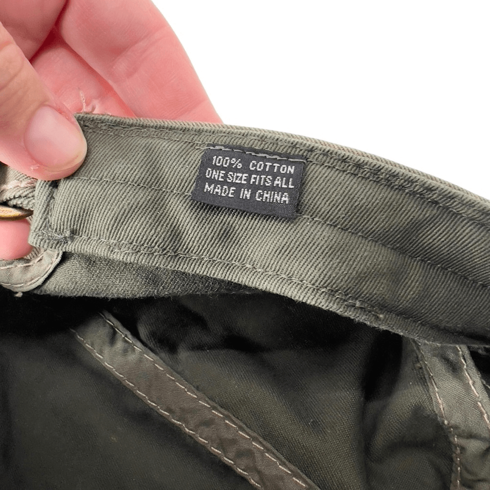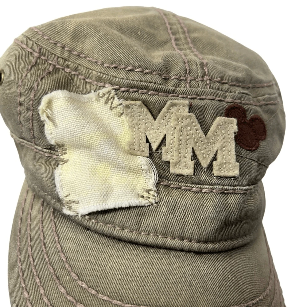 Distressed Spots on Brim are Part of the Design, not a flaw Adjustable. One Size Fits Most. Great preloved condition!