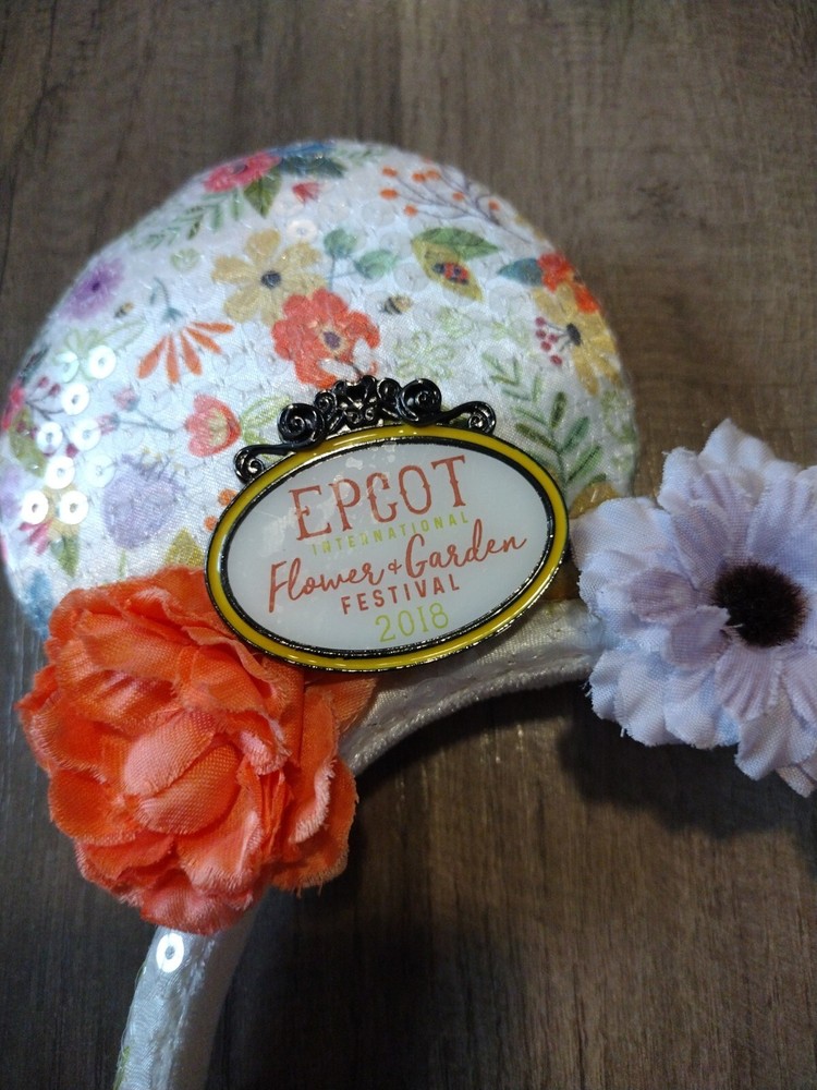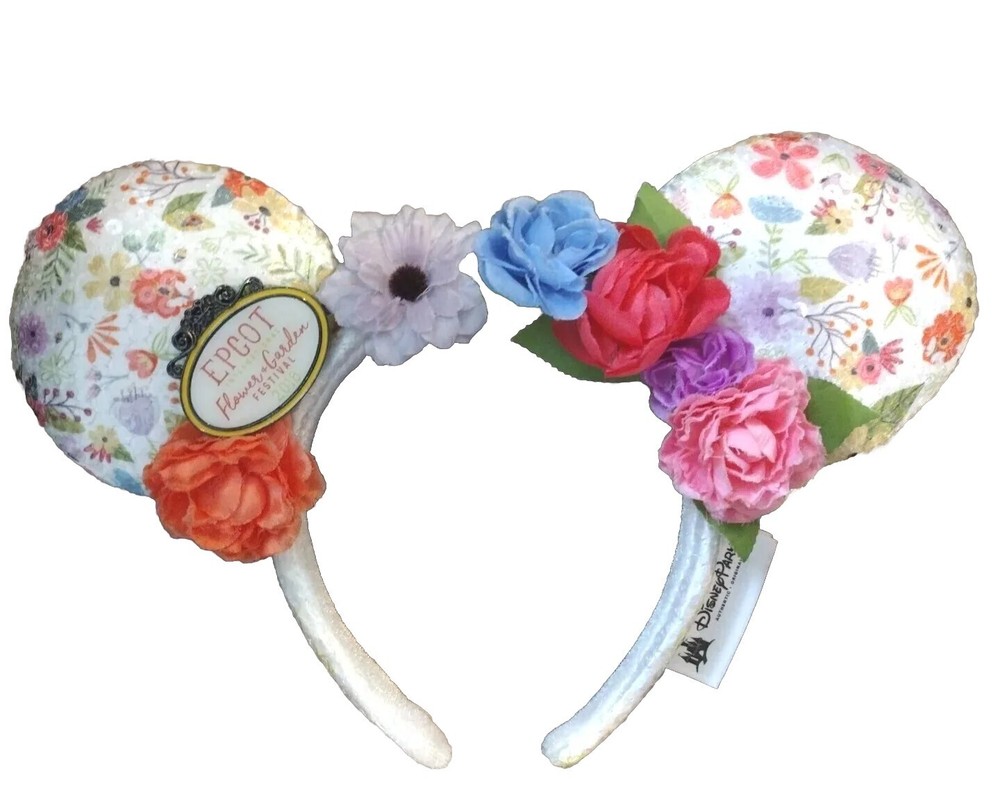 Walt Disney World Epcot 2018 Flower and Garden Festival Minnie Ears Sequined ears and beautiful flowers around the headband. Says Epcot International flower and garden festival 2018 Tagged Disney parks Very clean Any questions please ask Thank you.