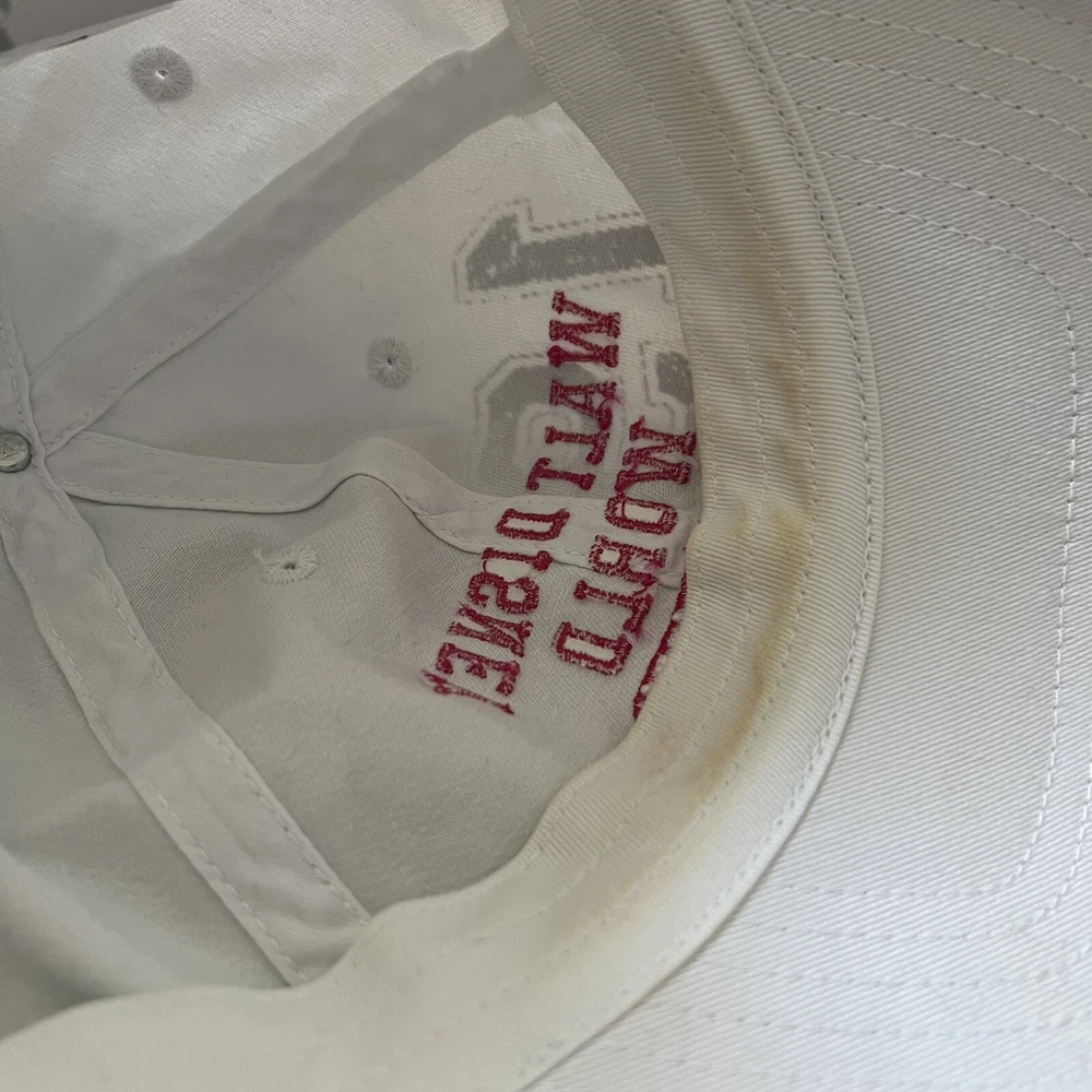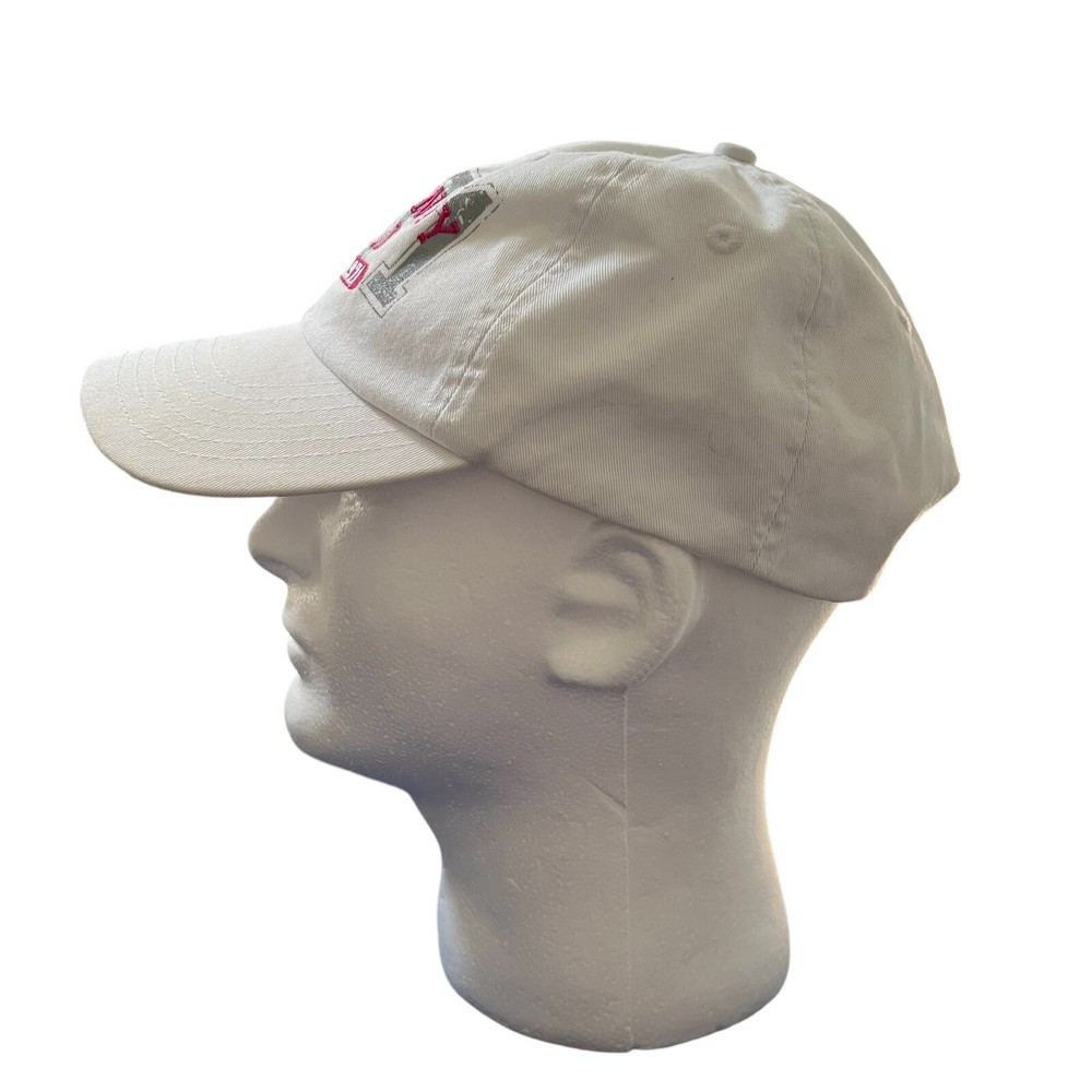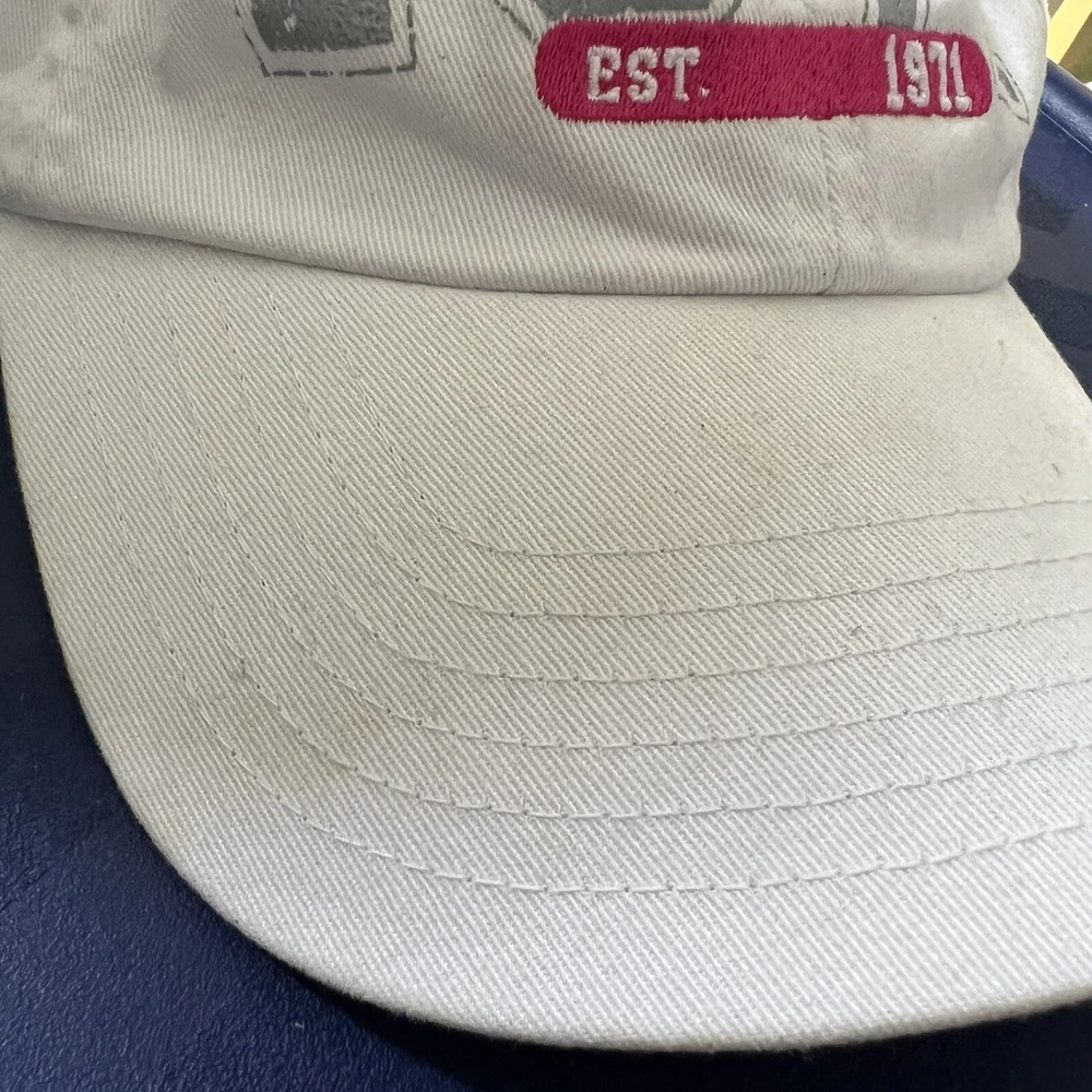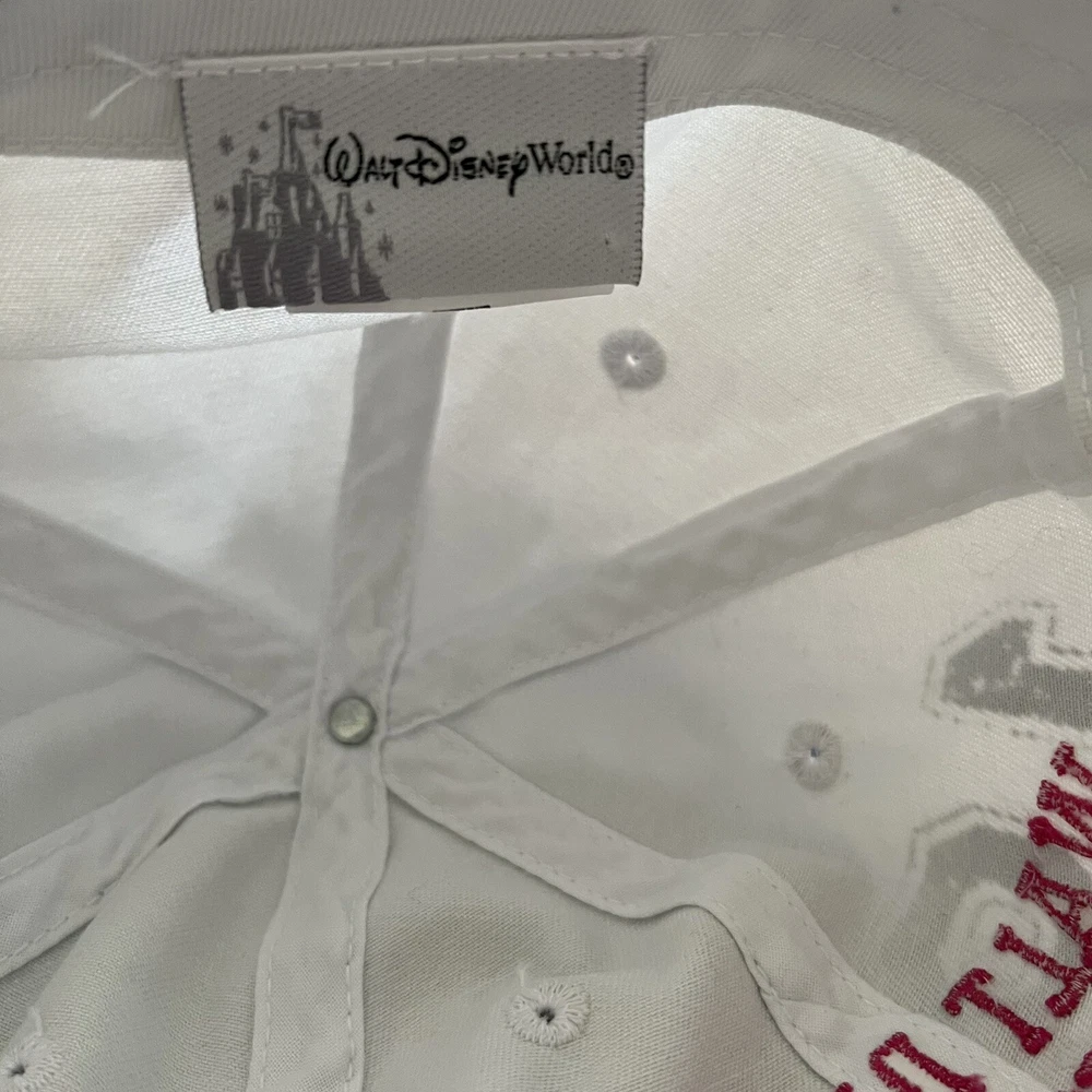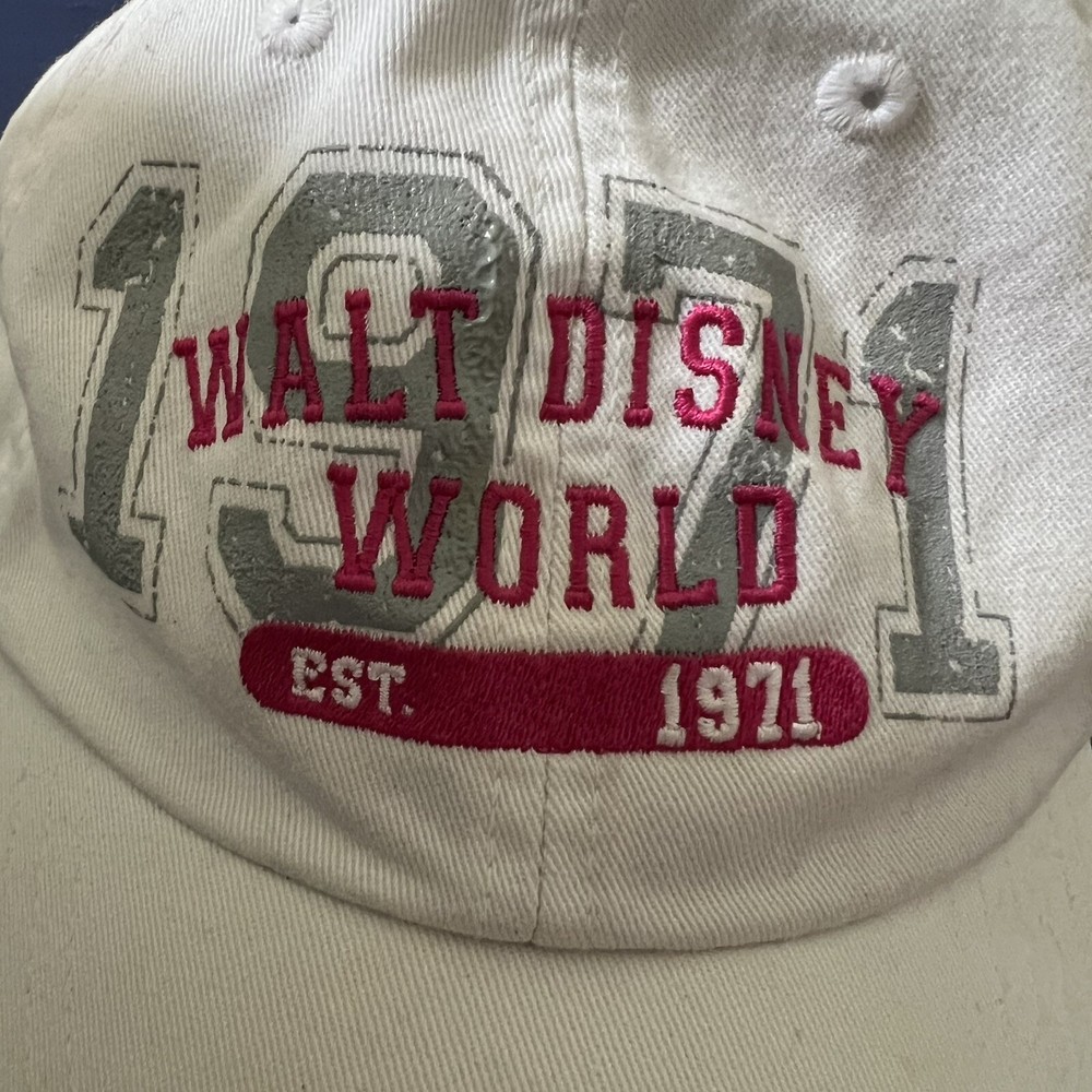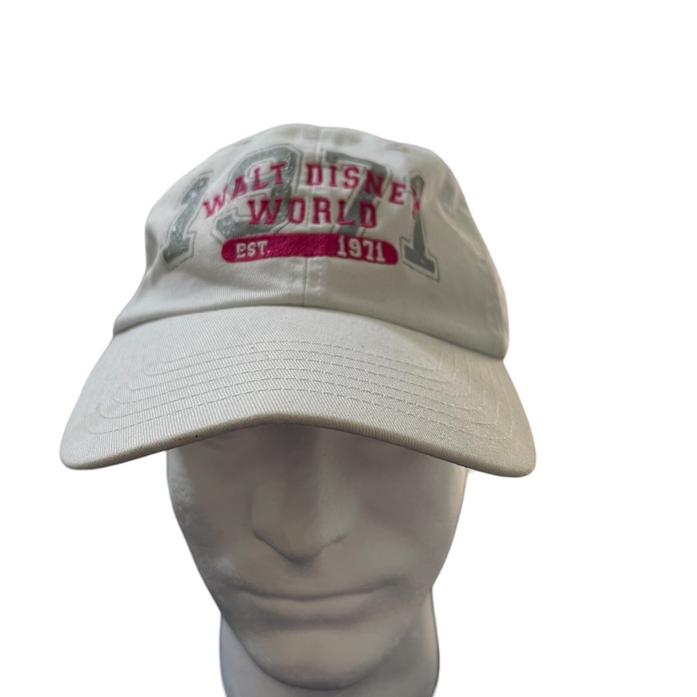 There is some staining on the inside and one small one on the brim. This Walt Disney World Est 1971 white cotton baseball hat is the perfect addition to any travel or casual outfit. The hat features an adjustable size, making it suitable for both men and women, and is embroidered with a pink Disney logo. The retro-style hat is made from cotton material and is suitable for all seasons, including summer, fall, and spring. The hat is a must-have for any Disney fan and is perfect for showing off your love for the theme park. The hat is made in China and is not vintage. It is a great accessory for any outfit and is sure to turn heads. Get your hands on this stylish hat today!