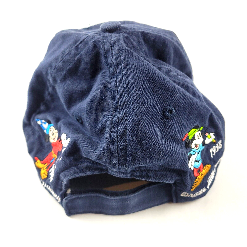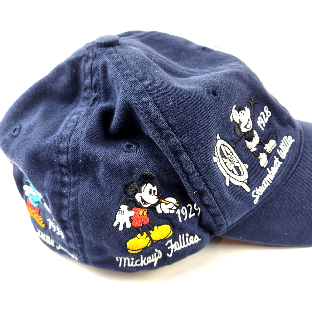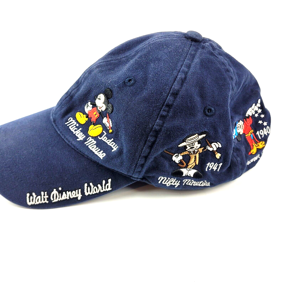 Get ready to show off your love for all things Disney with this Walt Disney World Evolution Of Mickey baseball cap. Featuring an adjustable hook and closure, this unisex one size fits all hat is made of high-quality cotton, ensuring both comfort and durability. The blue color and solid pattern give it a stylish and trendy look, perfect for any casual occasion. The hat boasts a fun and playful theme, showcasing the evolution of the beloved cartoon character Mickey Mouse through the years. It also features cute images of various animals and transportation, adding to its charm. This vintage-inspired cap is a must-have for any Disney fan and is sure to make a statement wherever you go.