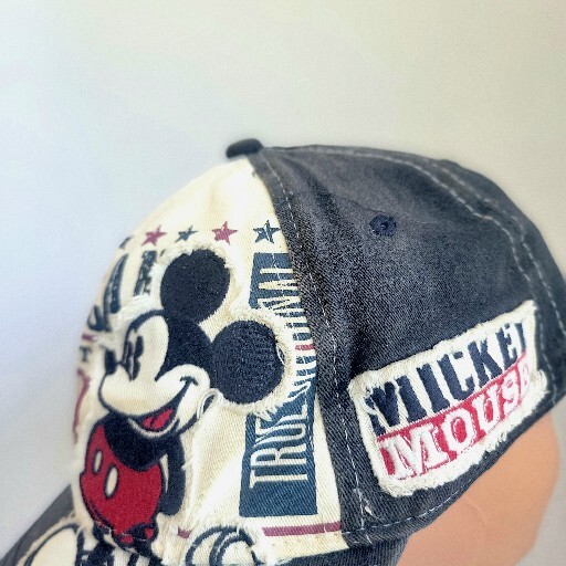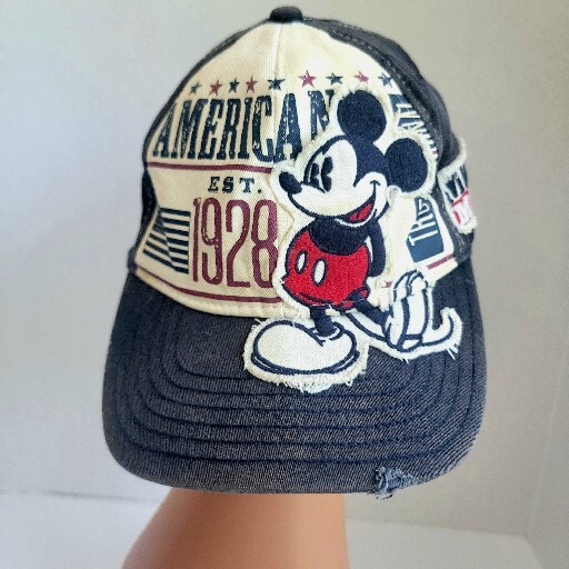 This cap is distressed by design and is just a really cool looking ball cap with a nice Mickey patch on the front. Please see photos. It would be a good unisex hat and is stretchable to fit comfortabl...