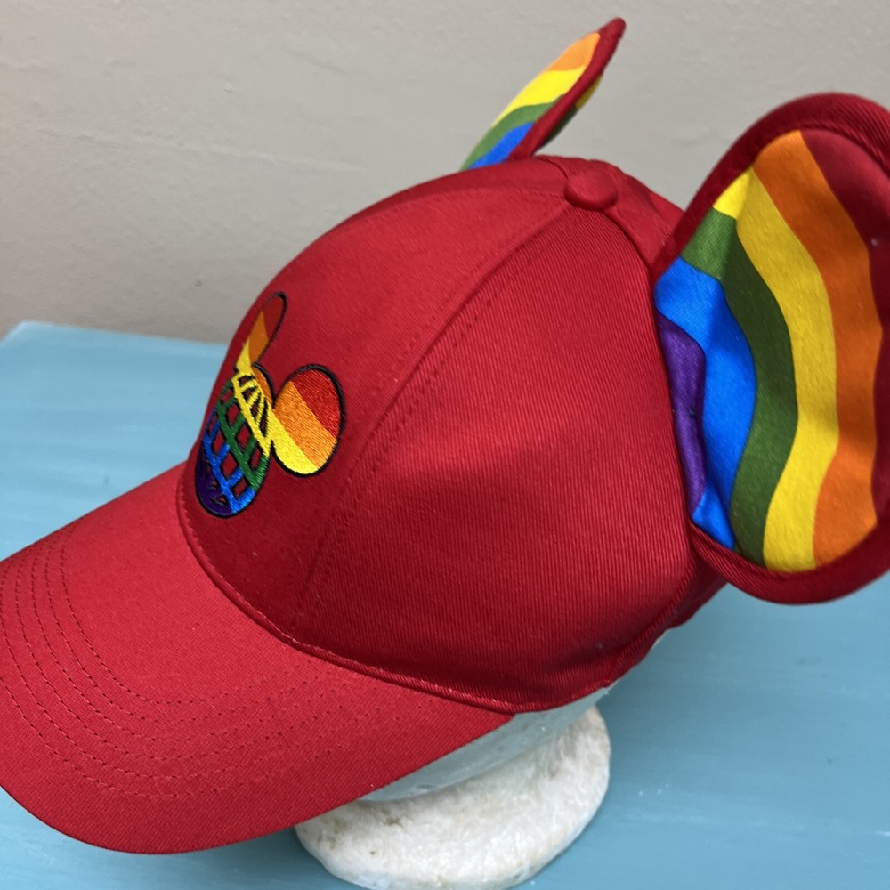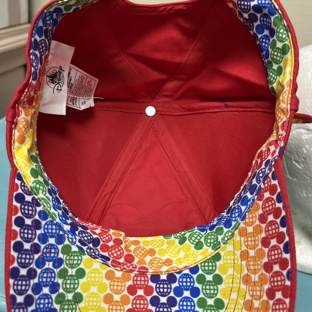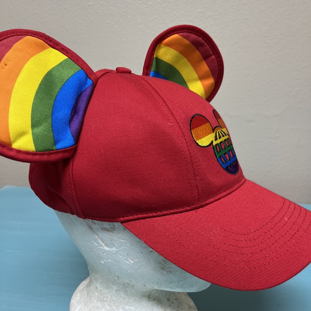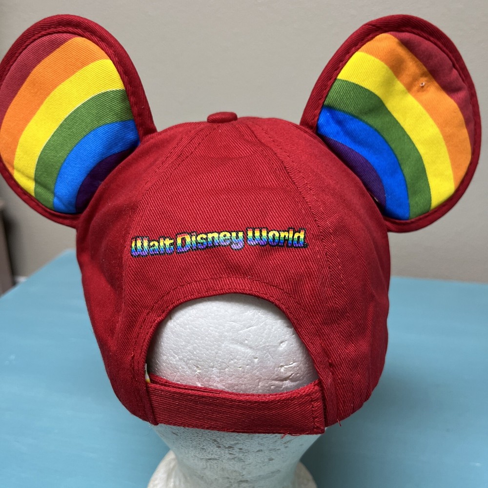 The product is a Walt Disney World licensed baseball-style hat featuring Mickey Mouse. The hat has rainbow ears and an embroidered logo on the front. It is adjustable with a sticky hook and loop and is suitable for adults. The hat is a part of the Disney franchise and is contemporary. It is unisex and comes in red with rainbow ears and logo.