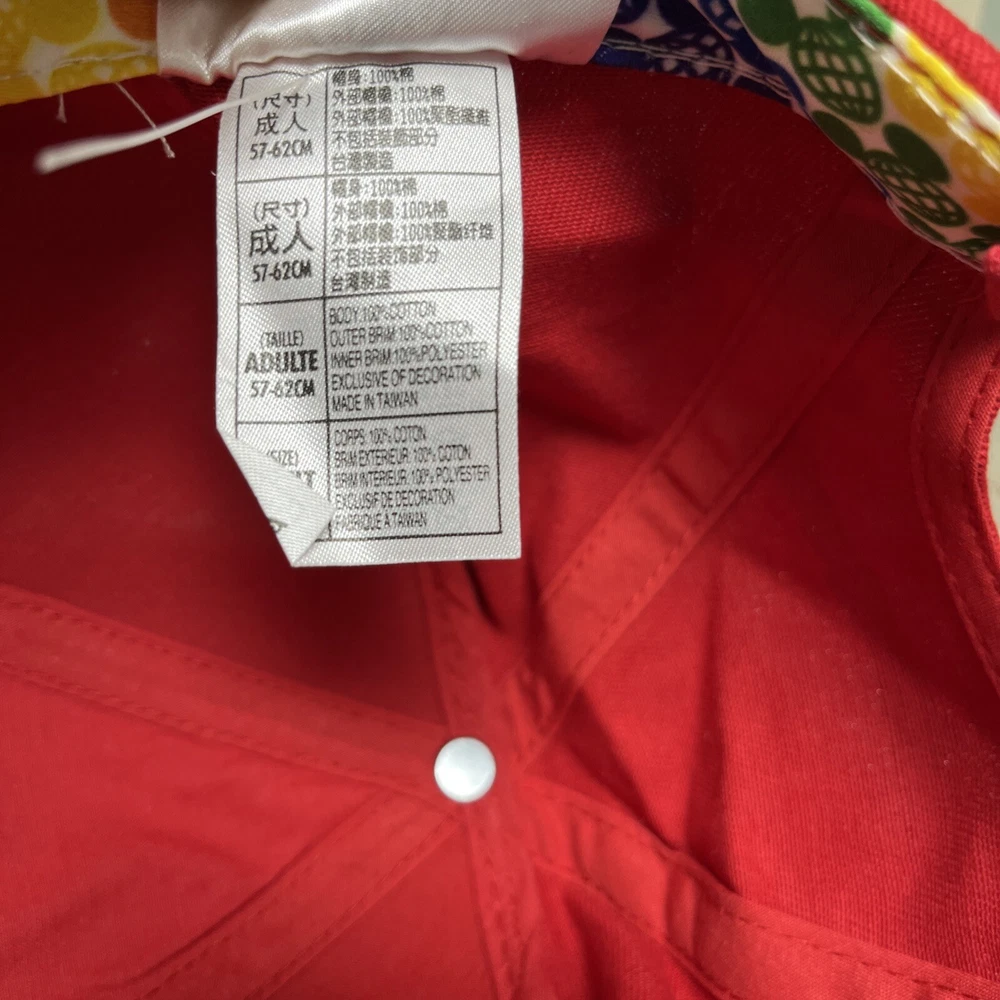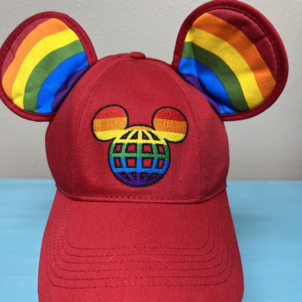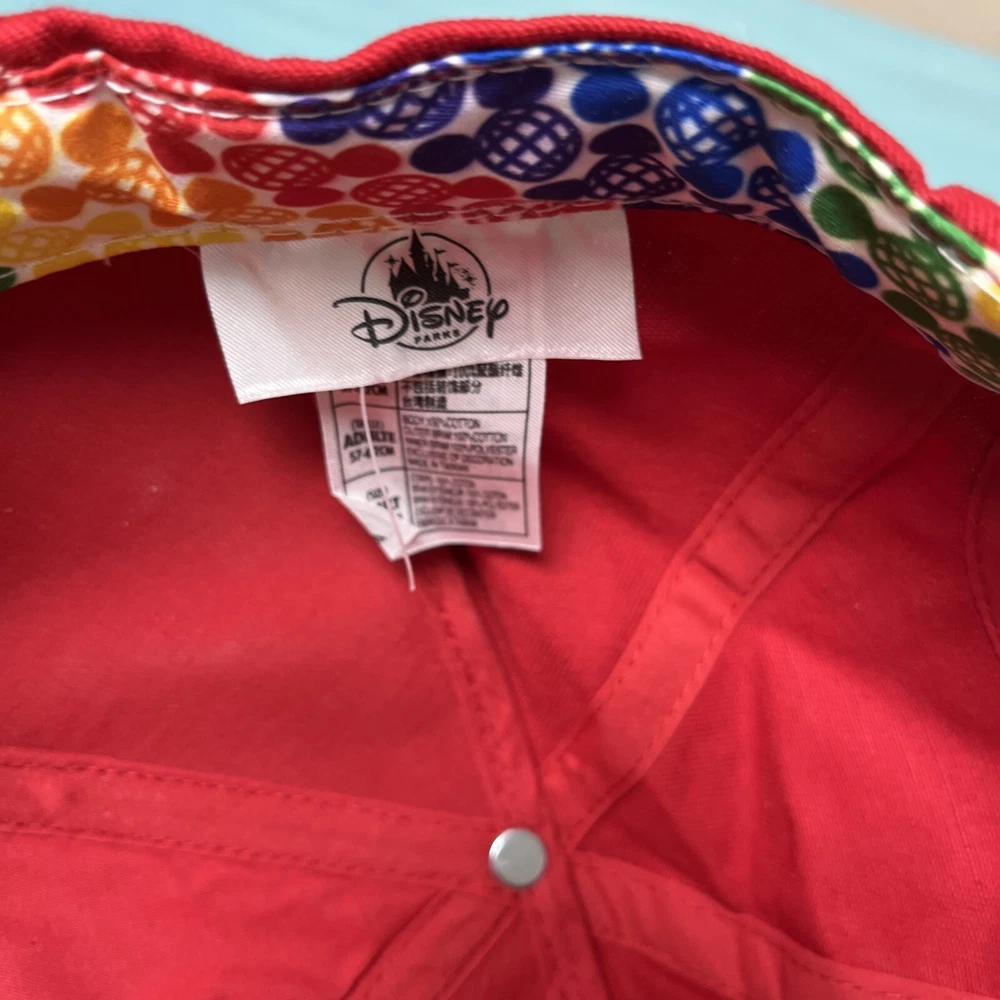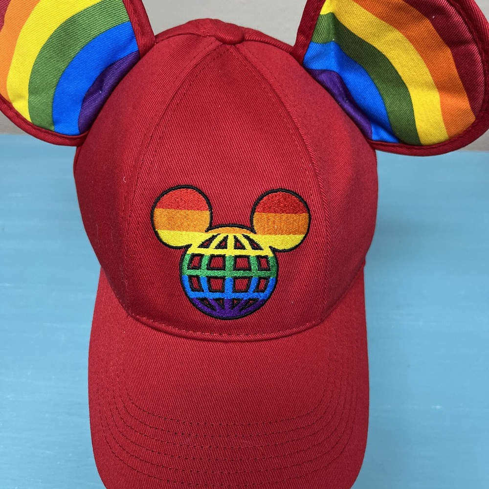 The product is a Walt Disney World licensed baseball-style hat featuring Mickey Mouse. The hat has rainbow ears and an embroidered logo on the front. It is adjustable with a sticky hook and loop and is suitable for adults. The hat is a part of the Disney franchise and is contemporary. It is unisex and comes in red with rainbow ears and logo.