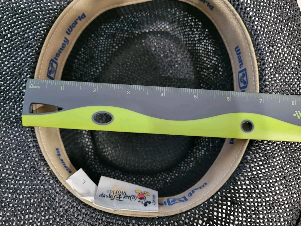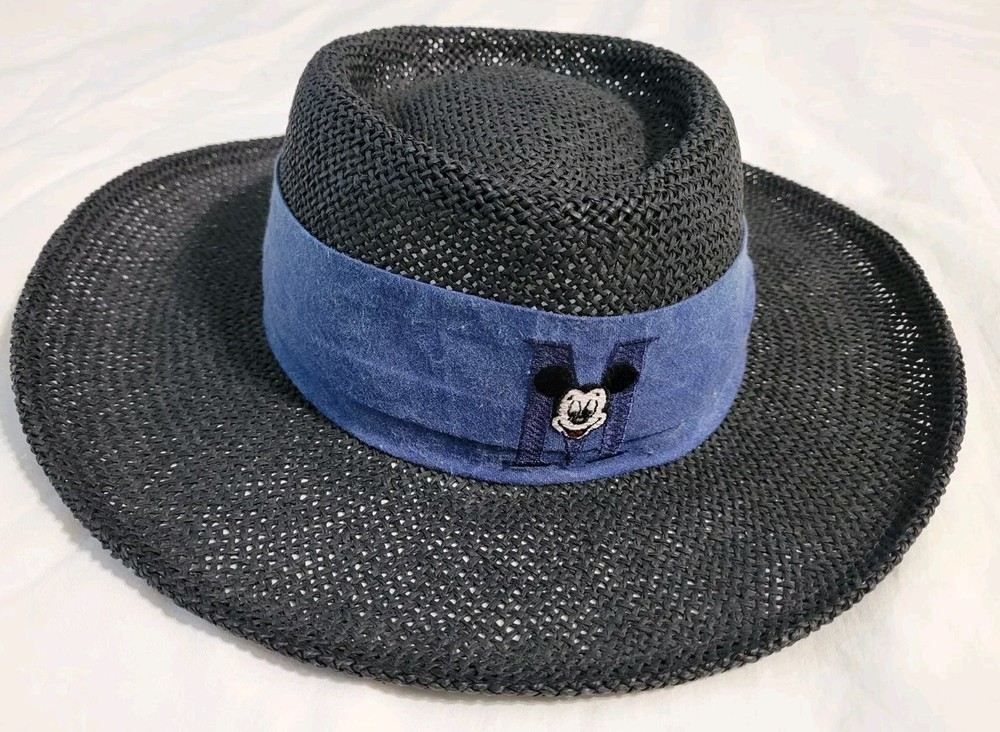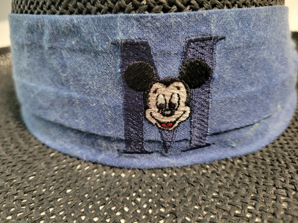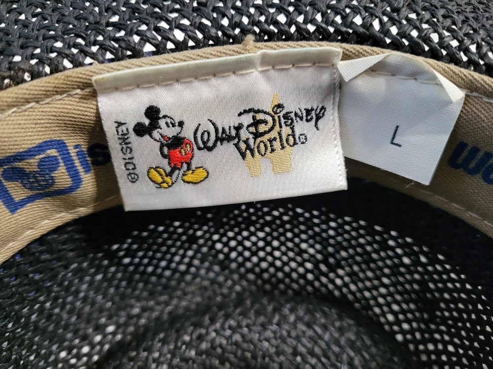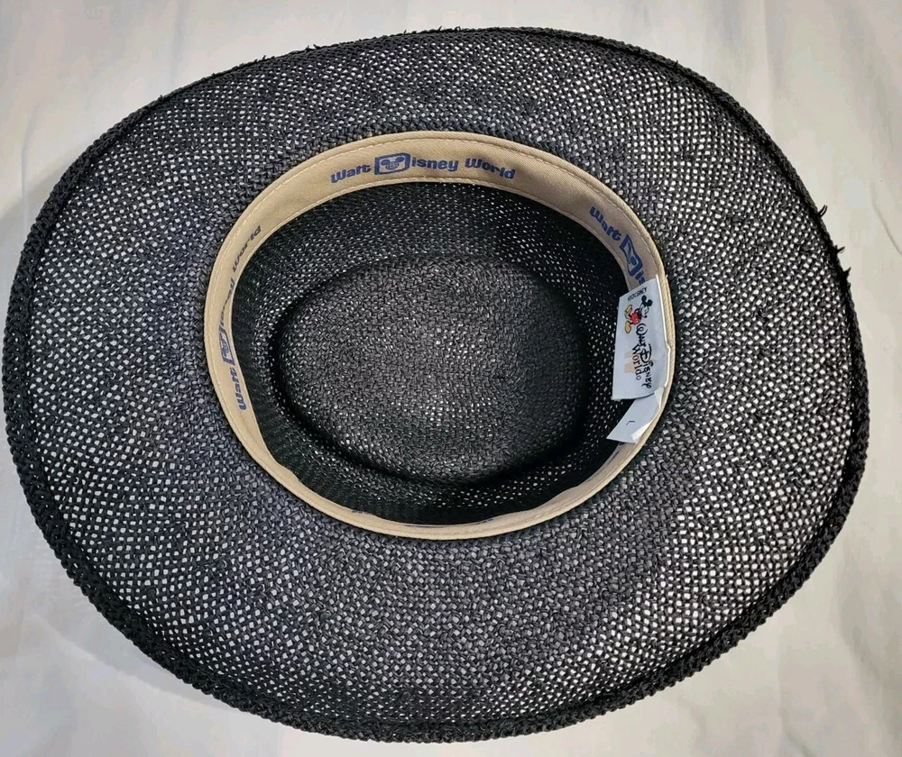 Nide Disney themed hat. Perfect for golfing or a day in the sun. Unique black color stands out from the traditional wheat colored straw hats. Brim is 3 inches wide, crown is 3.5 inches tall. Inside measurements are 7.5 inches front to back and 6.75 inches side to side. Inside band is twill with the Disney labeling along the length of the band. MPN 2443