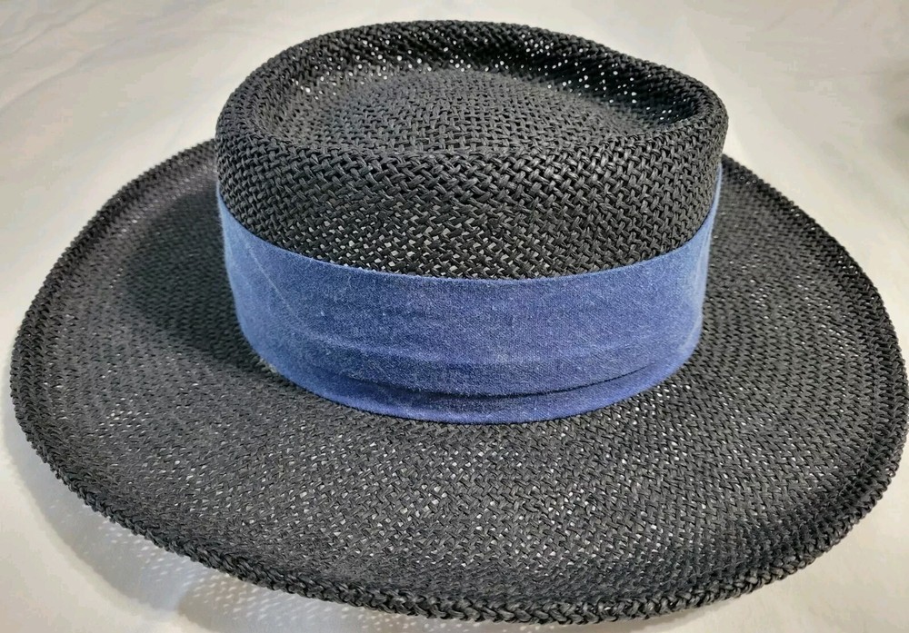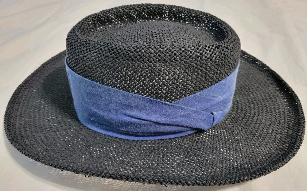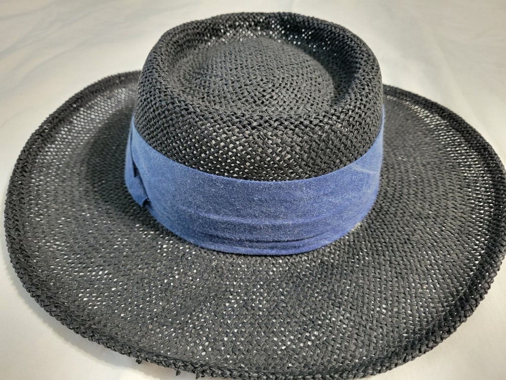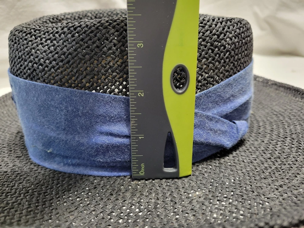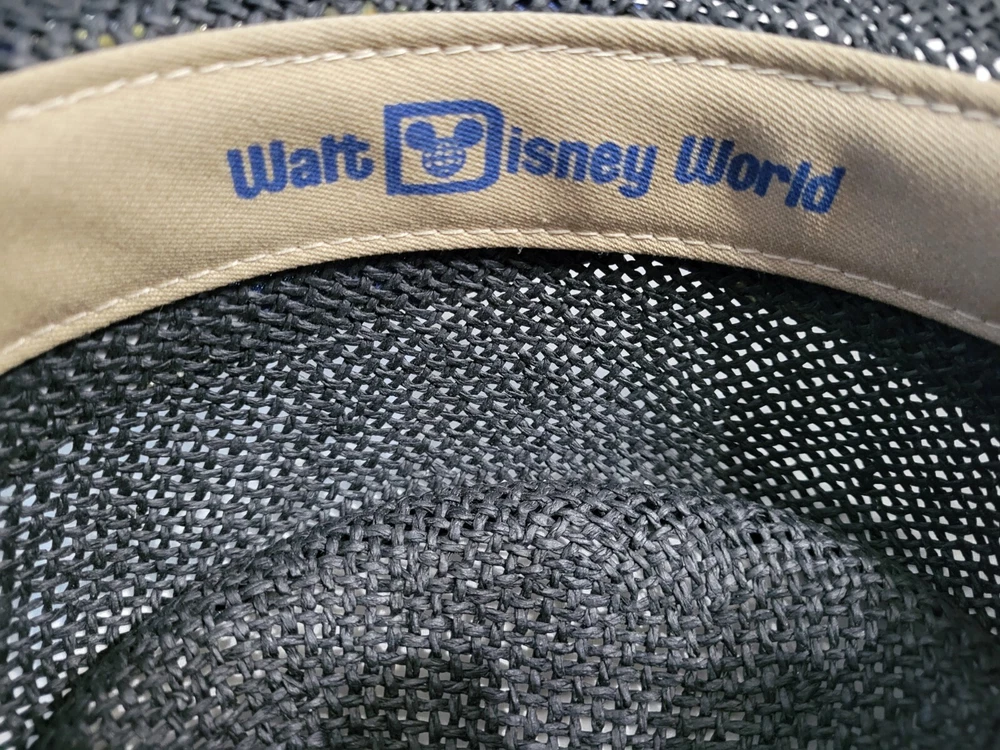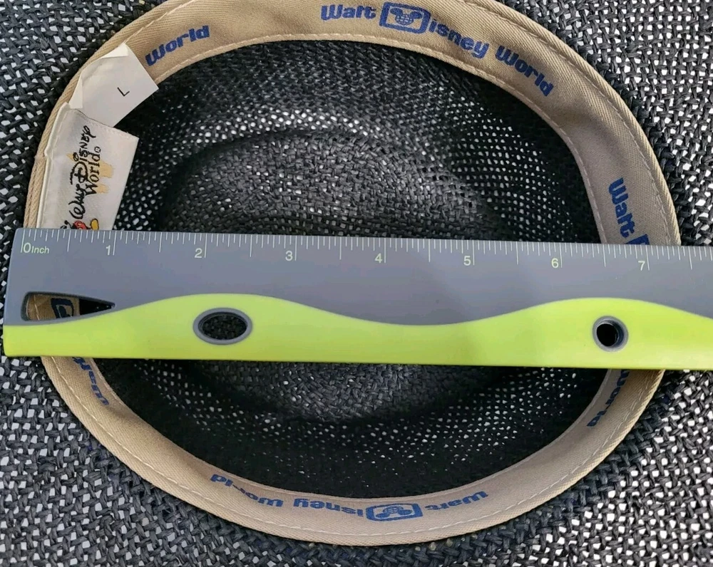 Nide Disney themed hat. Perfect for golfing or a day in the sun. Unique black color stands out from the traditional wheat colored straw hats. Brim is 3 inches wide, crown is 3.5 inches tall. Inside measurements are 7.5 inches front to back and 6.75 inches side to side. Inside band is twill with the Disney labeling along the length of the band. MPN 2443