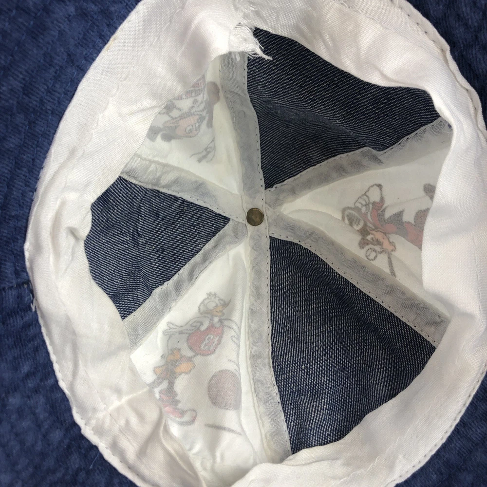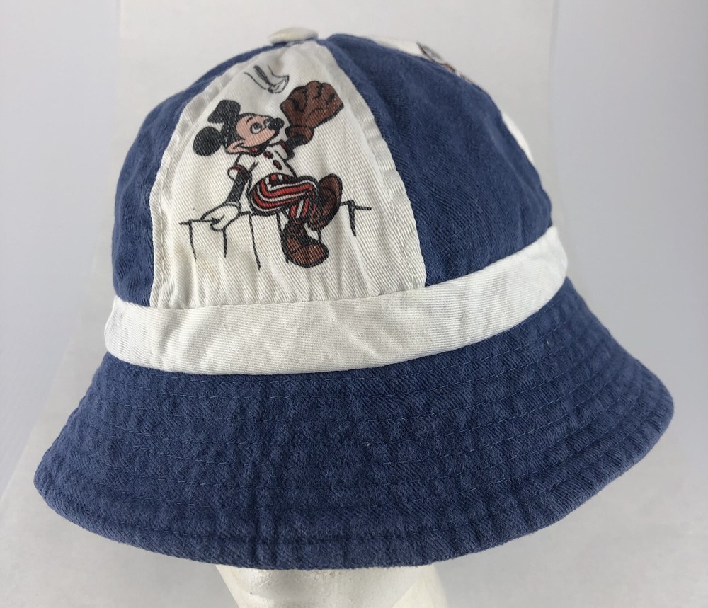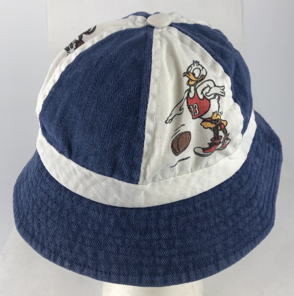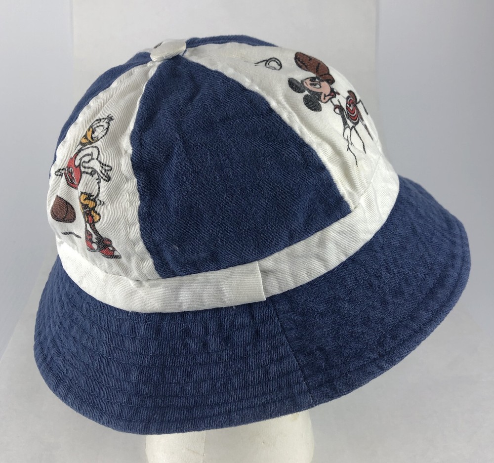 Vintage Walt Disney World Mickey Mouse Bucket Denim Hat Features Mickey Mouse, Donald Duck and Goofy playing different sports. Size: Large ~ 7 3/8. Made in Hong Kong. Please see pictures for details as this is part of my description.