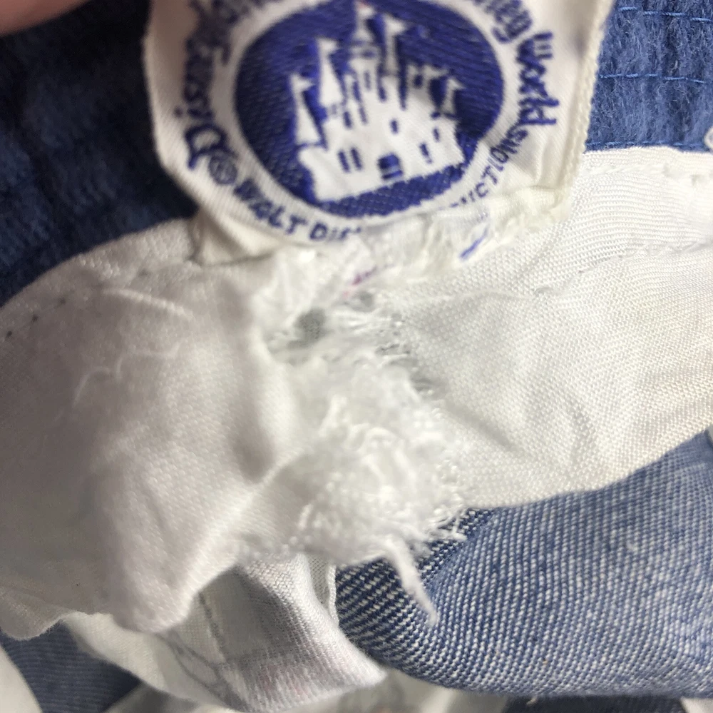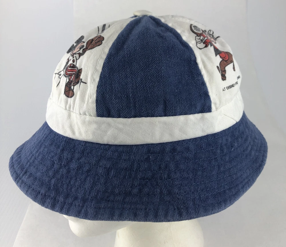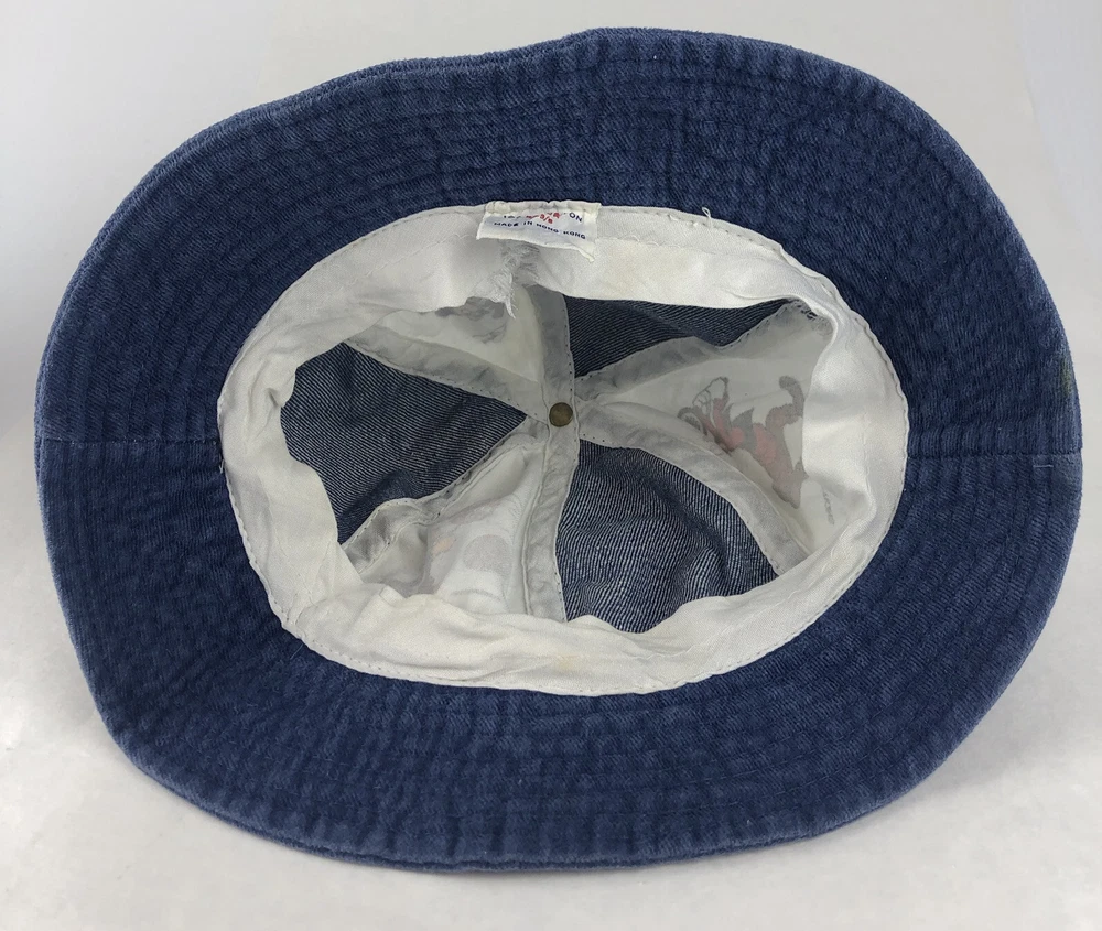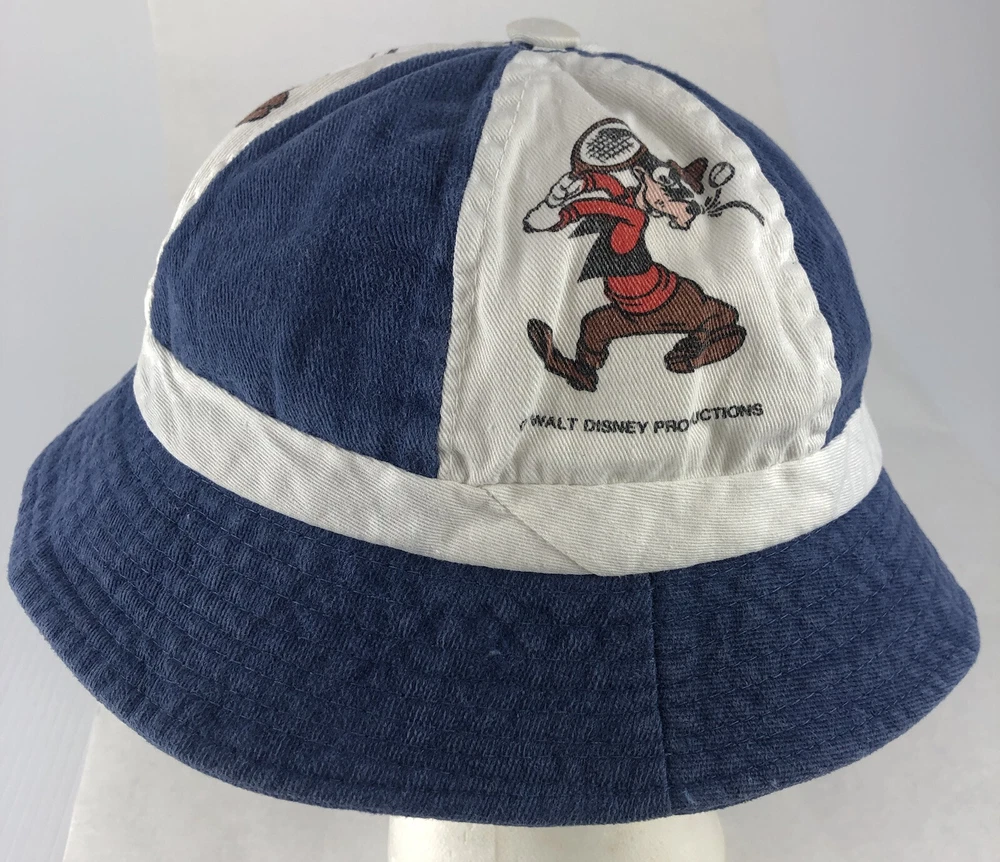 Vintage Walt Disney World Mickey Mouse Bucket Denim Hat Features Mickey Mouse, Donald Duck and Goofy playing different sports. Size: Large ~ 7 3/8. Made in Hong Kong. Please see pictures for details as this is part of my description.