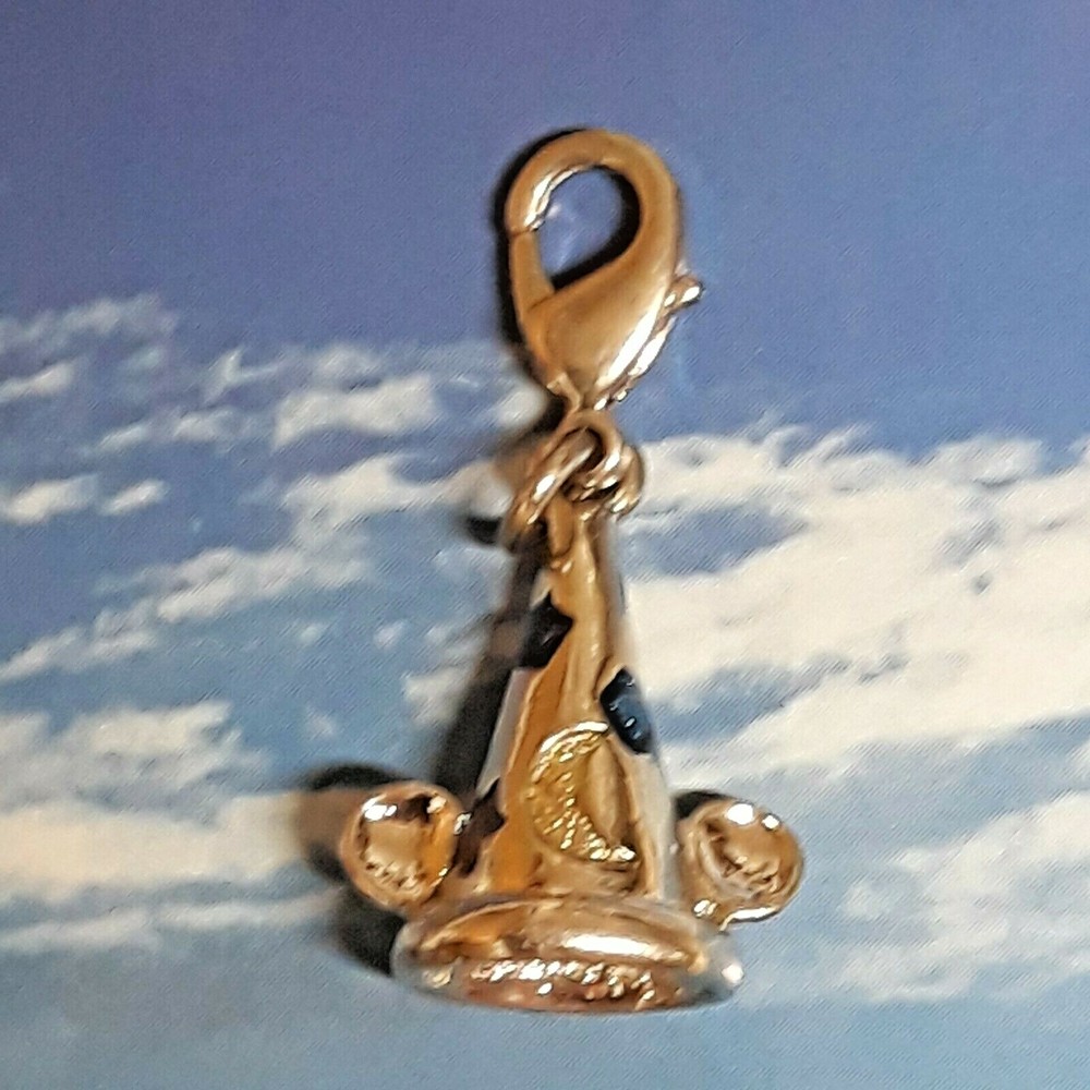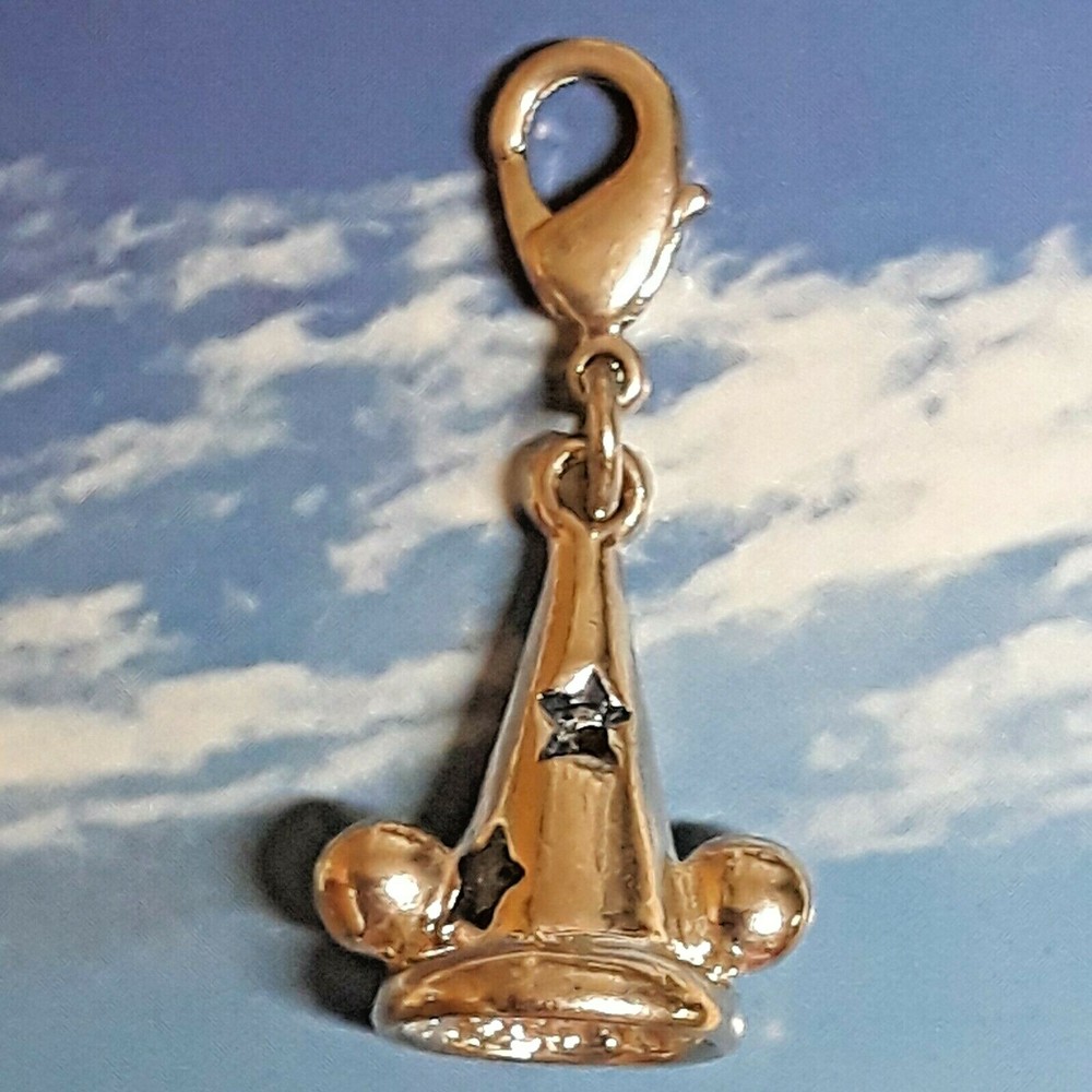 Walt Disney 3D Mickey Mouse Fantasia Sorcerer hat clip o charm. Silver tone lobster claw clasp for easy attachment. In very nice pre-owned condition. We are in no way experts and only try to describe each item to the best of our ability. We acquire these items from estate finds and antique shops. They come to us as used items and that is how we pass them on. Please look at the photos to fully appreciate and make your decision. All sales are final. We do not offer returns or refunds. (LJ-250)