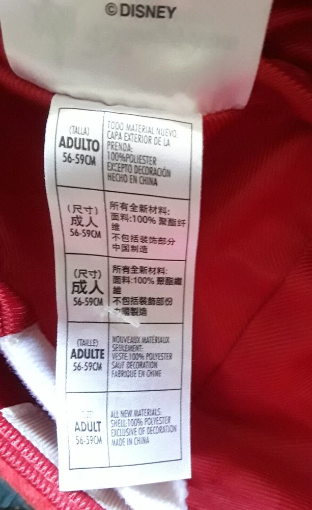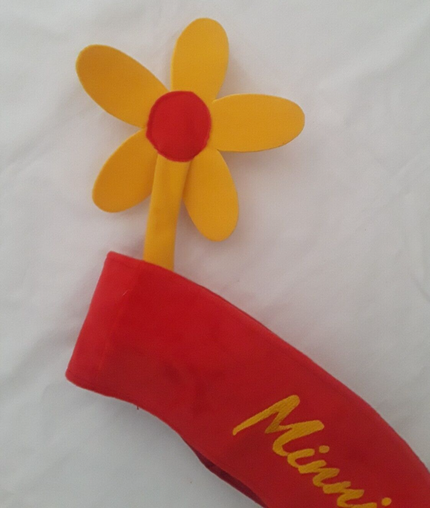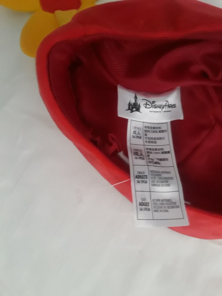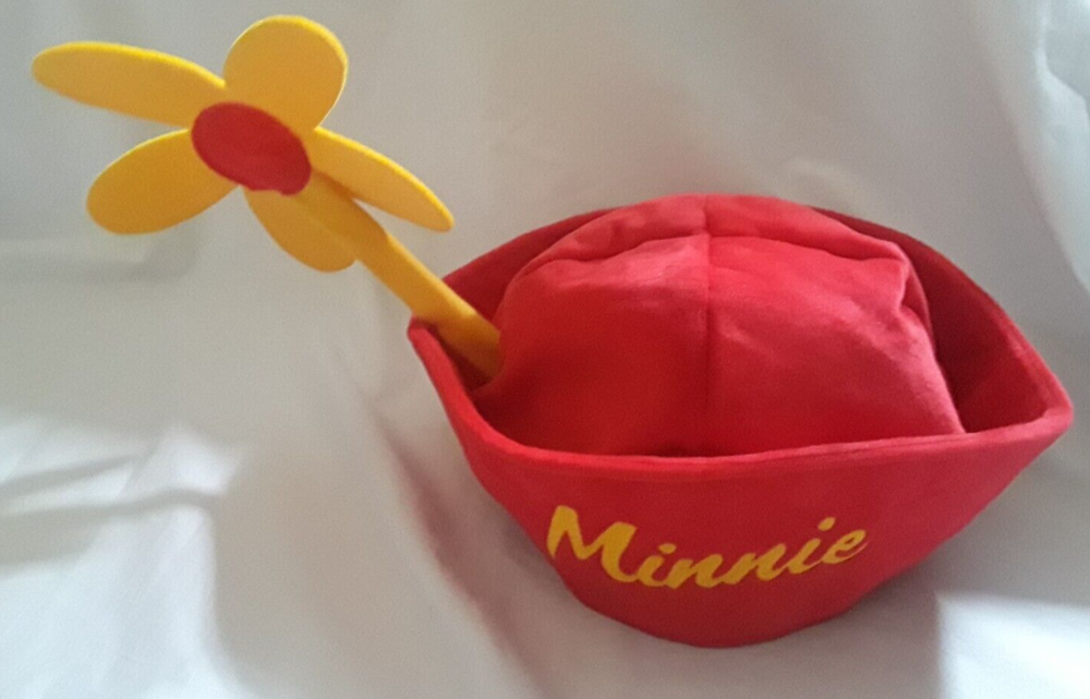 Walt Disney World Minnie Mouse Hat Flower Red Velvet Cap Adult ( 56-59 cm). Shell is made of 100% polyester. Flower feels like it is made of a heavy feltlike material. Measurements are: Side to Side- 11" and Height ( excluding flower)--7". In excellent used condition. Shipped with USPS Ground Advantage Mail.