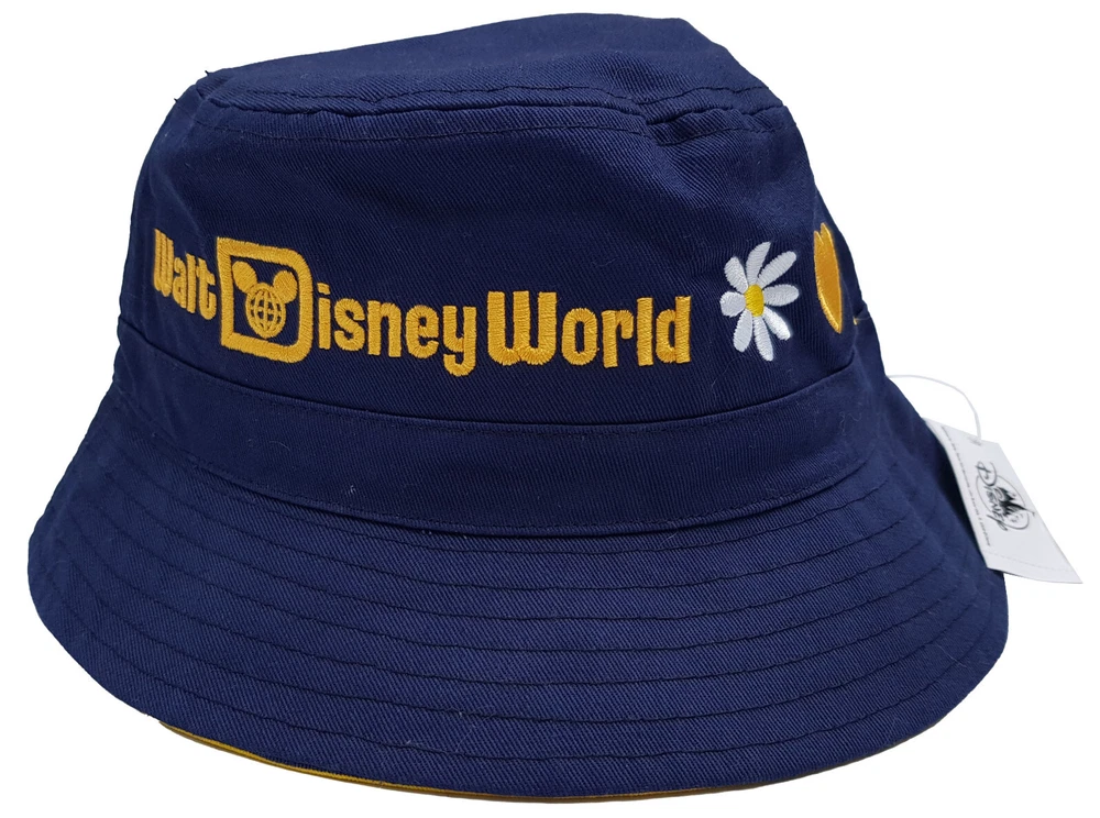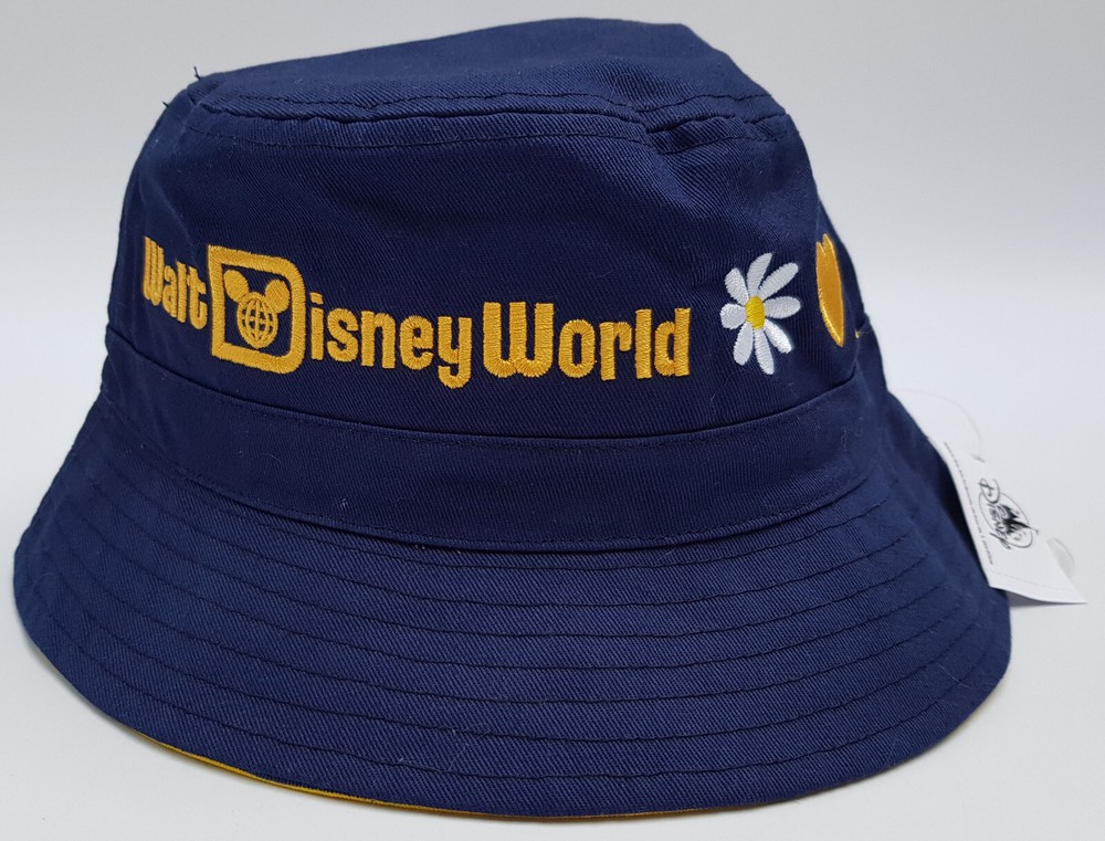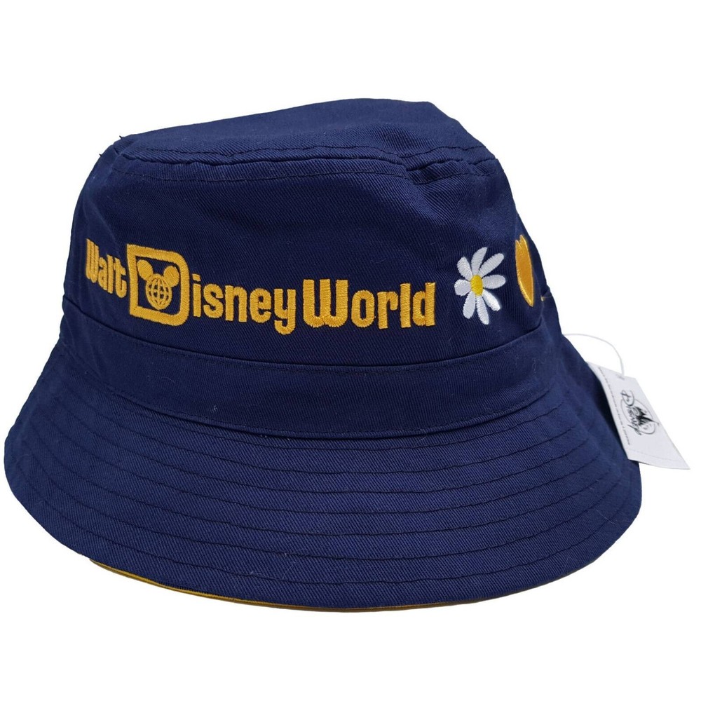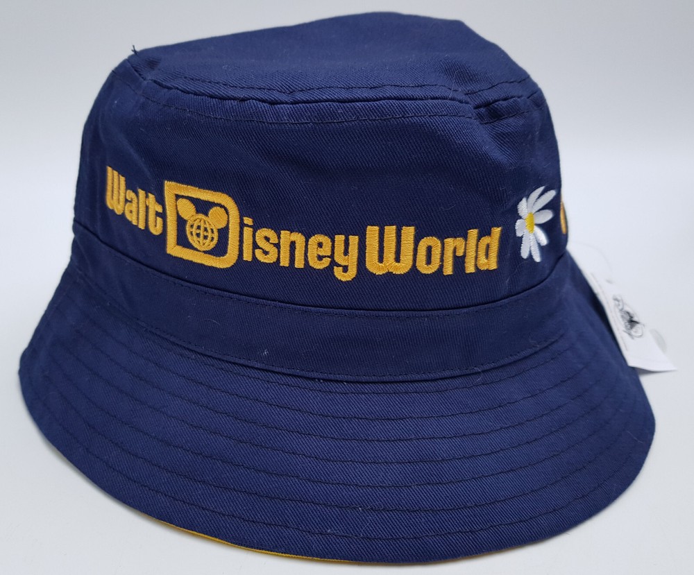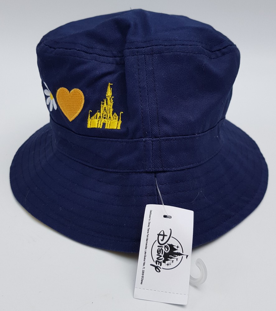 New and tagged - Bucket hat for adults. From Walt Disney World. Navy blue fabric hat. Embroidered text to the front - 'Walt Disney World' Includes embroidered Daisy, Heart and Castle Inside the brim is lined with stripy yellow fabric. Not reversible. 100% cotton - excluding trims. Hat size not adjustable.