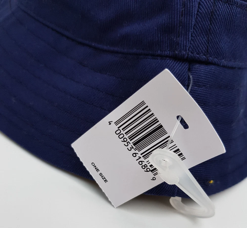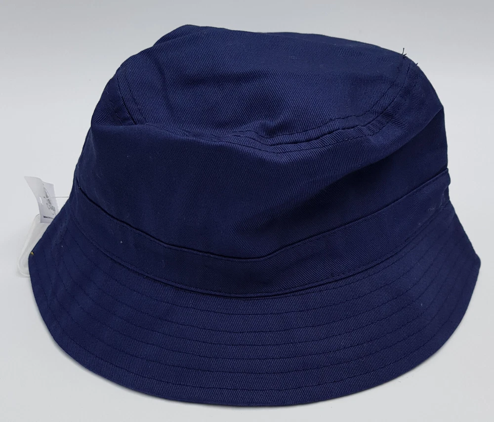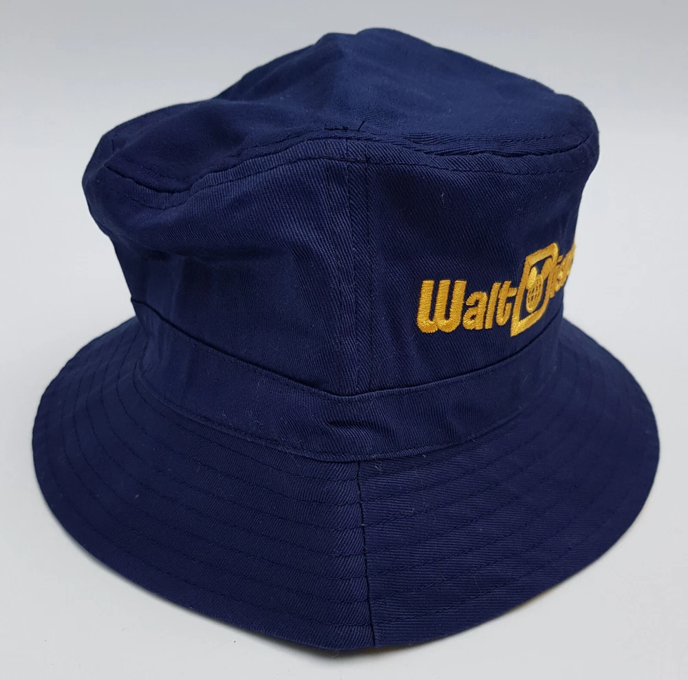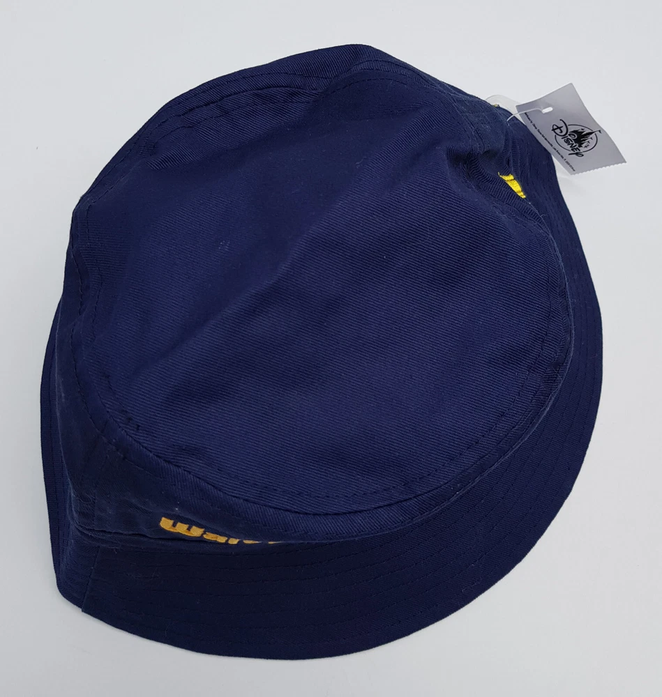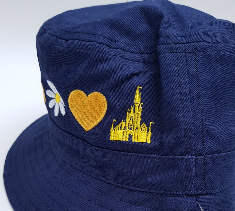 New and tagged - Bucket hat for adults. From Walt Disney World. Navy blue fabric hat. Embroidered text to the front - 'Walt Disney World' Includes embroidered Daisy, Heart and Castle Inside the brim is lined with stripy yellow fabric. Not reversible. 100% cotton - excluding trims. Hat size not adjustable.
