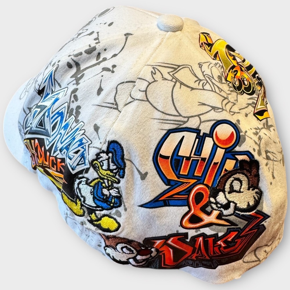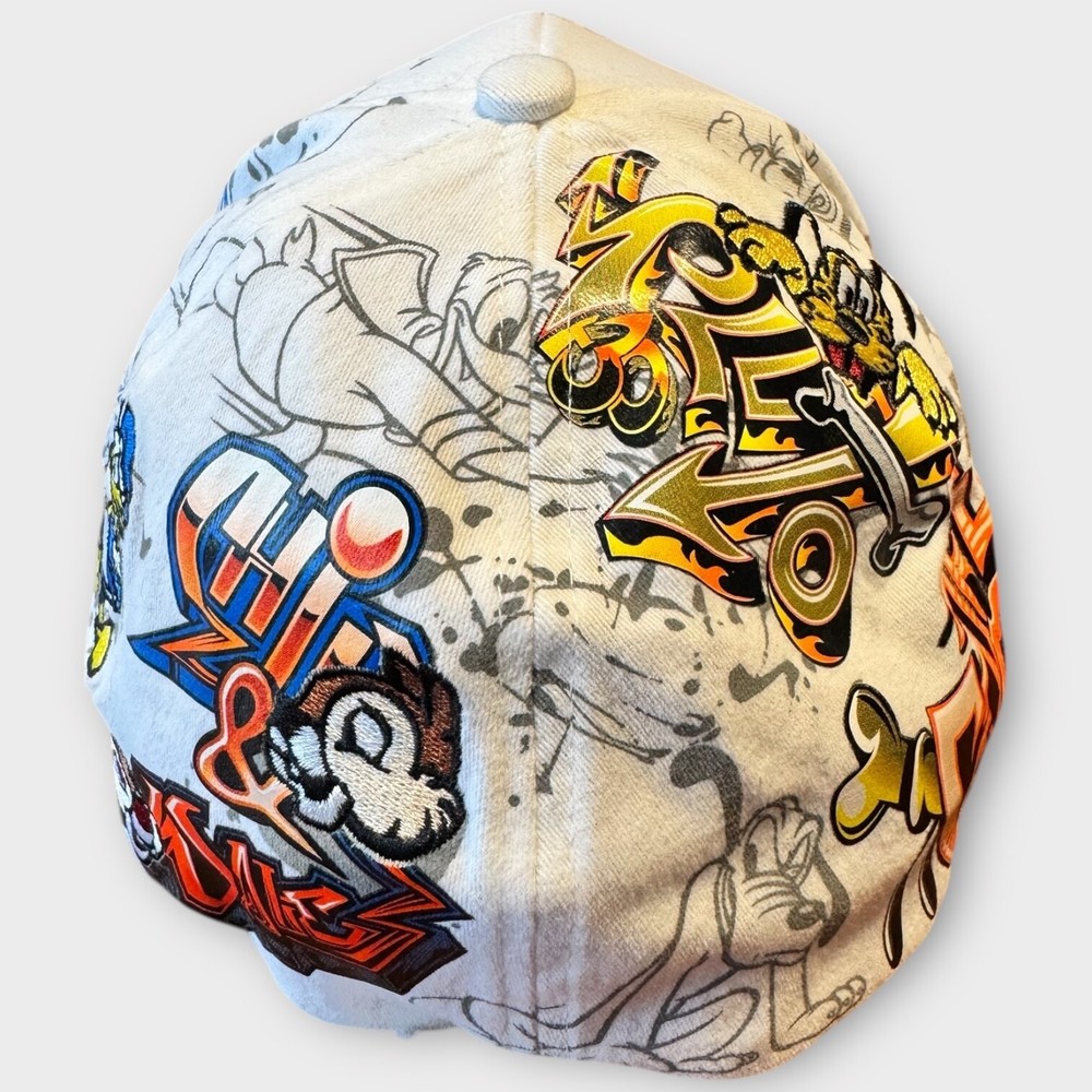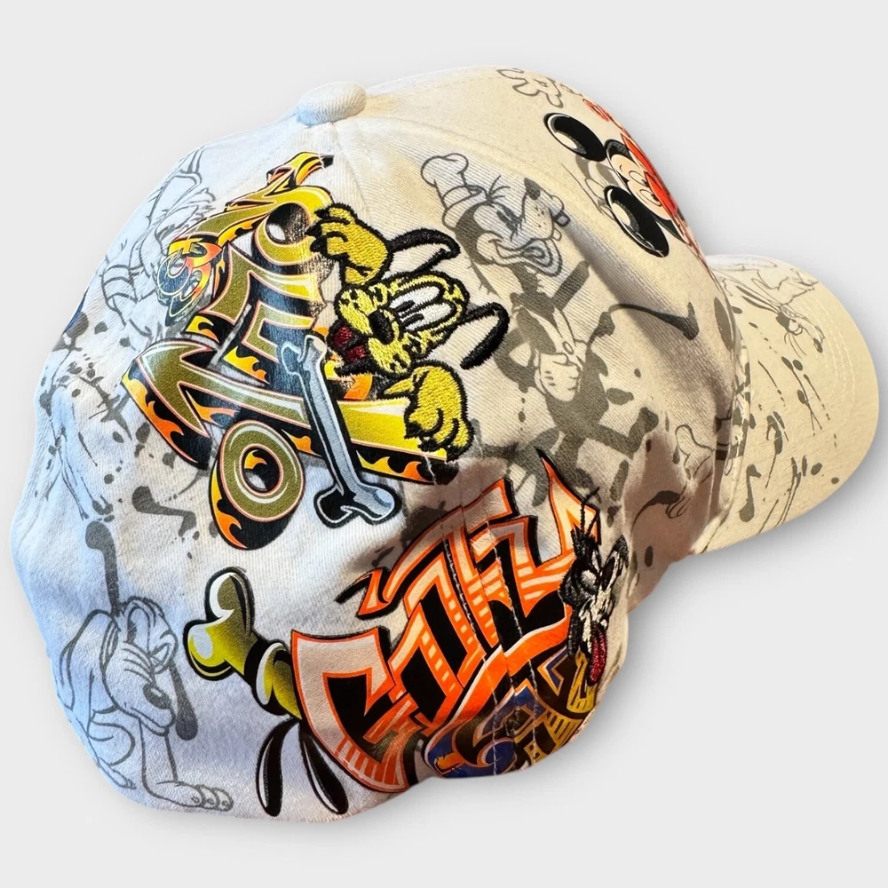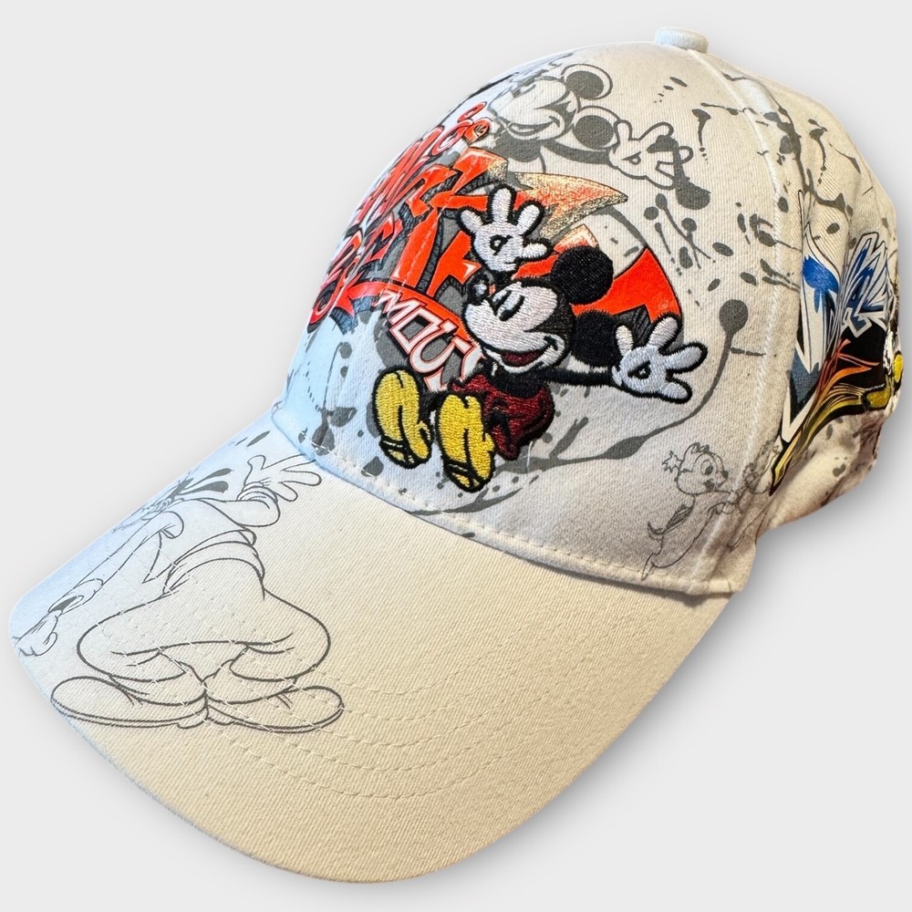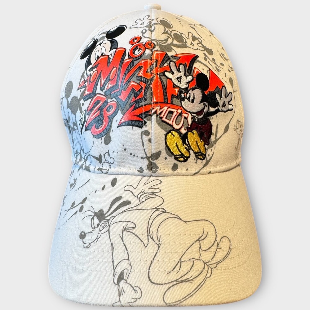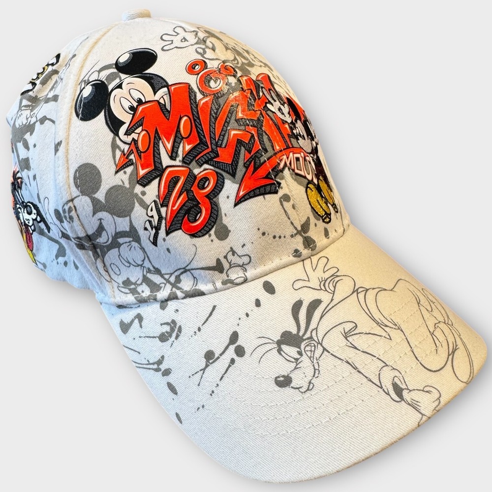 This product is a rare Walt Disney World Parks Mickey Mouse Graffiti Cap Hat for adults, featuring iconic Disney characters such as Mickey Mouse, Pluto, and Goofy. The white hat is part of the Disney franchise and is suitable for both men and women. Perfect for fans of Disney Parks or collectors of Disneyana, this unique item represents a fun and nostalgic addition to any casual outfit.