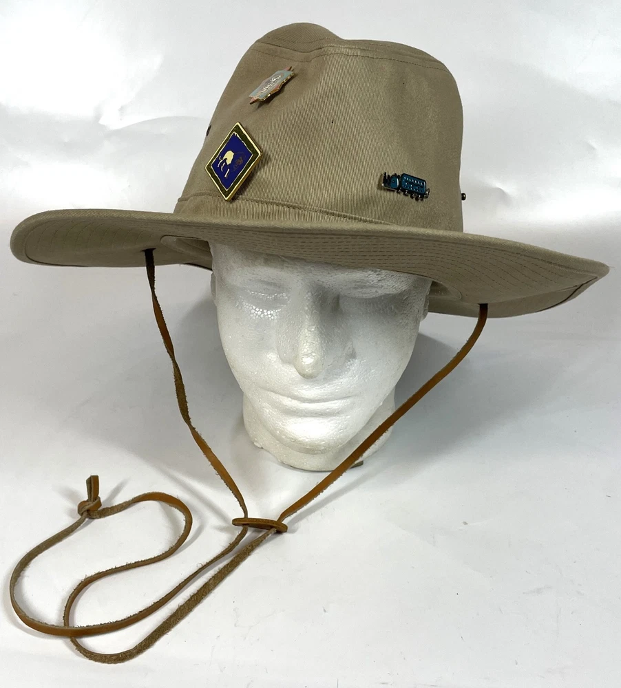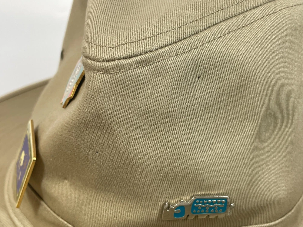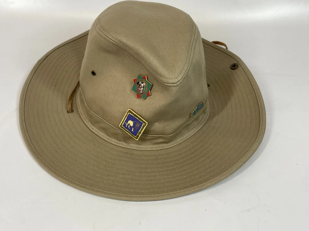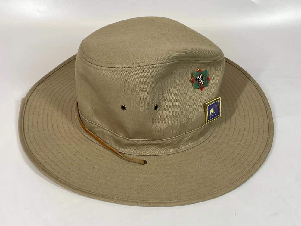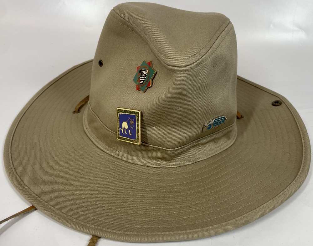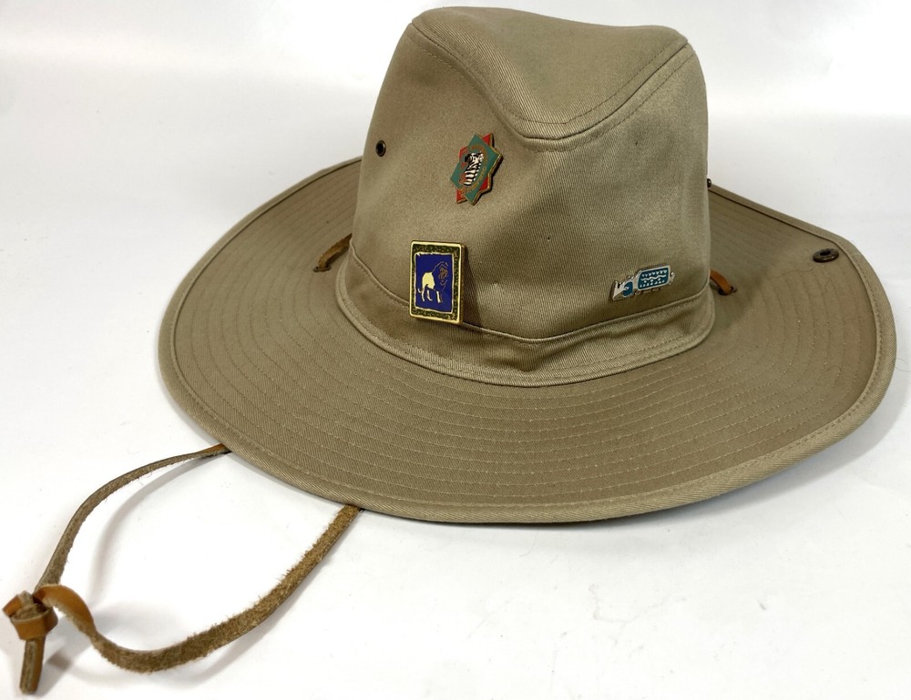 Walt Disney World Parks Tan Canvas Safari Hat w/ Wild Kingdom Serengeti Pins" Nice Used Condition as Pictured. Some small holes where it looks like some other pins were, They will close up with wear. No real stains or rips. SEE PHOTOS Please study High Definition Zoomable photos. You will receive the EXACT item(s) in photos and only item(s) in photos, unless otherwise specified. Please review all photos BEFORE purchase or sending a question. I try to answer all questions (measurements) in the photos.