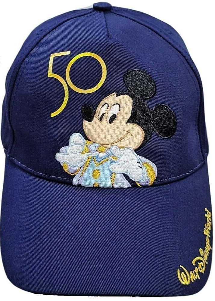 Authentic Disney Park Merchandise New with tags Celebrate 50 years of The Most Magical Place on Earth with this adorable Mickey Mouse hat for kids. The hat features a fun embroidered Mickey and Walt Disney World logo and a printed iridescent 50. Embroidered Mickey graphic and printed iridescent 50 on front Embroidered Walt Disney World logo on brim 100% cotton exclusive of decoration Self stick fabric adjustable back One size fits most youth