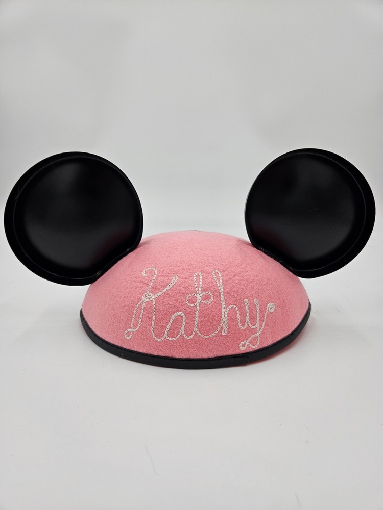 Walt Disney World theme park Souvenir Pink Minnie Mouse Mickey Ears Felt Hat Beanie personalized Embroidered "Kathy" There is no elastic string.