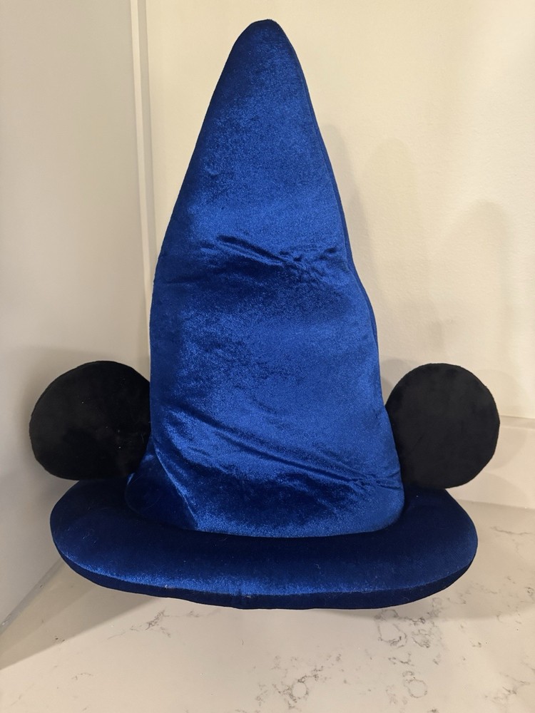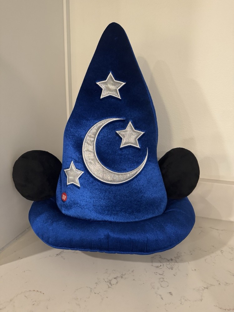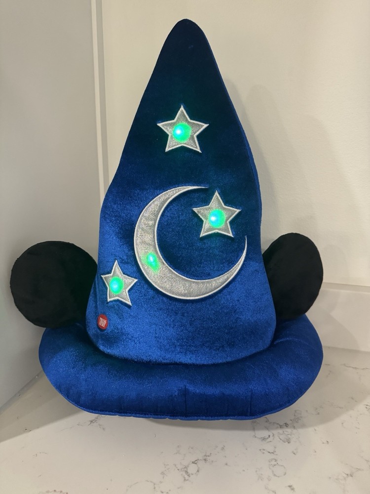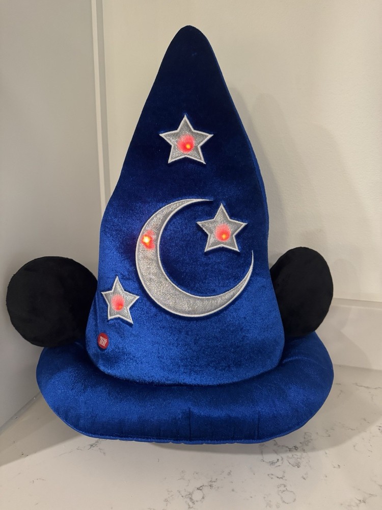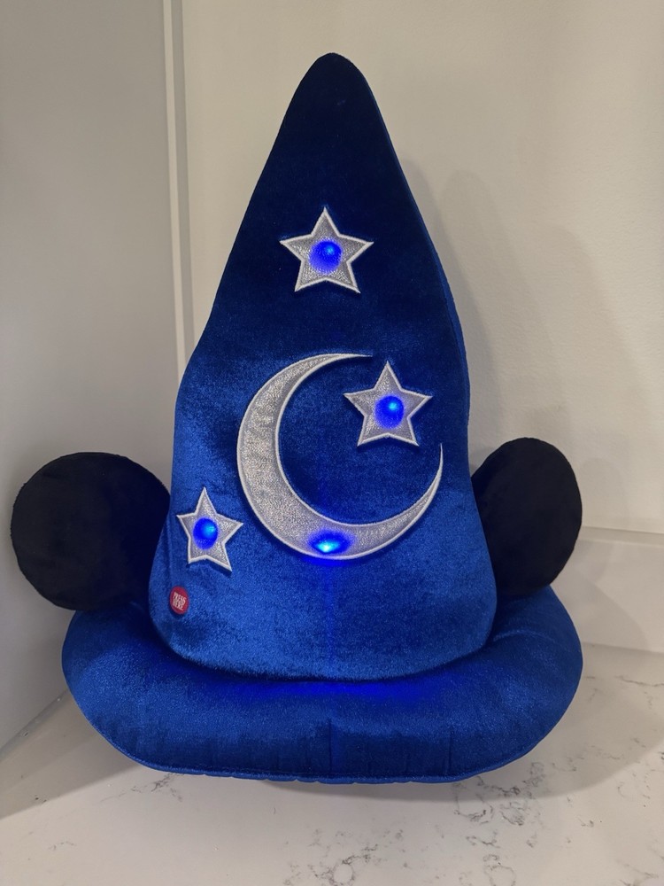 Step into the magical world of Disney with this enchanting Sorcerer Mickey Light Up Hat, inspired by the iconic Fantasia film. A true treasure for Disney enthusiasts, this hat features a vibrant blue hue that's sure to stand out in any crowd, while the one-size-fits-all design ensures a comfortable fit for all ages. This was worn by a child but also fits adults. Crafted with attention to detail, the hat showcases Mickey Mouse in his classic sorcerer pose, bringing a touch of Hollywood Studios' charm to your wardrobe. Perfect for fans of the franchise or anyone looking to add a little Disney magic to their collection, this unisex accessory is a delightful nod to the beloved character and the timeless story of Fantasia.